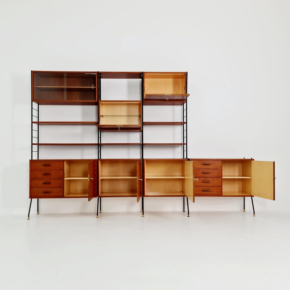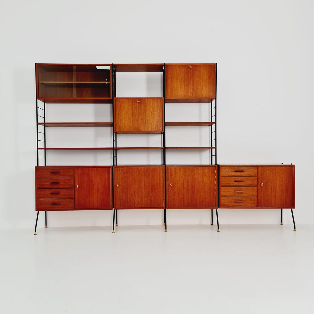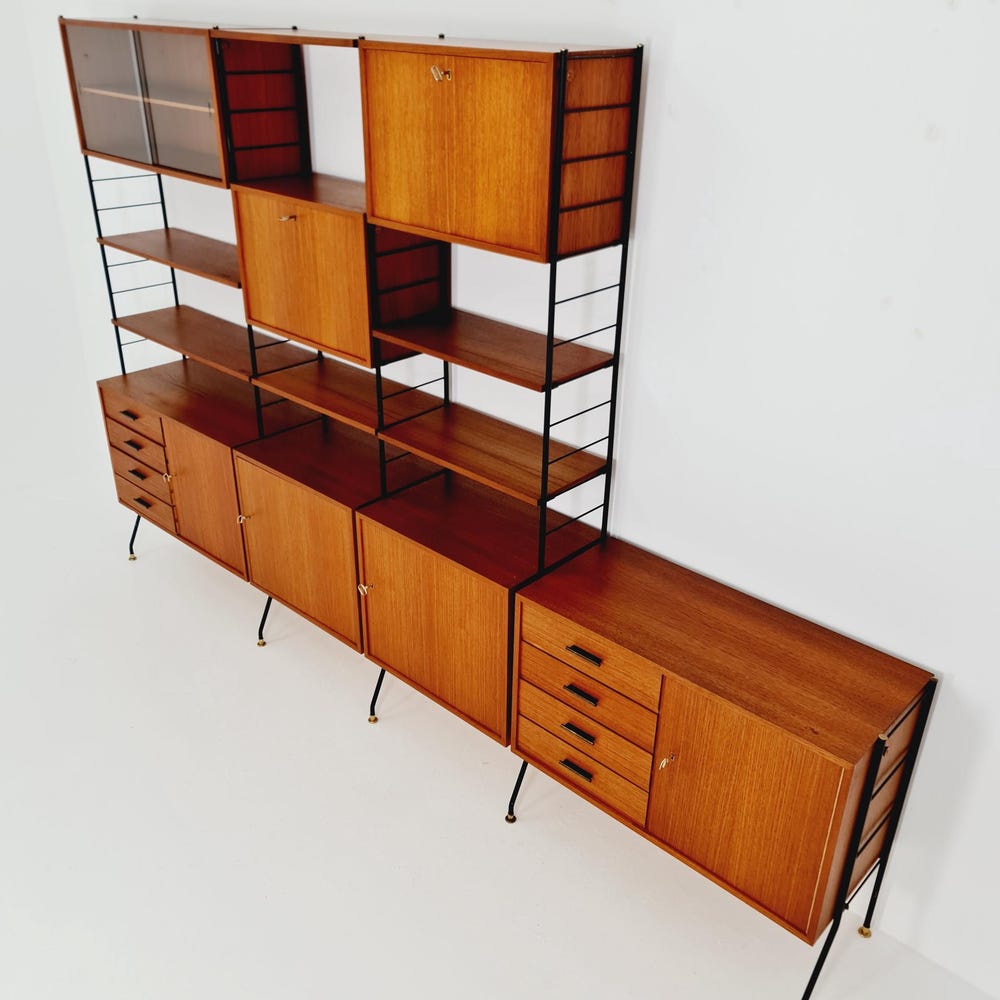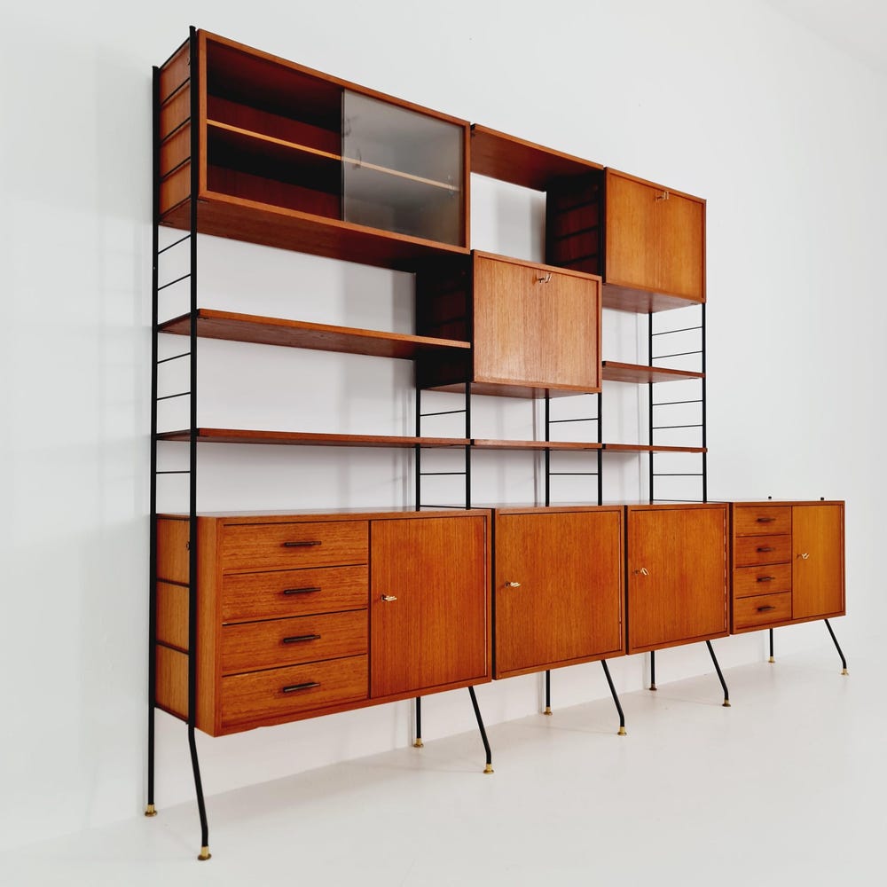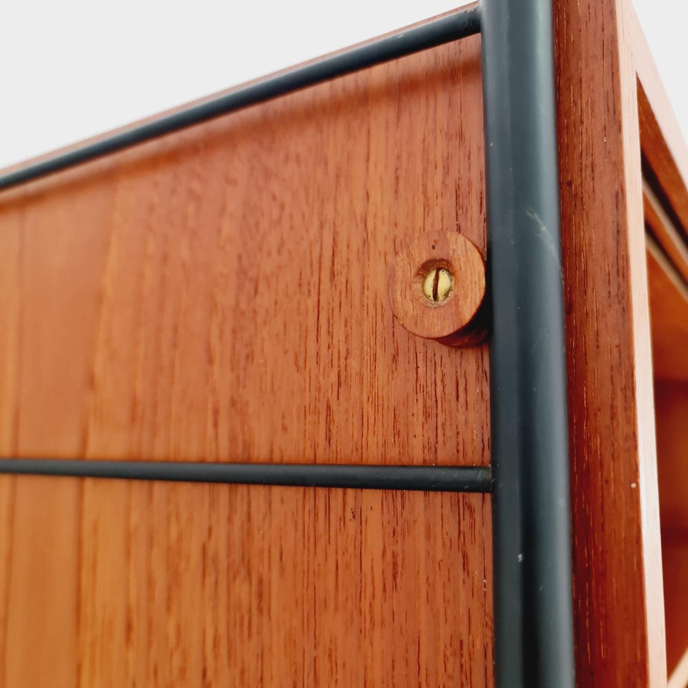 Freestanding string shelf-system unit bookcase teak & metal by Silverschild Germany, 1950s