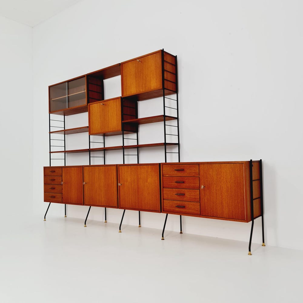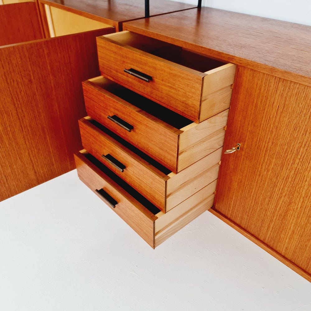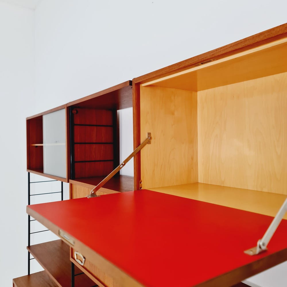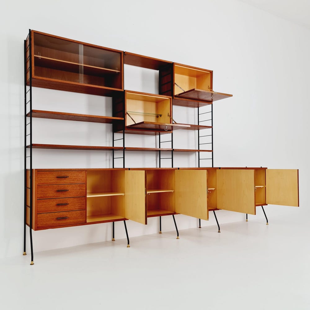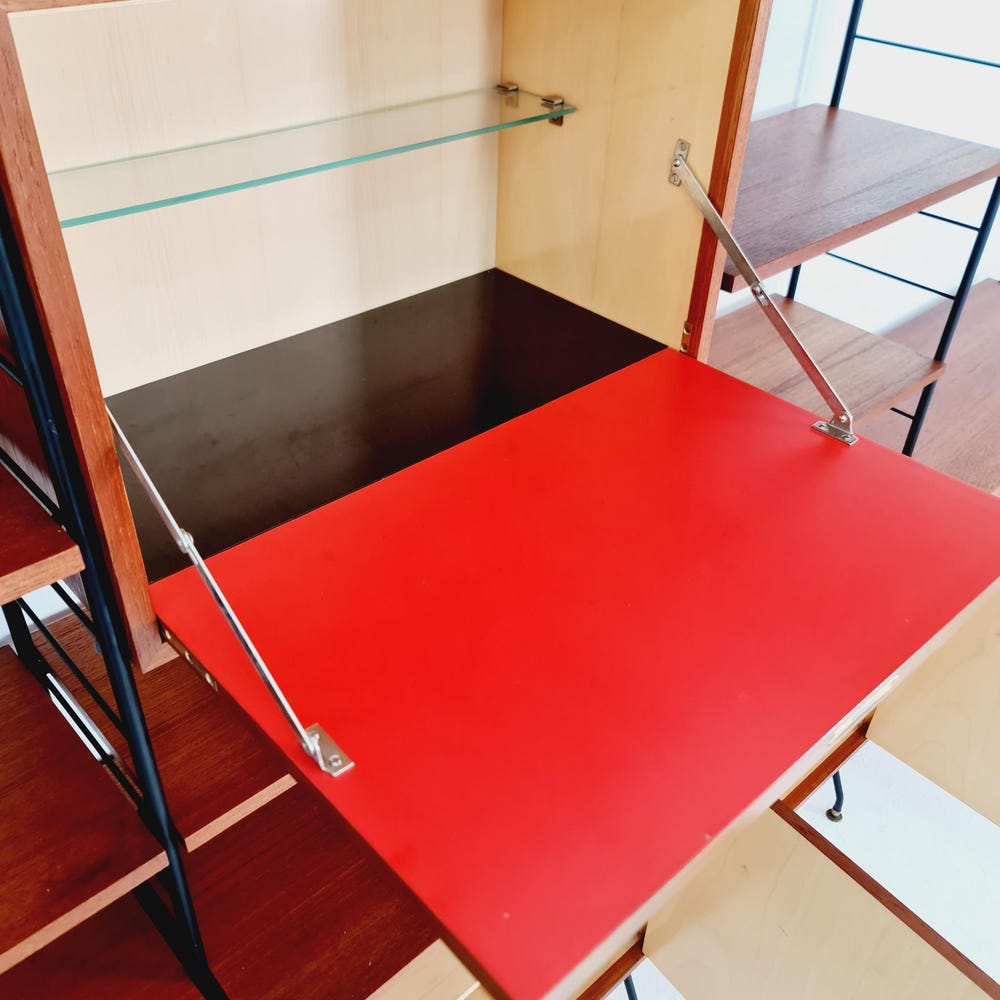 Freestanding string shelf-system unit bookcase teak & metal by Silverschild Germany, 1950s