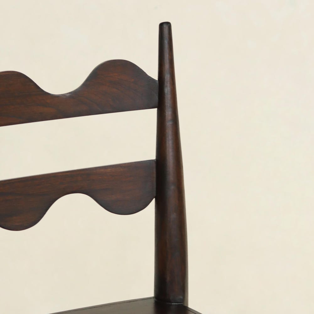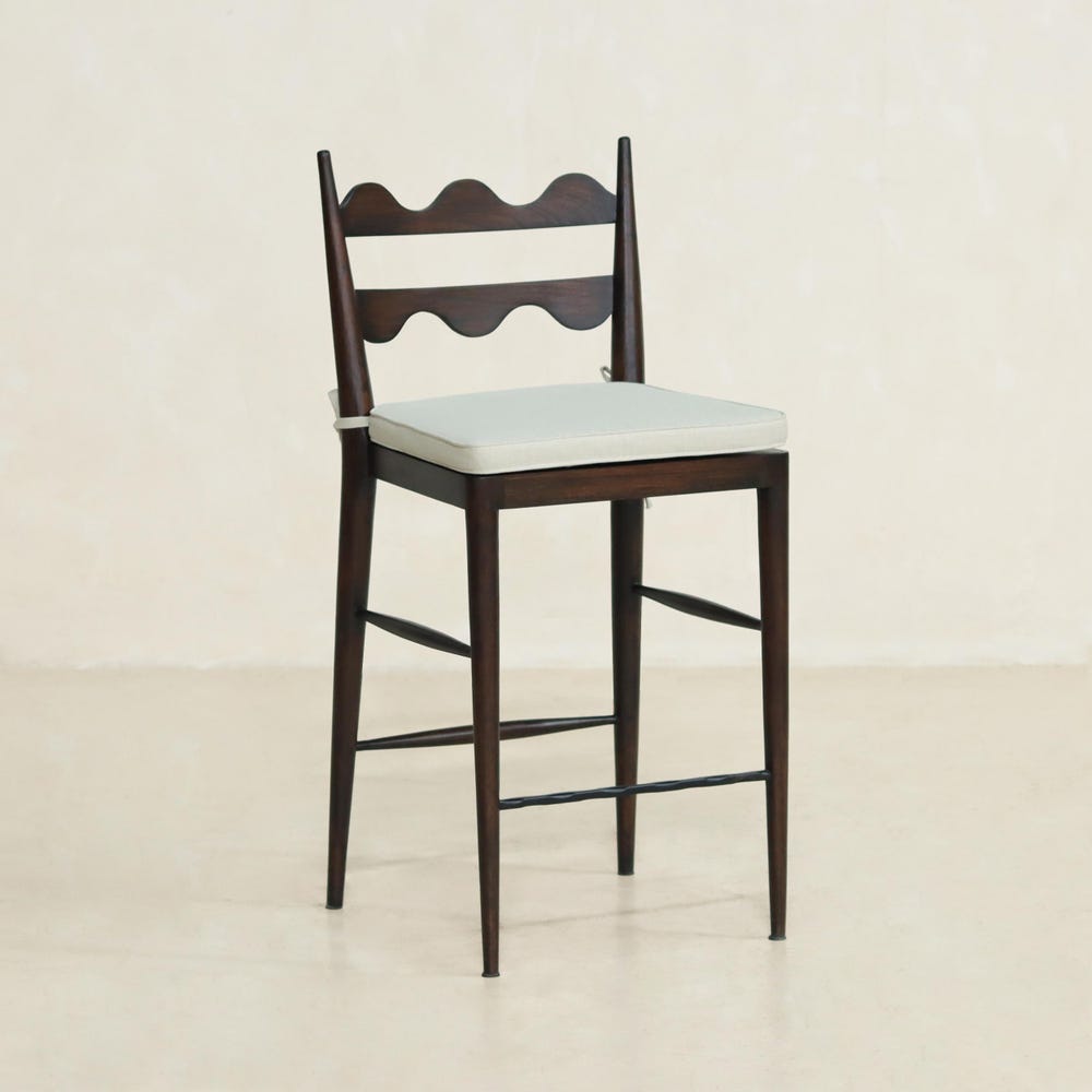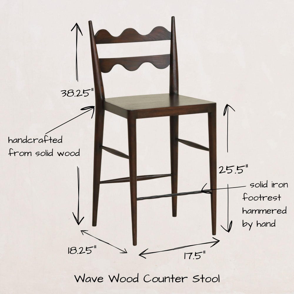 Introducing the TreeHause Wave Counter Stool, where artistry meets functionality. The signature wavy ladder-back design with dual horizontal slats creates an immediate visual impact, while clean, tapered legs add architectural elegance. Meticulously handcrafted by skilled artisans using premium wood, each chair is a testament to superior craftsmanship. The rich dark finish highlights the natural grain, making every piece uniquely beautiful. With its solid wooden seat and sophisticated silhouette, this chair transforms any space into a design statement.
