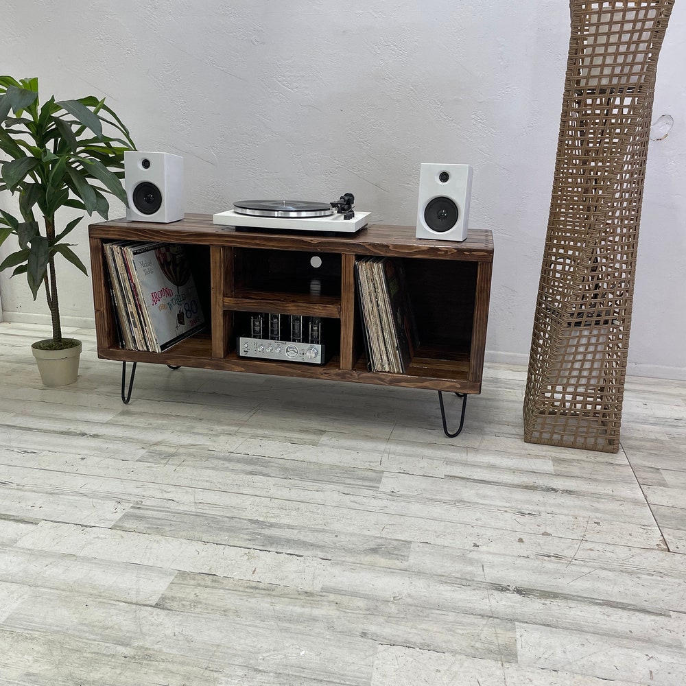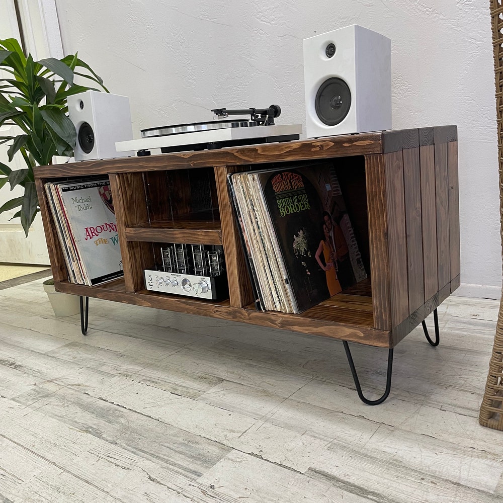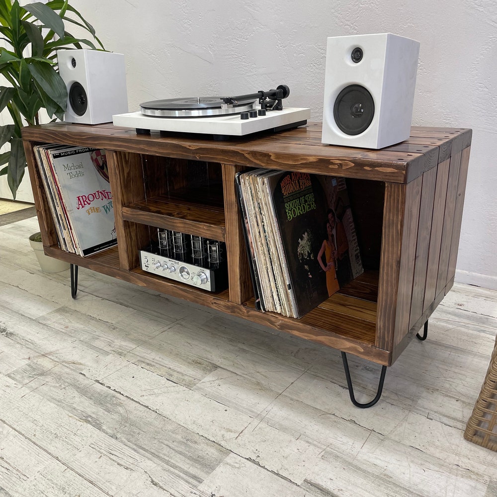 Real Solid Wood Furniture, rustic meets mid century modern, with our beautiful & durable Vinyl Record Storage Furniture and Multi Media Consoles. The center shelf comes standard or can be modified to fit your unique space.