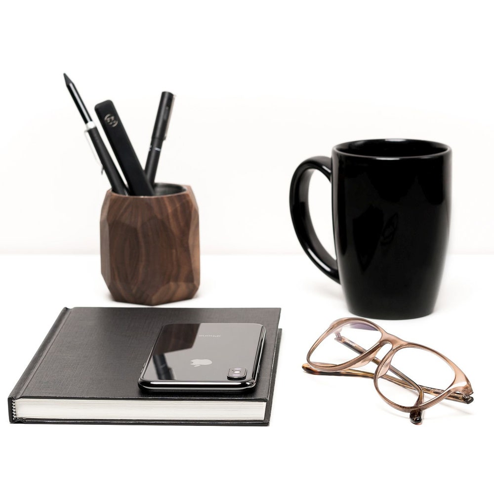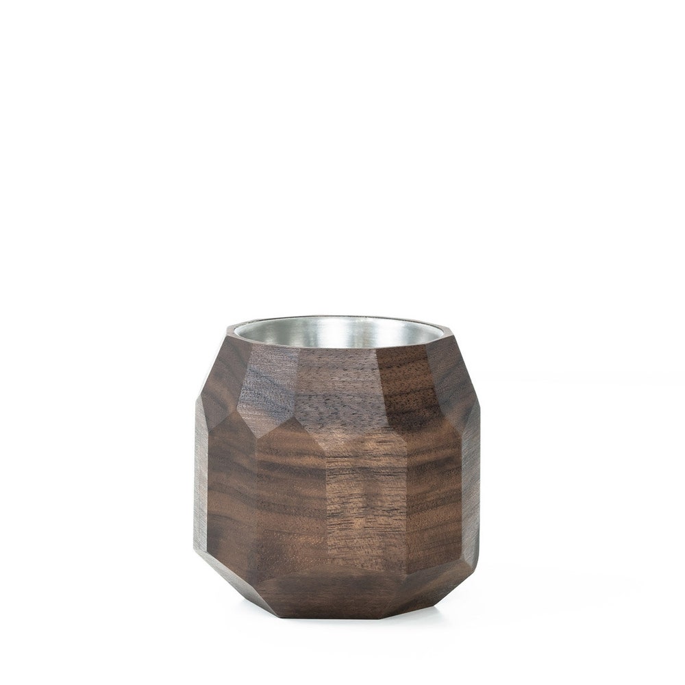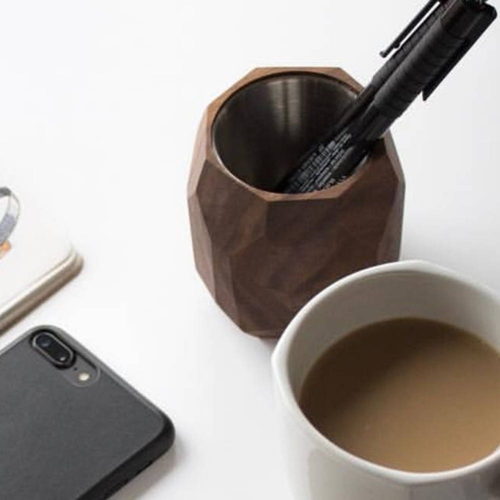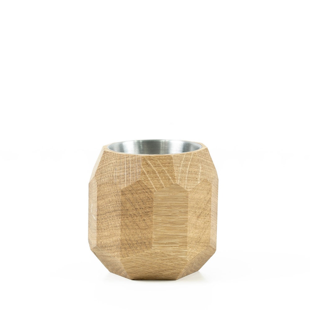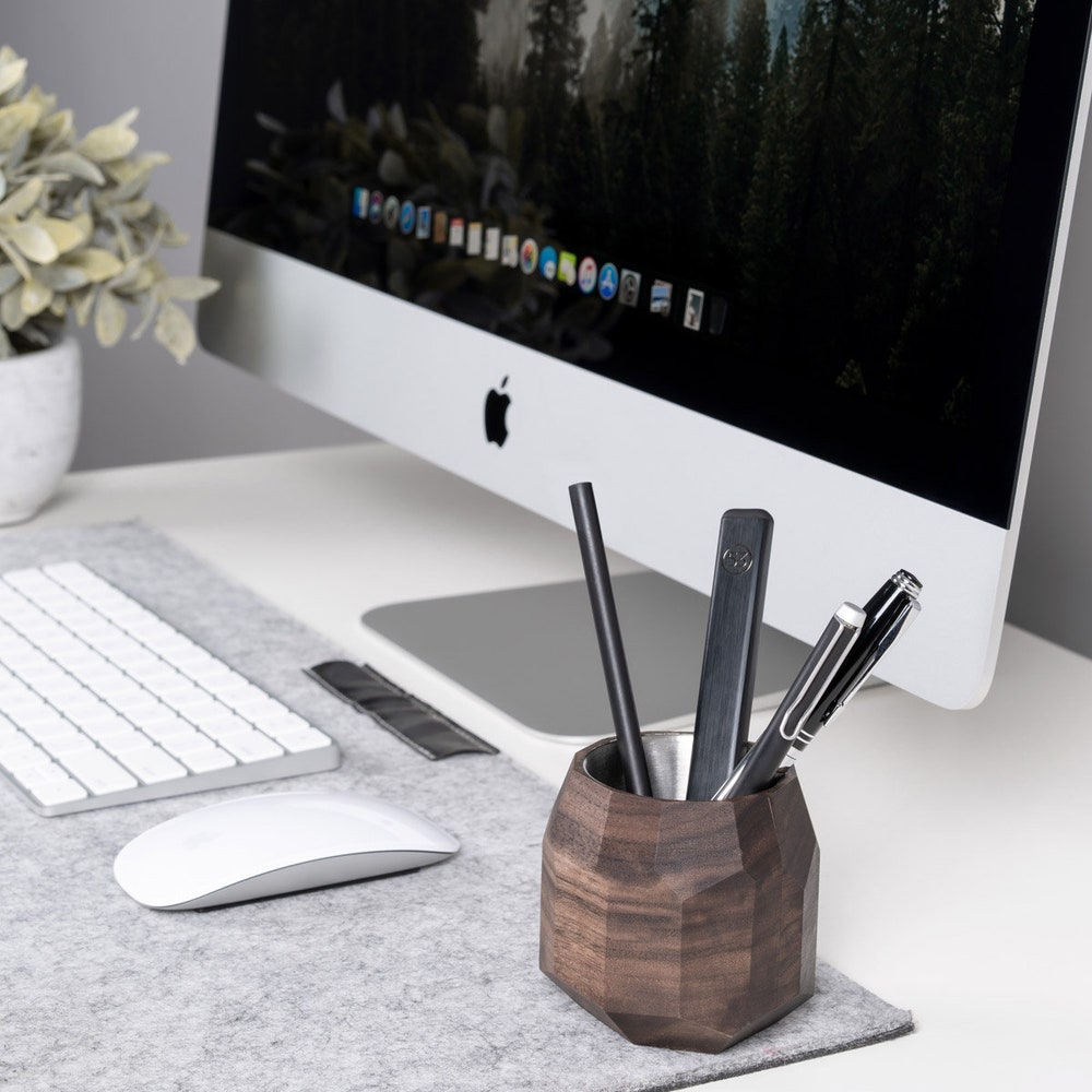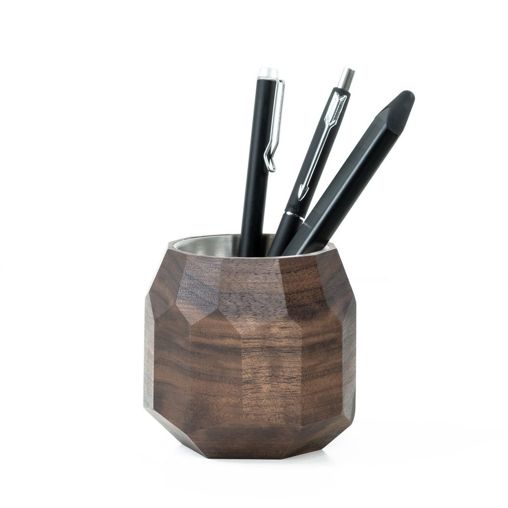 Organic and geometric in shape, this wooden pot is a minimalist pen cup handcrafted from solid wood. Aesthetically appealing pot perfect for storing your pens or pencils and decorating your desk or table. Each wooden cup is crafted from real wood and hand-shaped to attain a faceted geometric look, an aluminum pot is attached inside to ensure protection against water and complement the look.