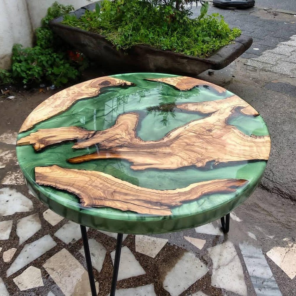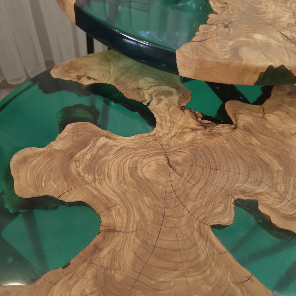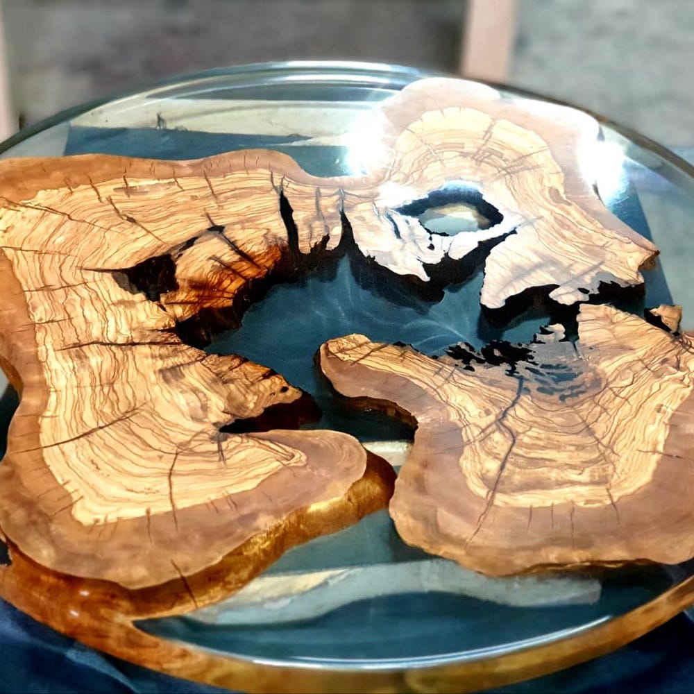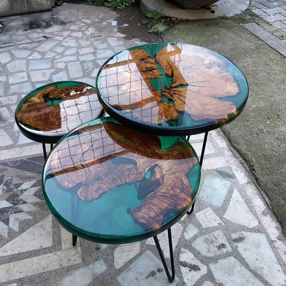 The coffee table set in the picture is made with olive slices and epoxy filling.