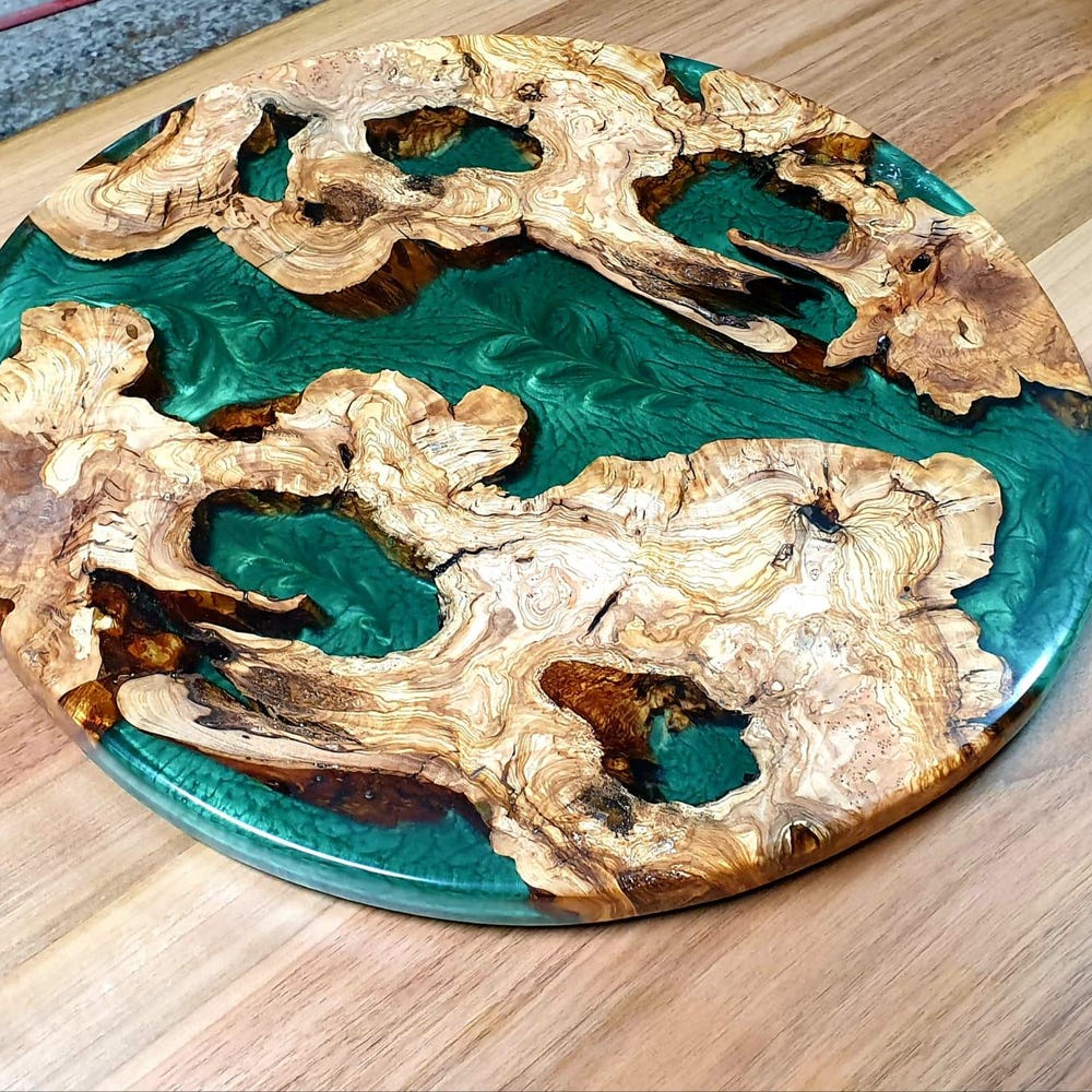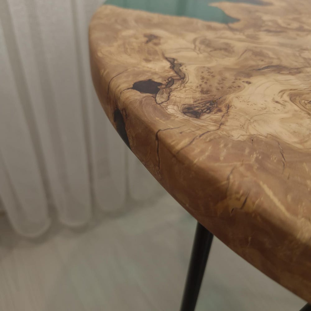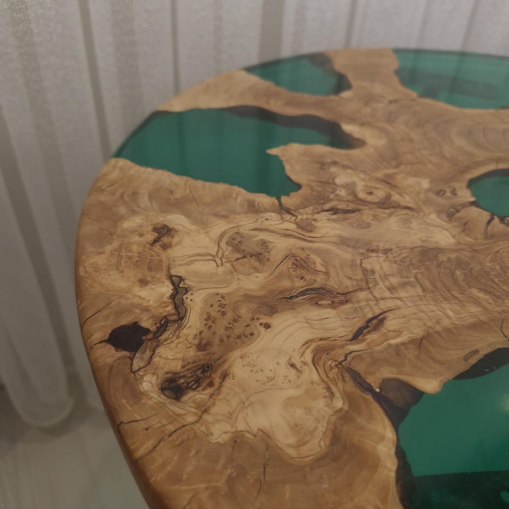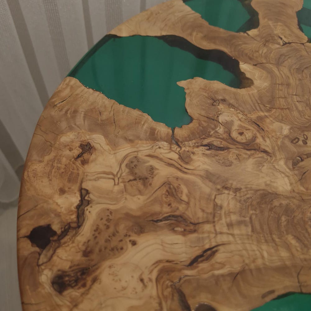The coffee table set in the picture is made with olive slices and epoxy filling.