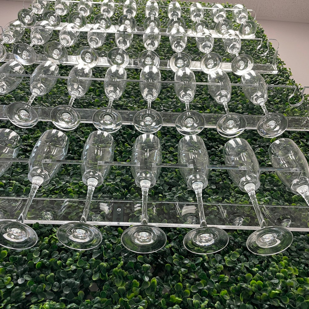 Greenery champagne wall, Grass drink Wall, Wedding decorations | Clear shelf glass holder | treat wall
