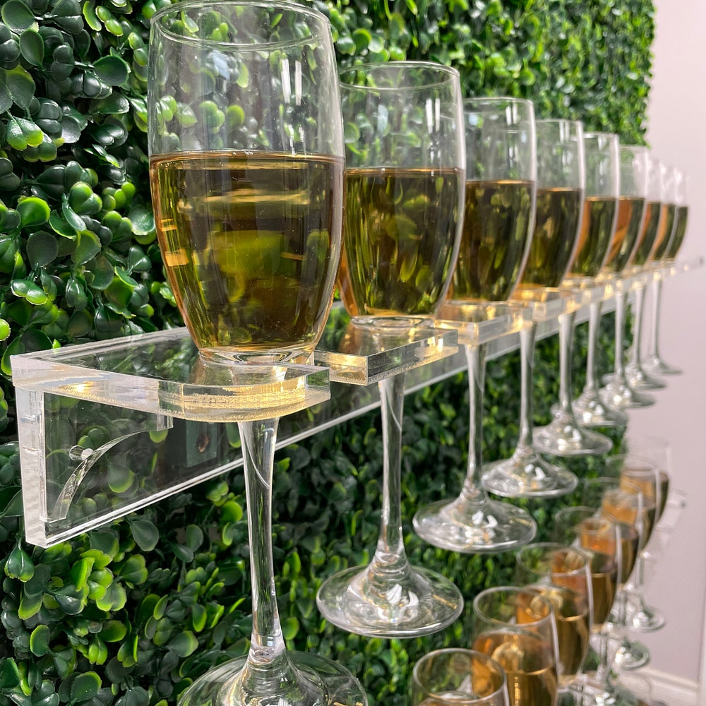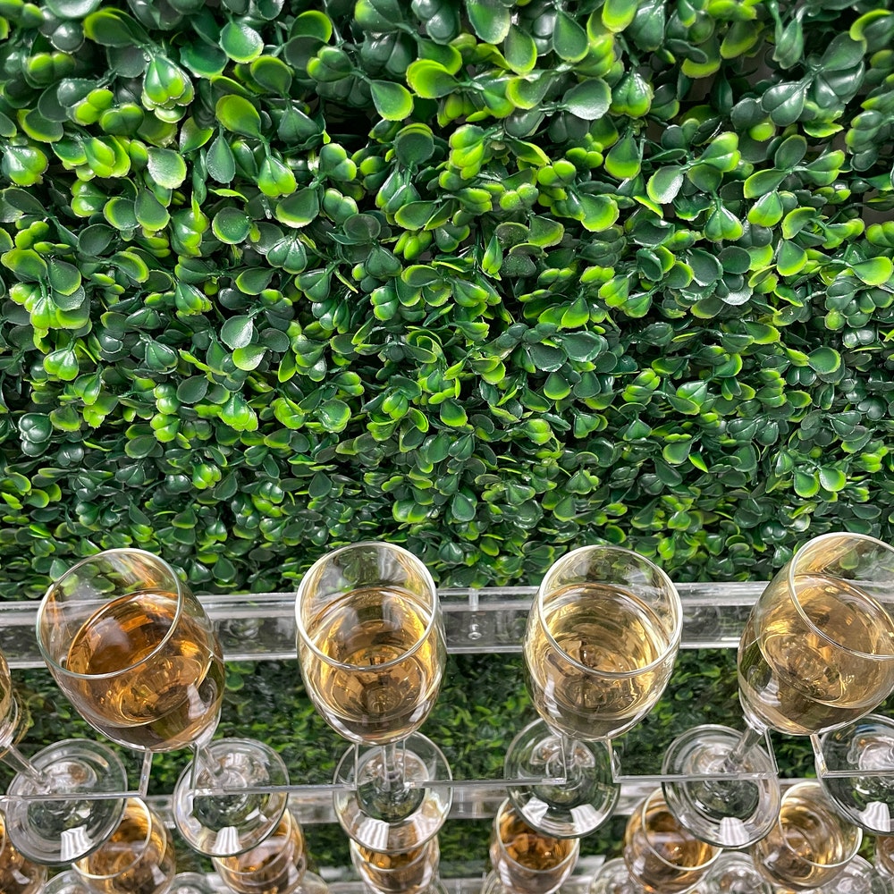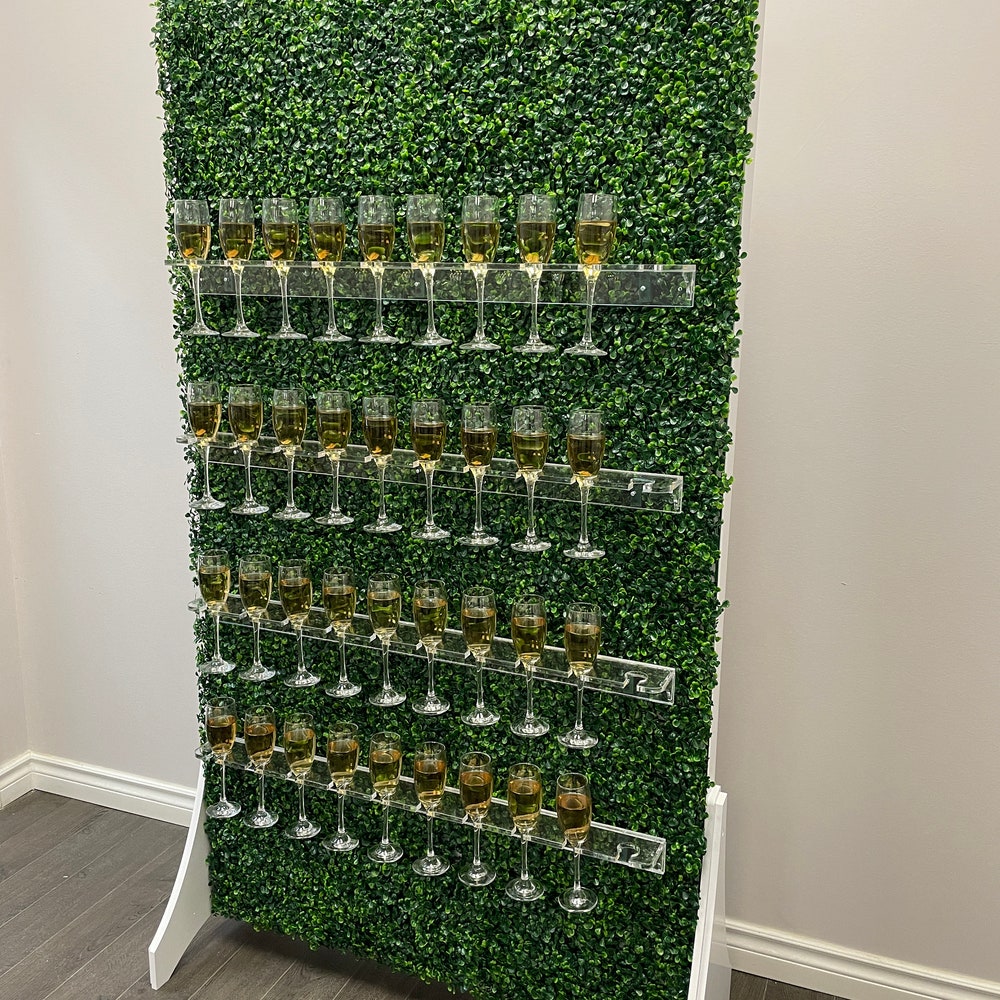Greenery drink Wall, Grass champagne wall, Drink Wall | Clear shelf glass holder | Wedding decorations | treat wall