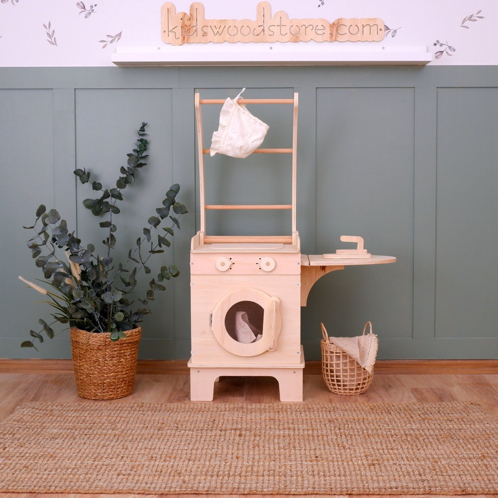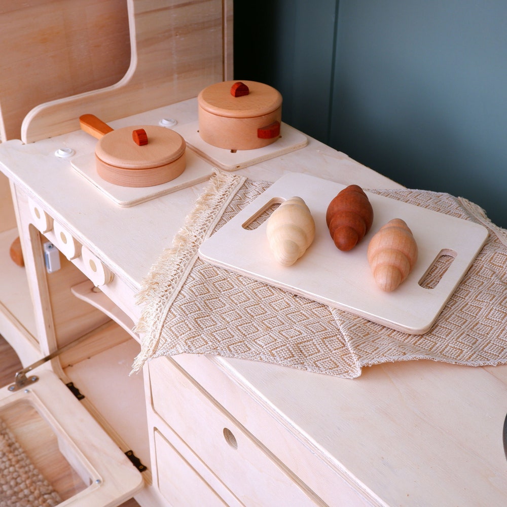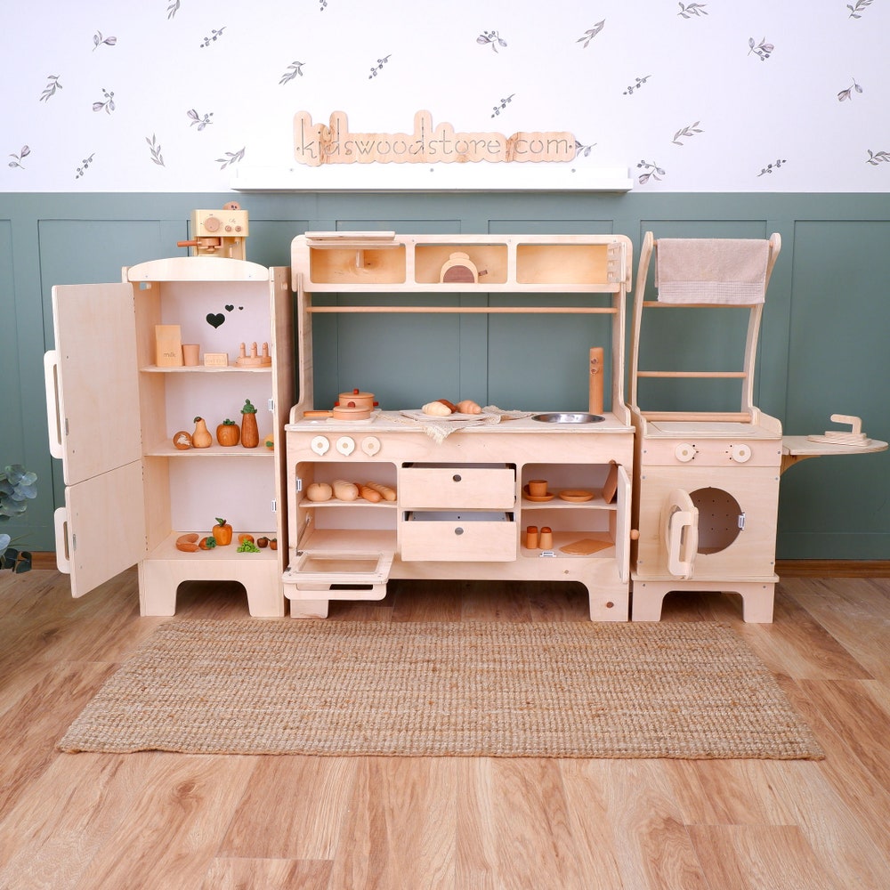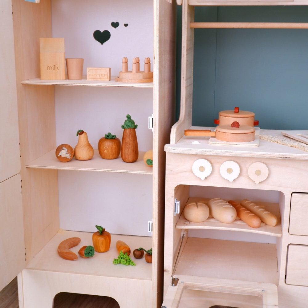 Encourage your child’s love for role-playing with this beautifully crafted kids play kitchen. Whether you are looking for a custom play kitchen to match your decor or a sturdy wooden kitchen set that will last for years, this set has it all. Perfect for toddlers and children, this pretend play kitchen is not only a wonderful wooden playset for kids but also a stylish piece of nursery furniture that fits seamlessly into any room.