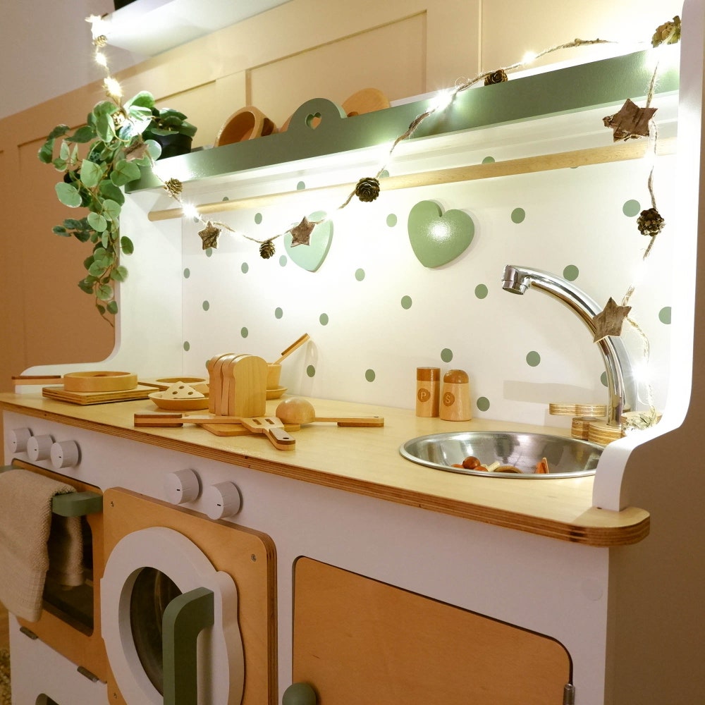 Encourage your child’s love for role-playing with this beautifully crafted kids play kitchen. Whether you are looking for a custom play kitchen to match your decor or a sturdy wooden kitchen set that will last for years, this set has it all. Perfect for toddlers and children, this pretend play kitchen is not only a wonderful wooden playset for kids but also a stylish piece of nursery furniture that fits seamlessly into any room.