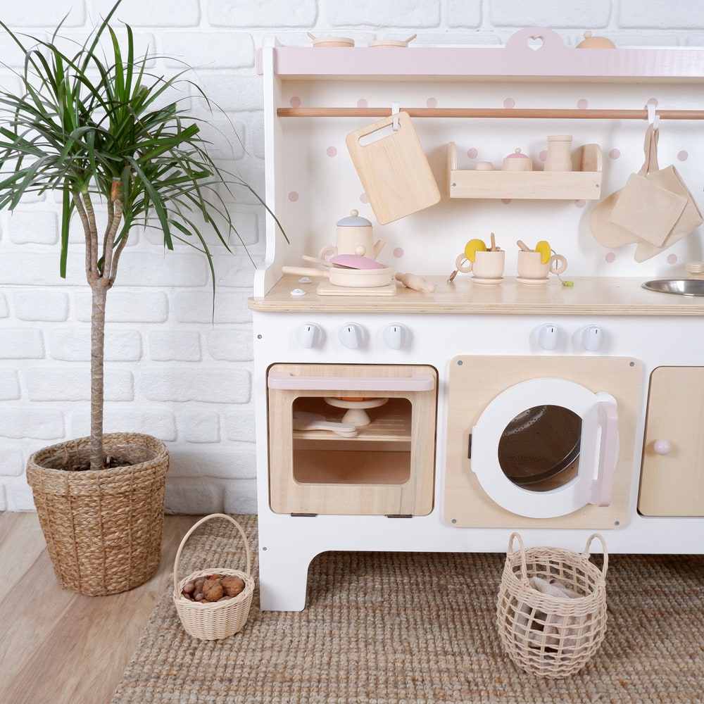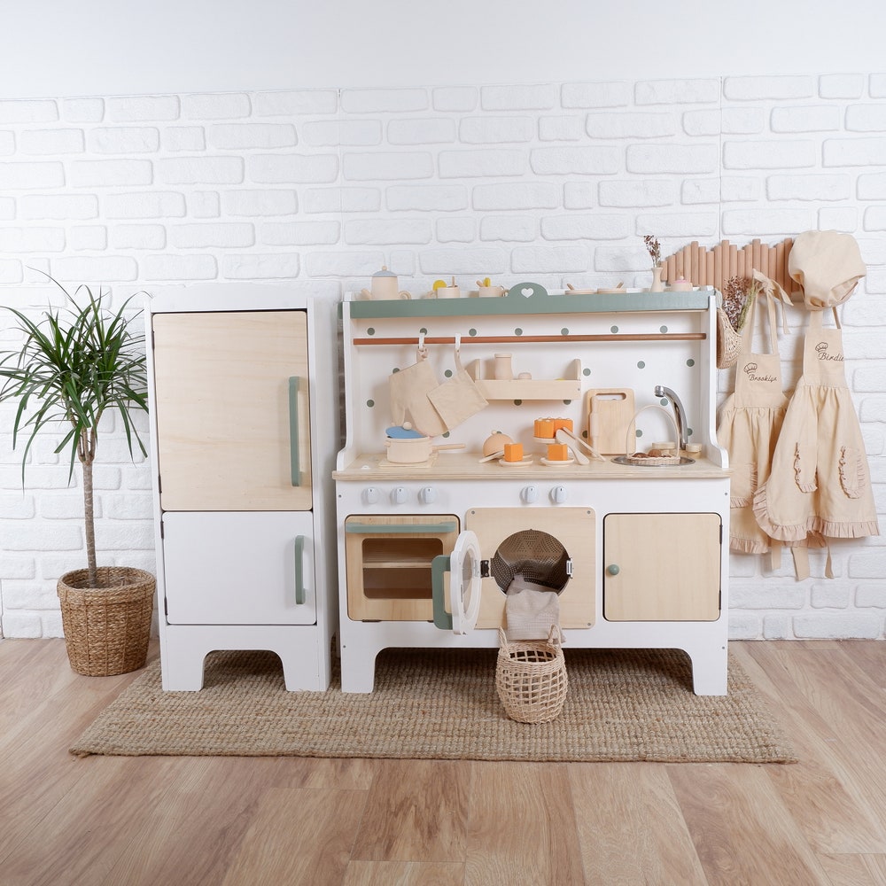Encourage your child’s love for role-playing with this beautifully crafted kids play kitchen. Whether you are looking for a custom play kitchen to match your decor or a sturdy wooden kitchen set that will last for years, this set has it all. Perfect for toddlers and children, this pretend play kitchen is not only a wonderful wooden playset for kids but also a stylish piece of nursery furniture that fits seamlessly into any room.