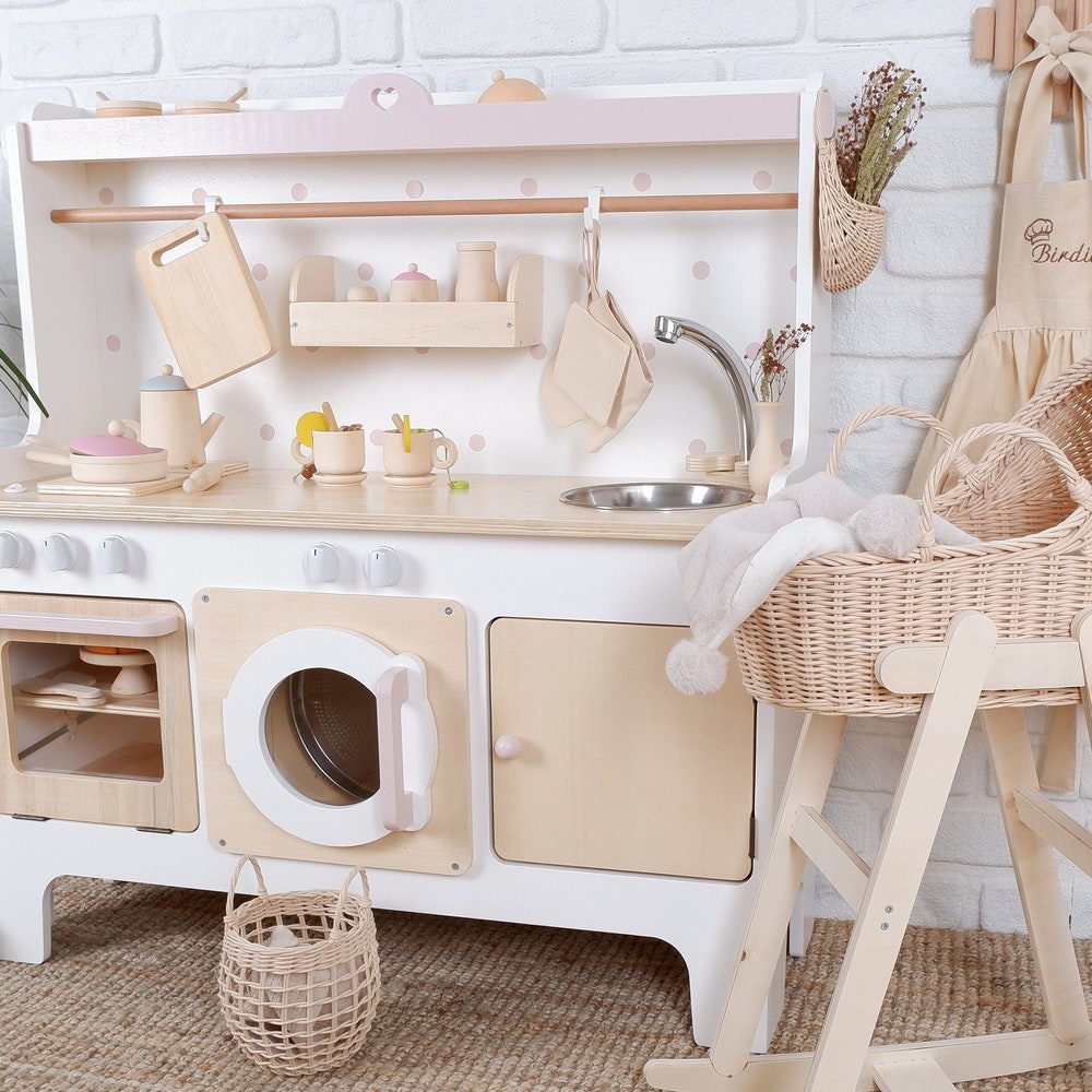 Our Wooden Play Kitchen is a perfect addition to any child’s playroom or nursery. This handmade play kitchen set, crafted with care and attention to detail, offers a delightful space for kids to engage in pretend play, enhancing their creativity and imagination. Designed in a Montessori style, this eco-friendly toy kitchen provides a safe and natural play environment for both boys and girls, making it an ideal choice for any home or learning space.