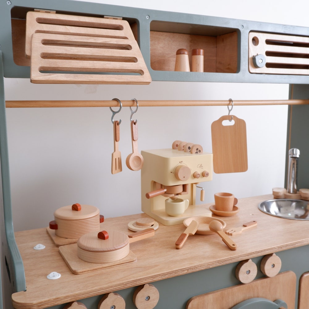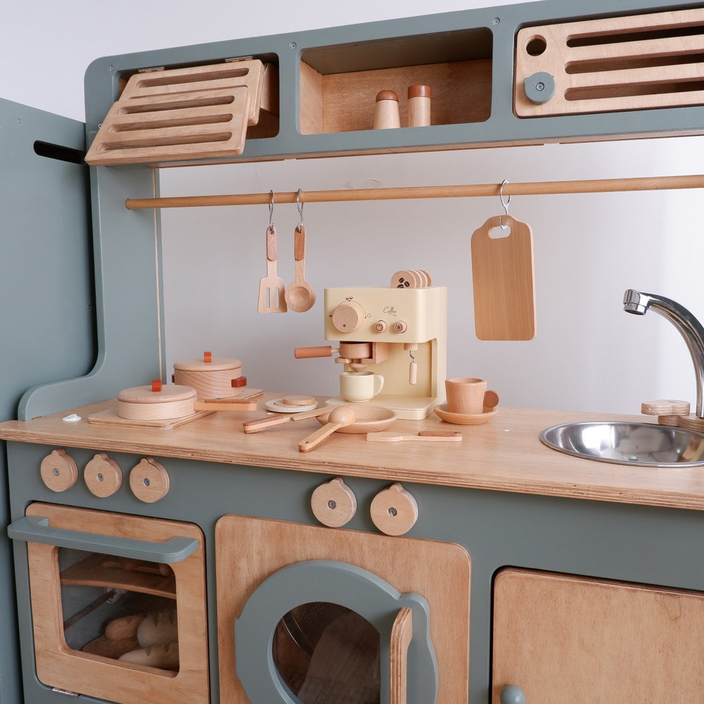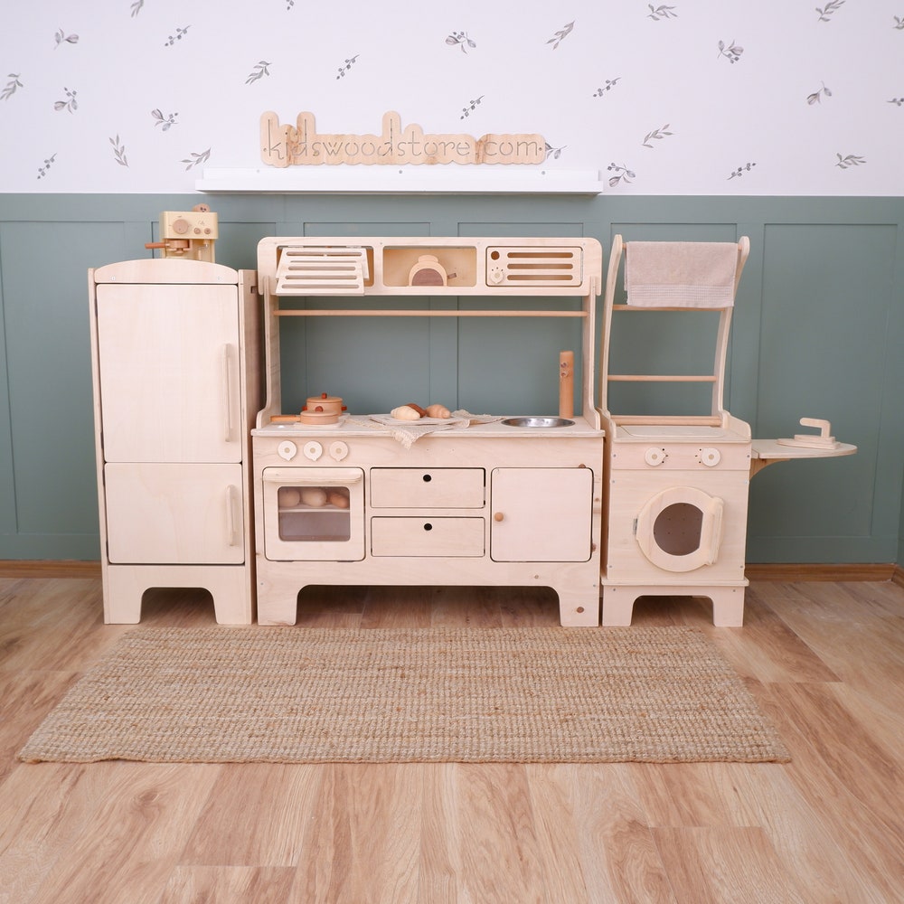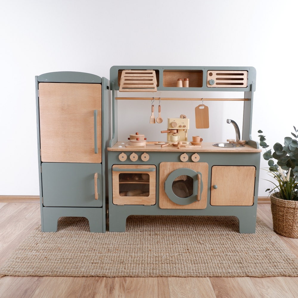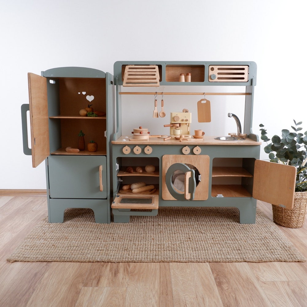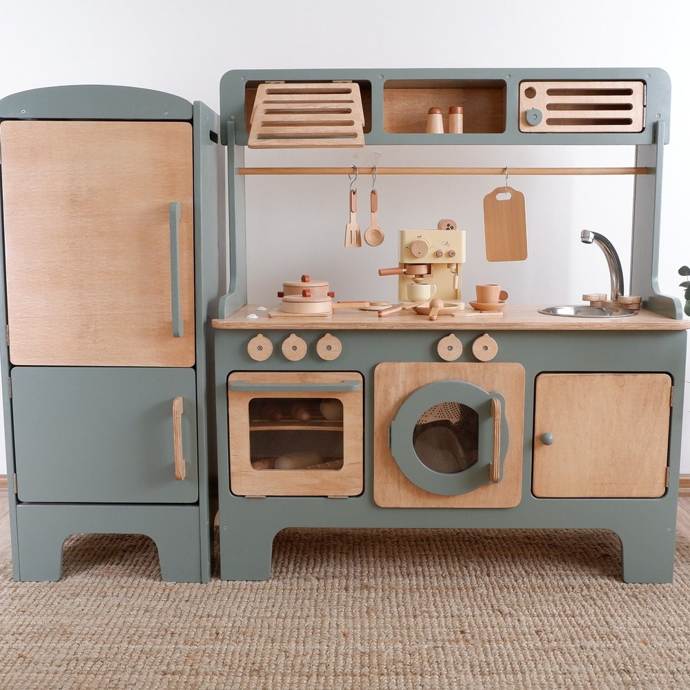Encourage your child’s love for role-playing with this beautifully crafted kids play kitchen. Whether you are looking for a custom play kitchen to match your decor or a sturdy wooden kitchen set that will last for years, this set has it all. Perfect for toddlers and children, this pretend play kitchen is not only a wonderful wooden playset for kids but also a stylish piece of nursery furniture that fits seamlessly into any room.