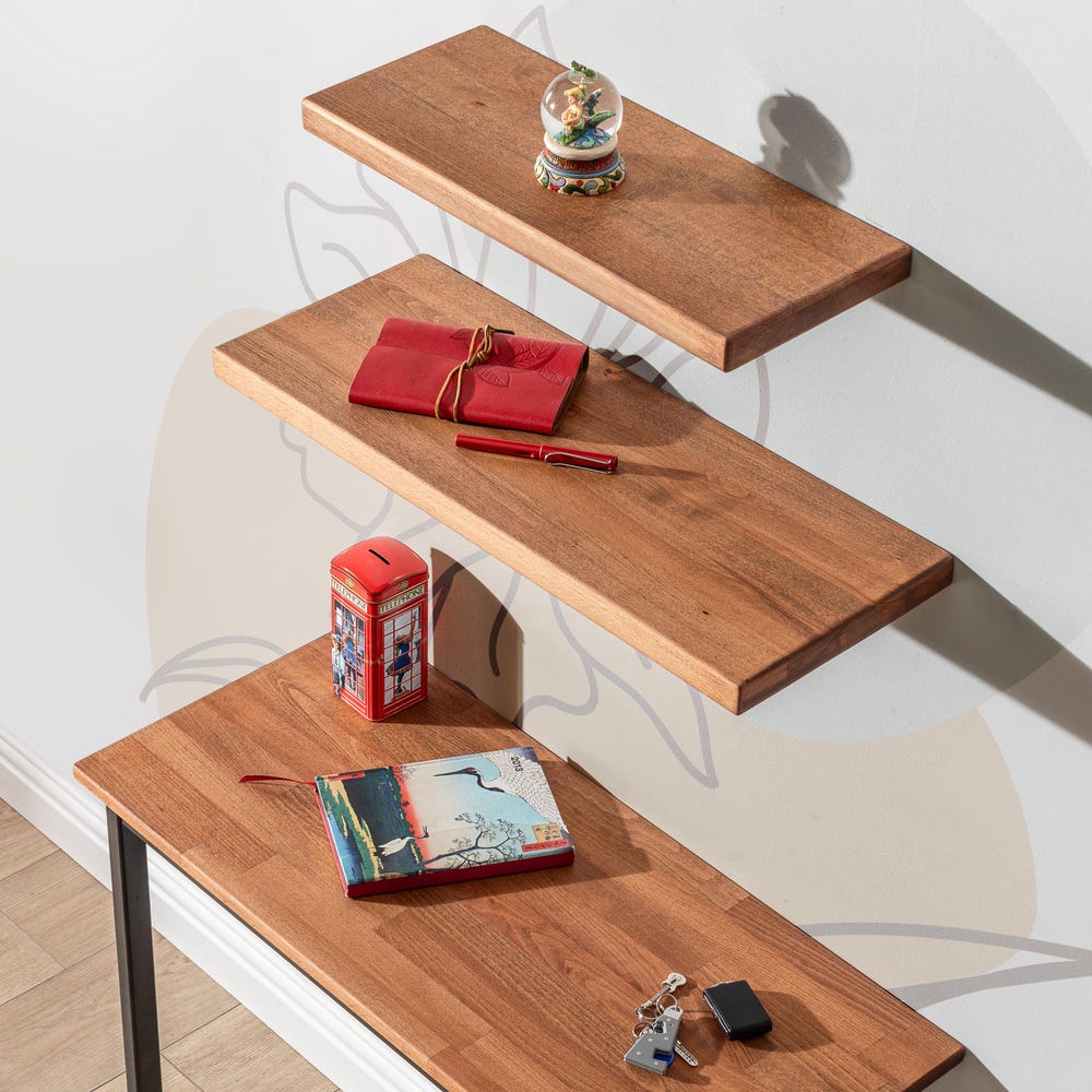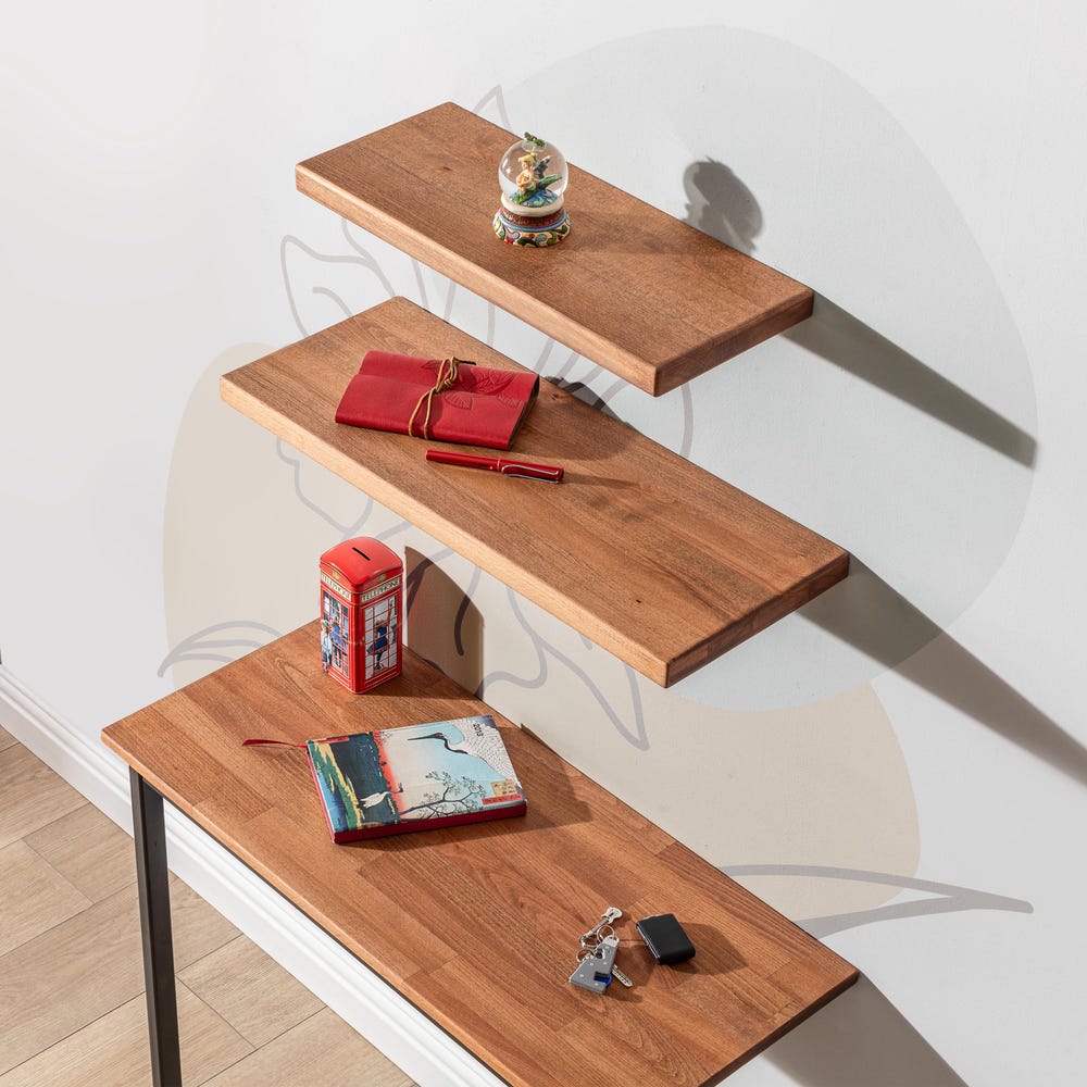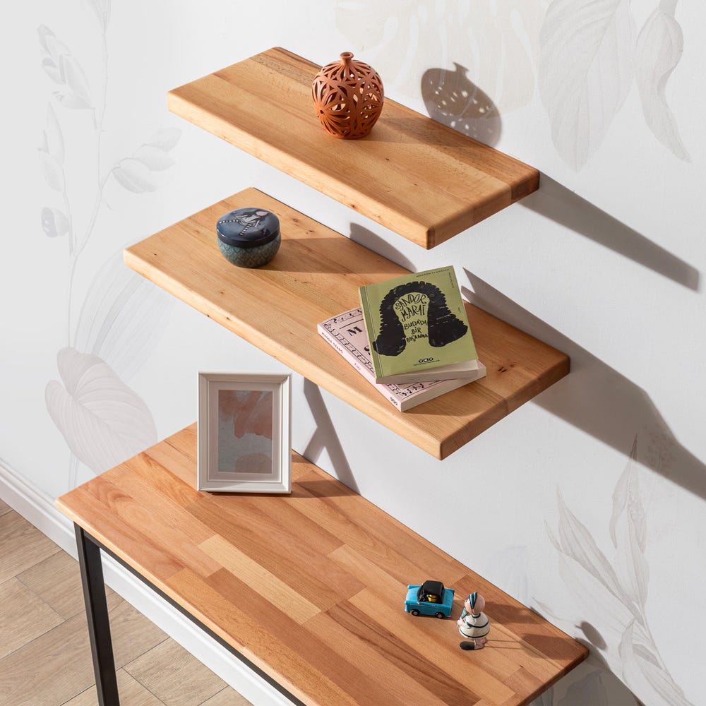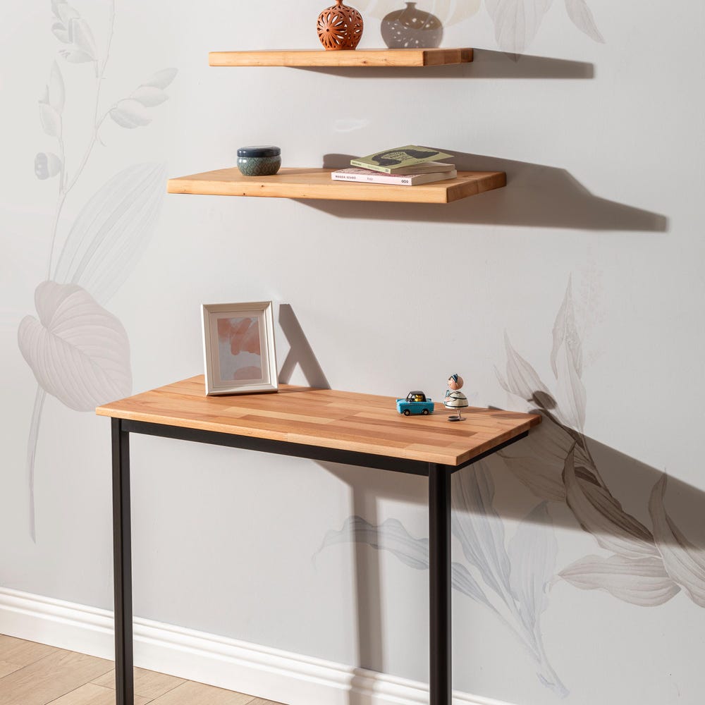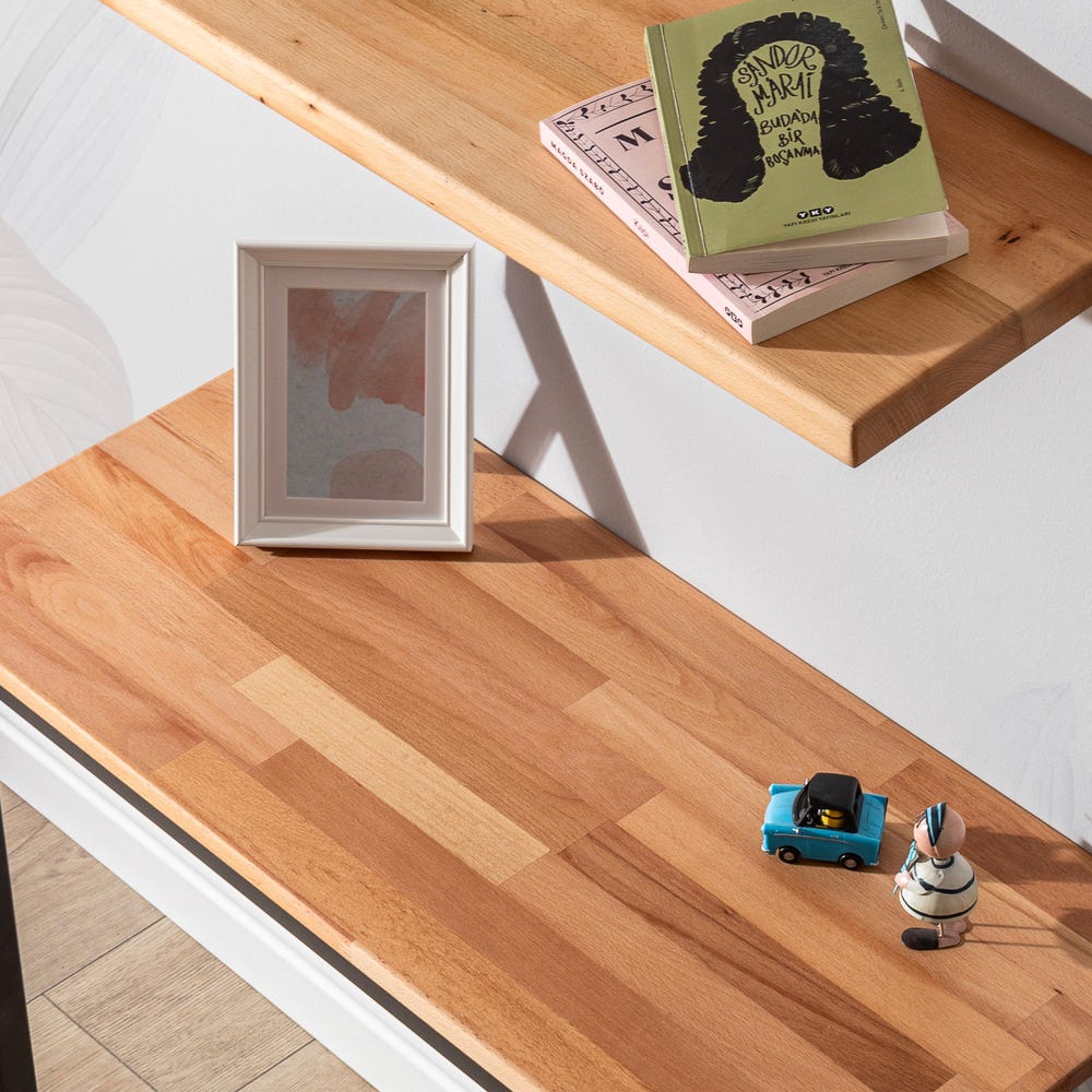 Transform your workspace with this elegant wall-mounted set, featuring a minimalist floating desk paired with two matching solid beech wood shelves. Designed for both style and functionality, this ensemble is perfect for modern interiors where space efficiency is key.​