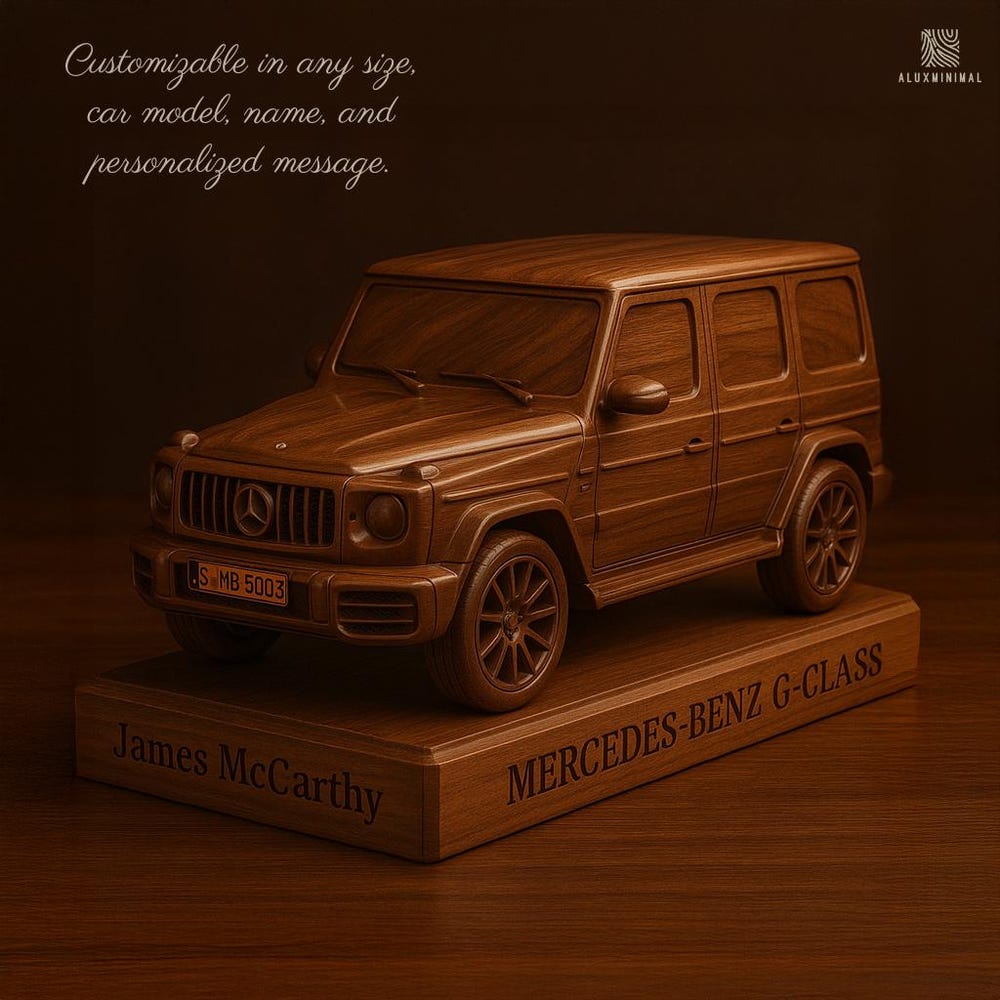 Expertly sculpted by hand from a single solid block of walnut wood, each model captures the precise lines and unique character of your car—including license plate, logo, and body design.
