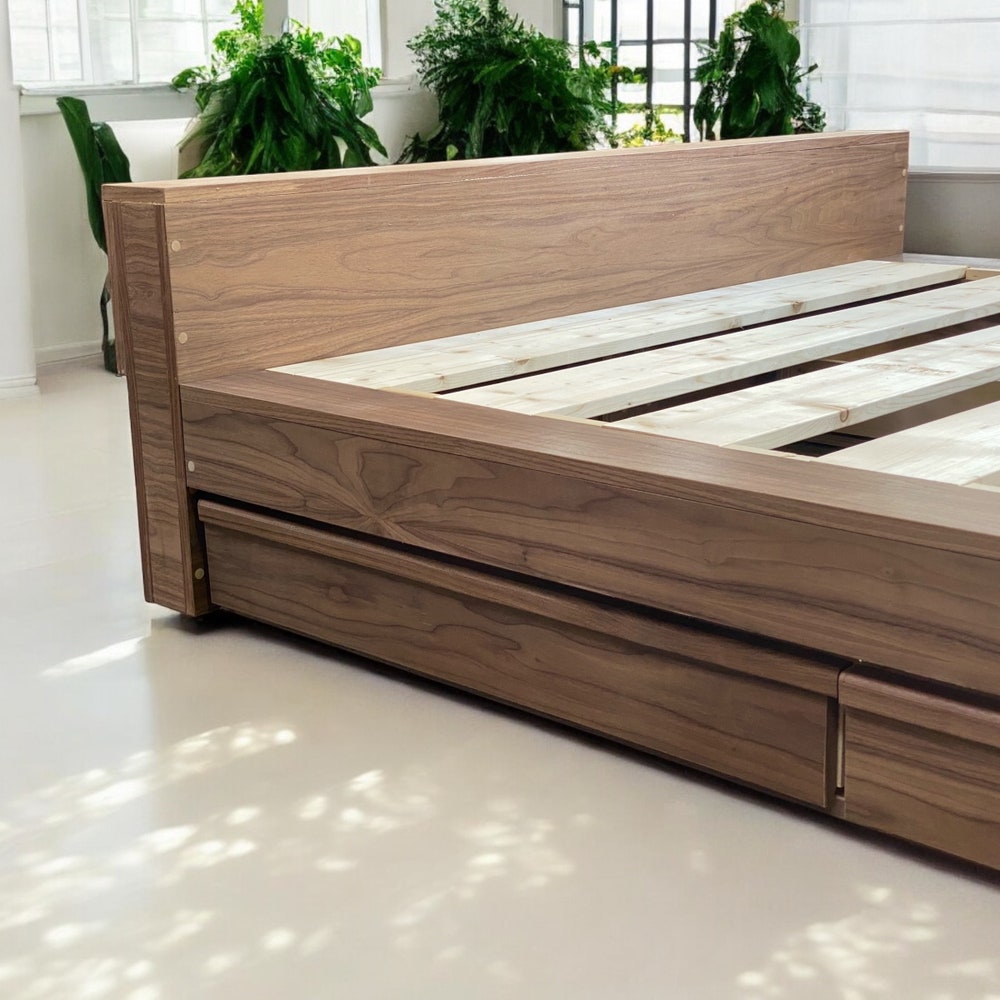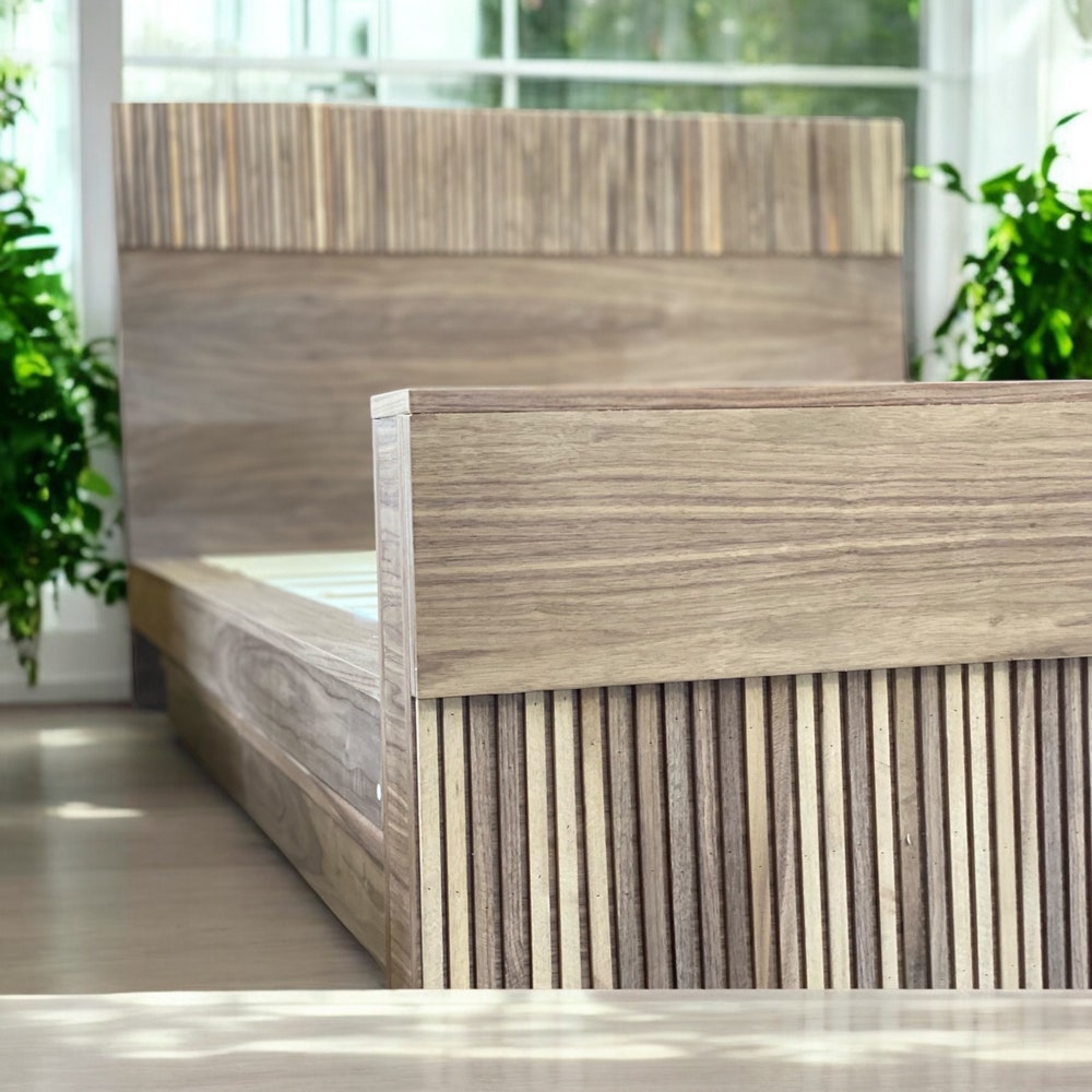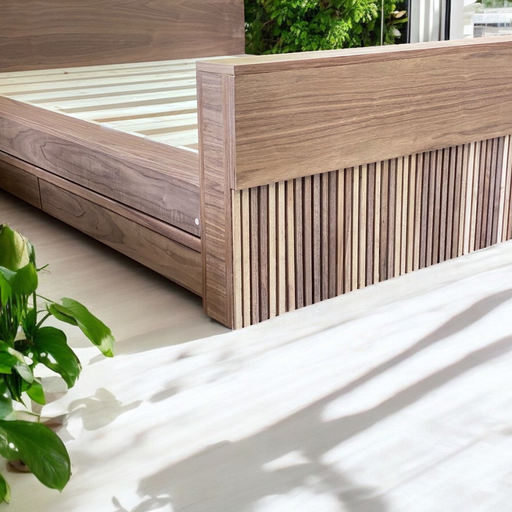 Elevate your space with “The Mini Oana,” a refined, space-saving version of our Oana model. Featuring a luxurious walnut hardwood frame, high fluted headboard, and baseboard, it blends timeless elegance with modern functionality. Perfect for smaller rooms, this design includes four discreet under-bed drawers for added storage.