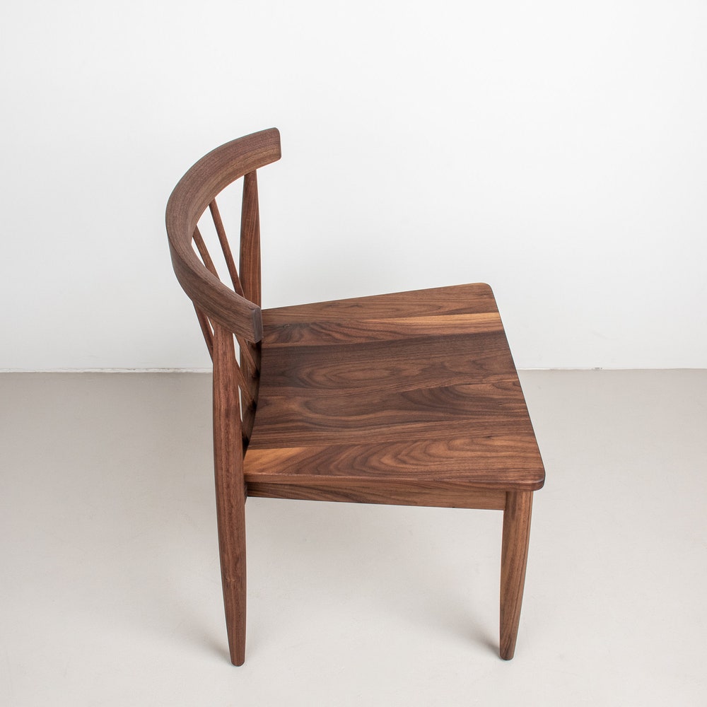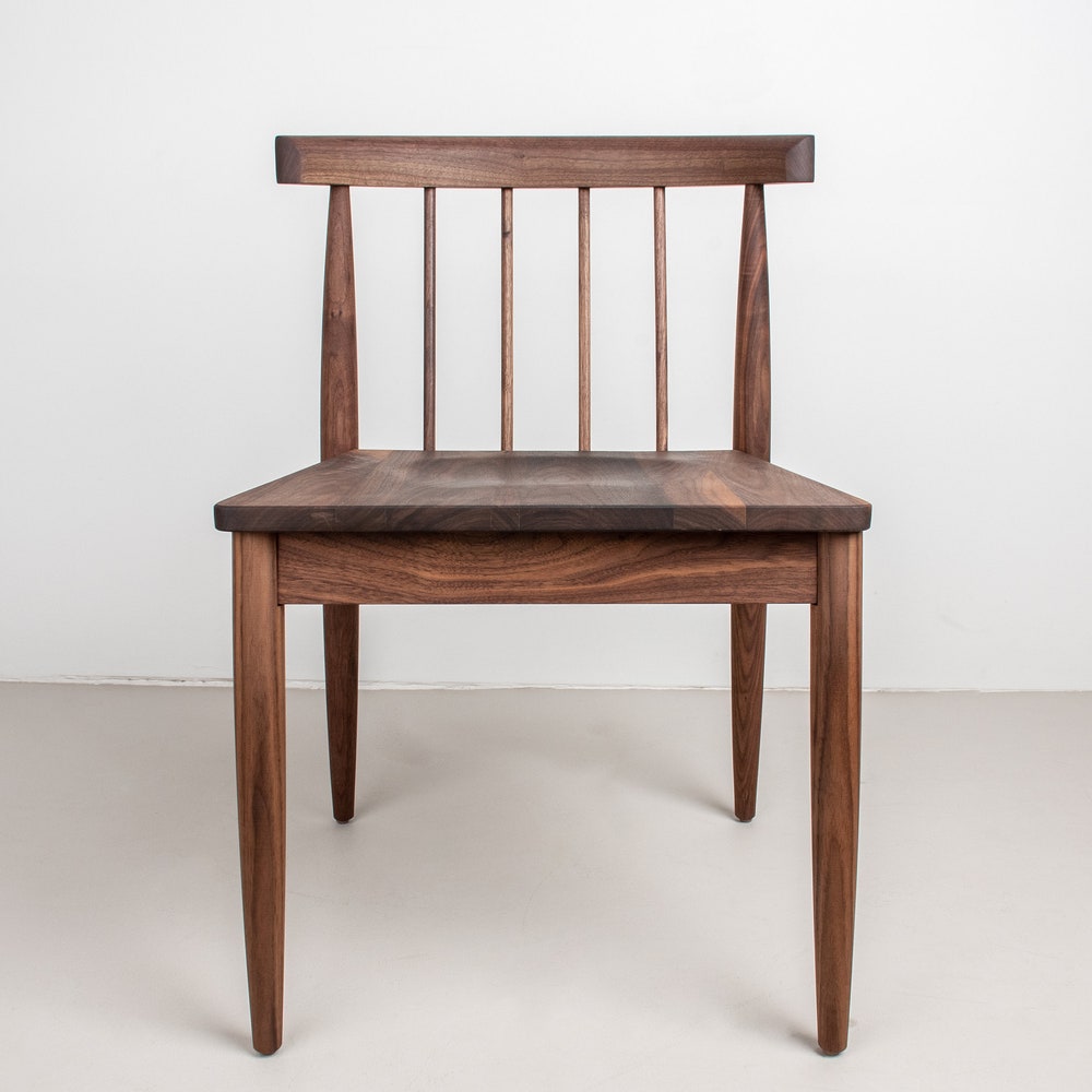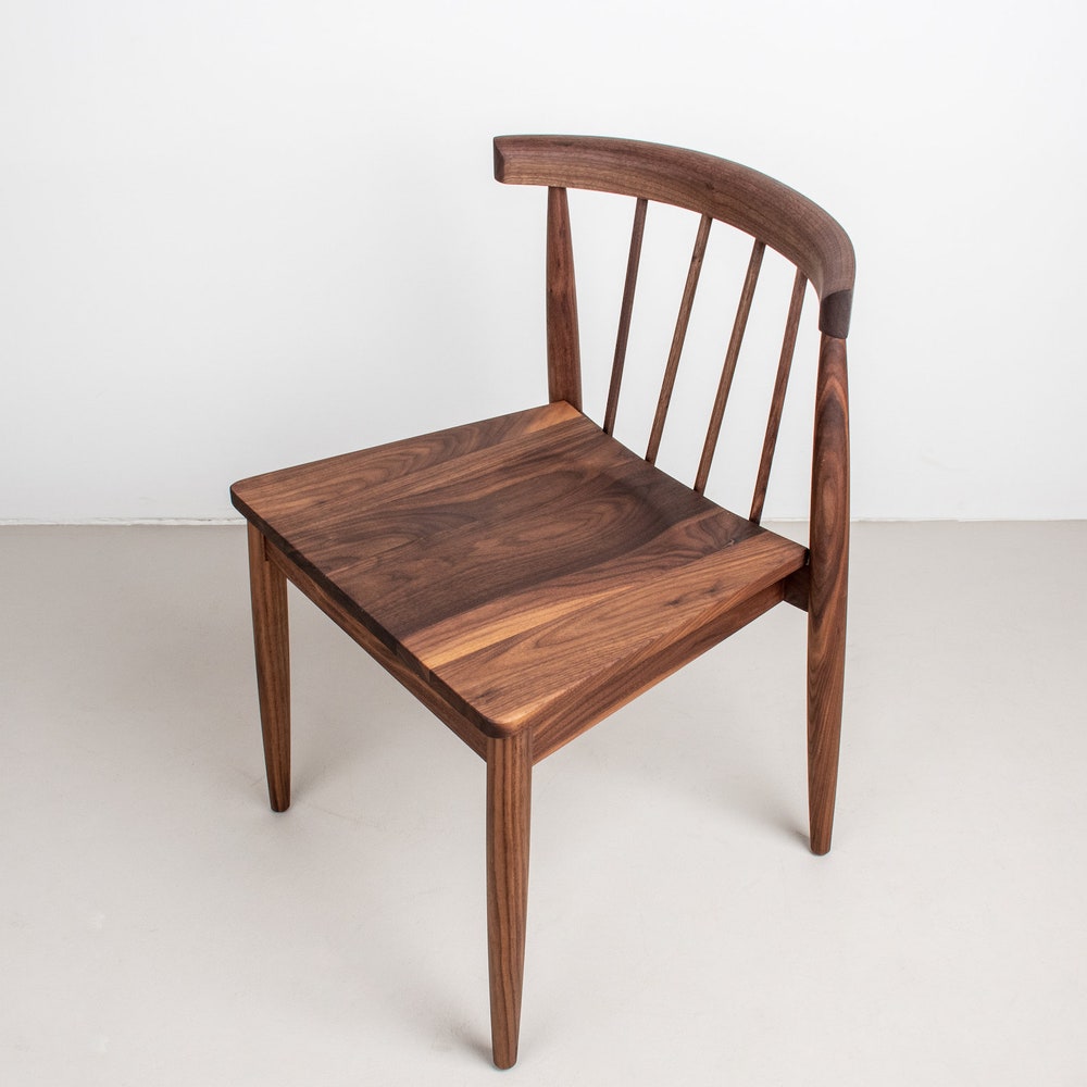 Leaning into mid century modern styling with the delicately curved back, our Eaton dining chairs with spindles are designed to complement your Loewen Design Studios table. Built of solid hardwood these chairs can be made of Walnut, Oak, and Maple in all of our finish colors. Eaton chairs are available either with or without spindles.