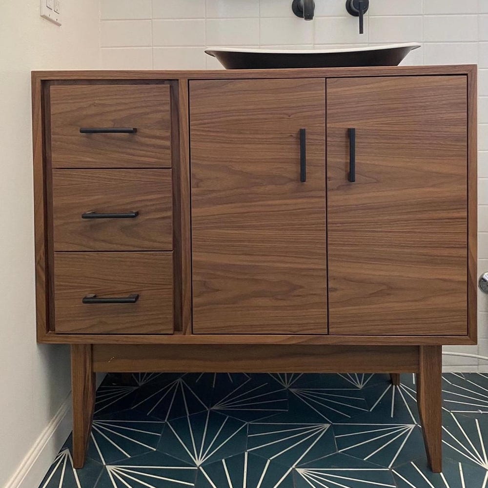 Handmade Mid Century 36″ Bathroom Vanity, Single Sink Right Offset, 2 Door 3 Drawer, USA Made