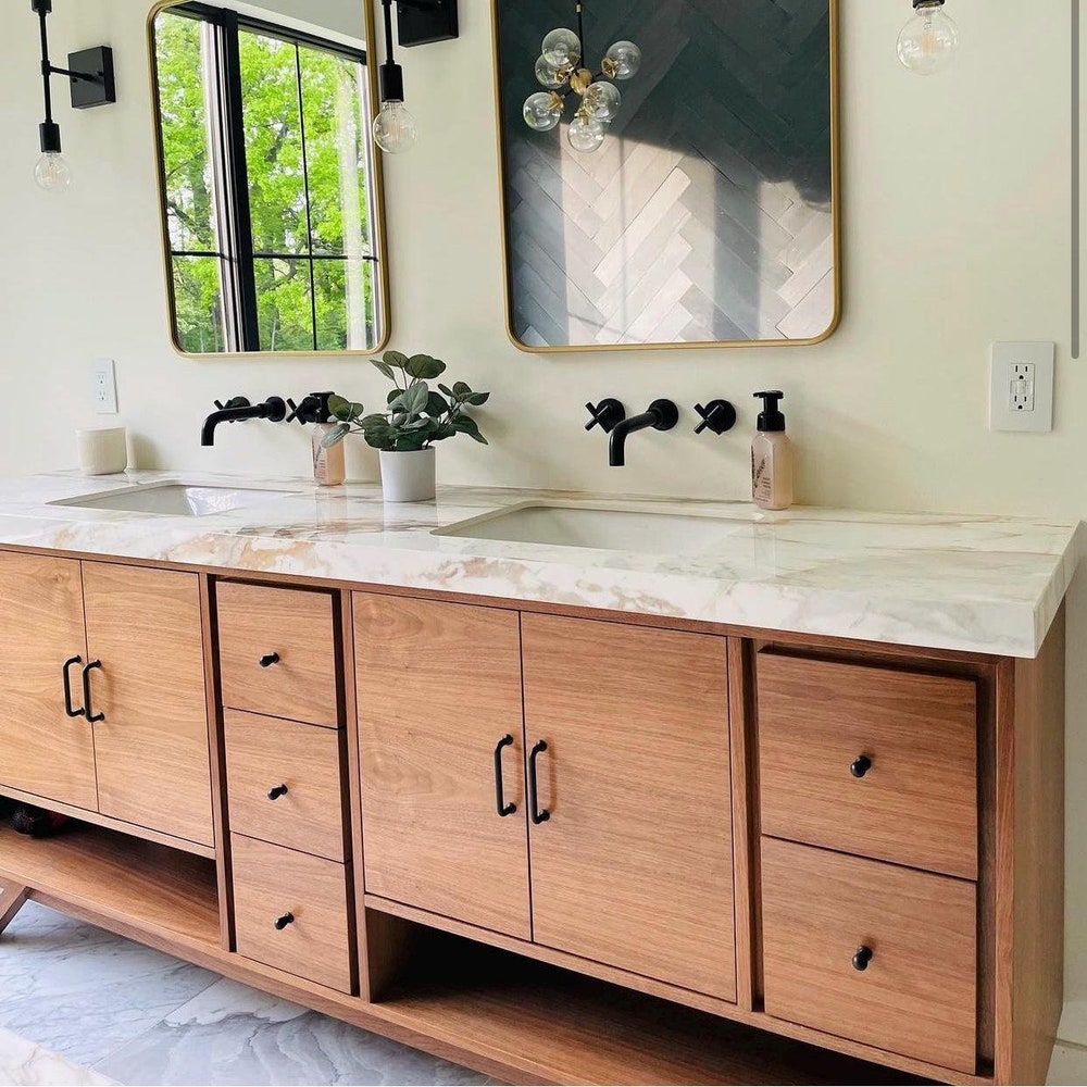 CABINET ONLY: Countertop, sink, and faucet are not included. Standard dimensions 96”L x 34.5”H x 21”D Handmade Mid-Century Modern Bathroom Vanity CabinetTransform your bathroom into a stylish sanctuary with a bespoke bathroom vanity from Draftwood Design. Handcrafted with mid-century modern elegance, our vanities blend timeless design with customizable storage solutions, perfect for any size bathroom, […]