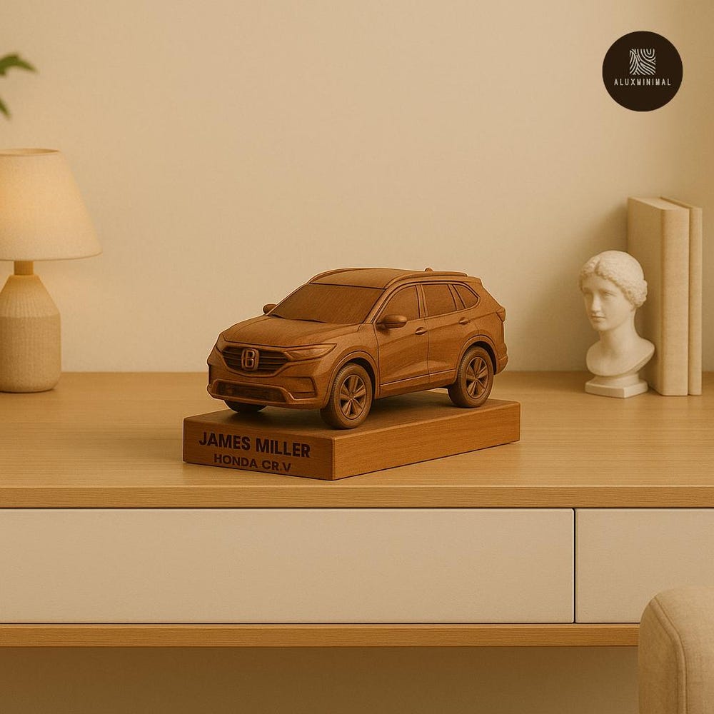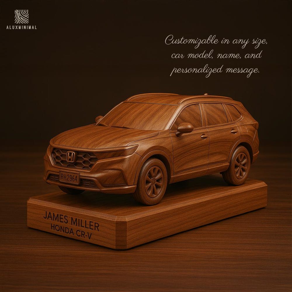 Expertly sculpted by hand from a single solid block of walnut wood, each model captures the precise lines and unique character of your car—including license plate, logo, and body design.
