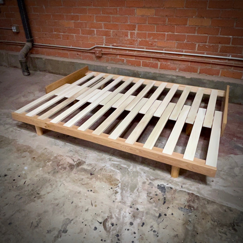 The finished frame is 82″ long, 38″ wide, and 9″ high (top of slats) / 12″ high (top of side rails). Customization requests are welcome!