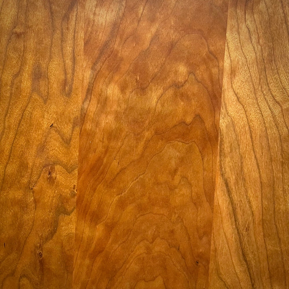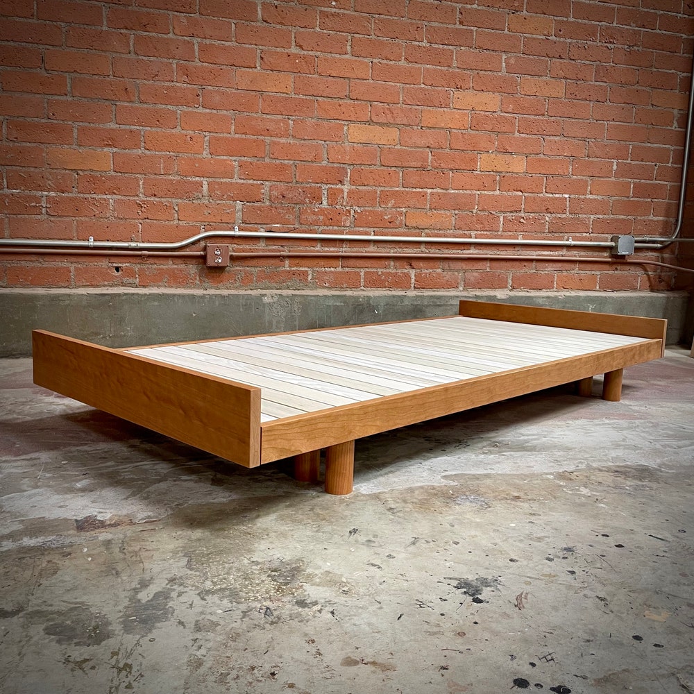 Solid cherry frame with poplar slats (all cherry option is available). Hand-applied oil / polyurethane finish. PLEASE NOTE: Cherry wood naturally darkens over time. The bed in the photos was photographed shortly after finishing, and thus is slightly lighter and more reddish in color than the bed will be in about one year. Please see last photo for what cherry looks like when it ages.