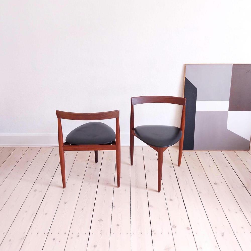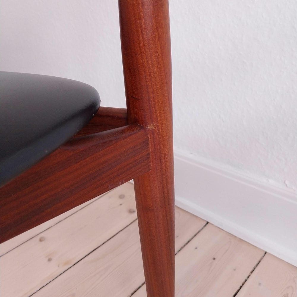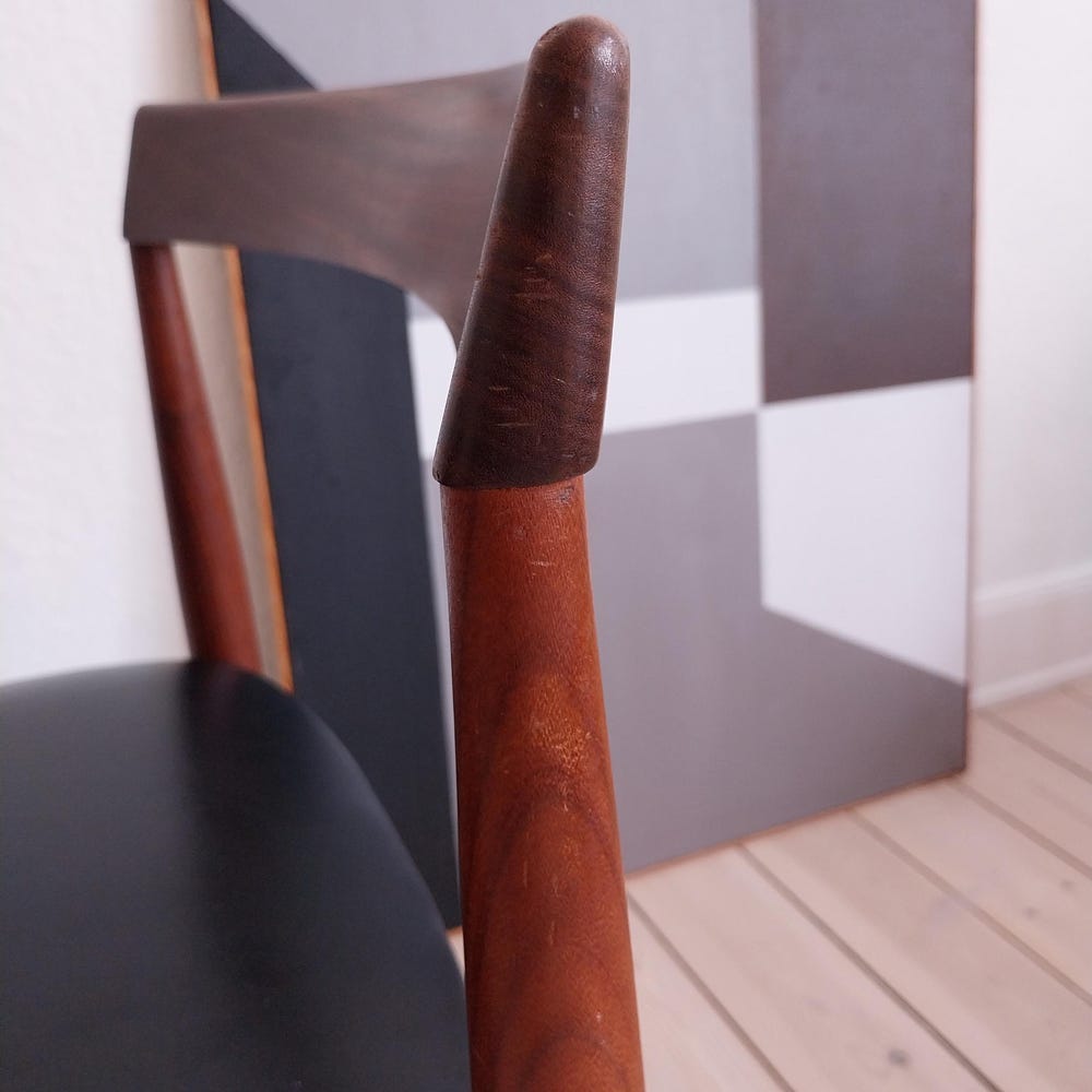 Incredible Danish mid-century modern teak chairs designed by renowned Danish designer Hans Olesen.Model “Roundette”.Manufactured by Danish Frem Røjle during the 1960s.With solid teak frames and black faux leather seats (All original) Iconic three footed design with slightly curved back. Currently sold individually and as a pair. Dimensions:Height: 27.75 in (70.49 cm)Width: 19.25 in (48.9 cm)Depth: […]
