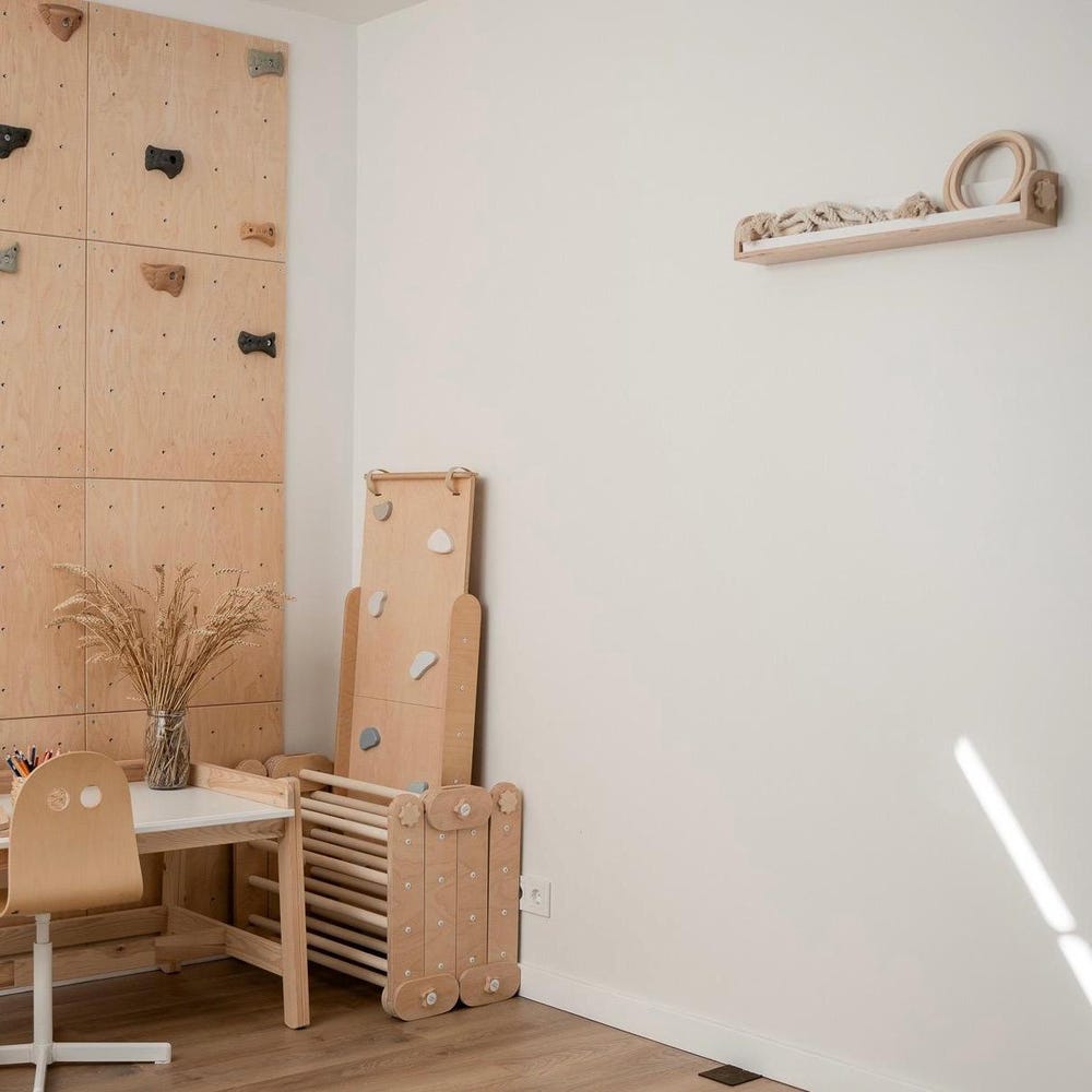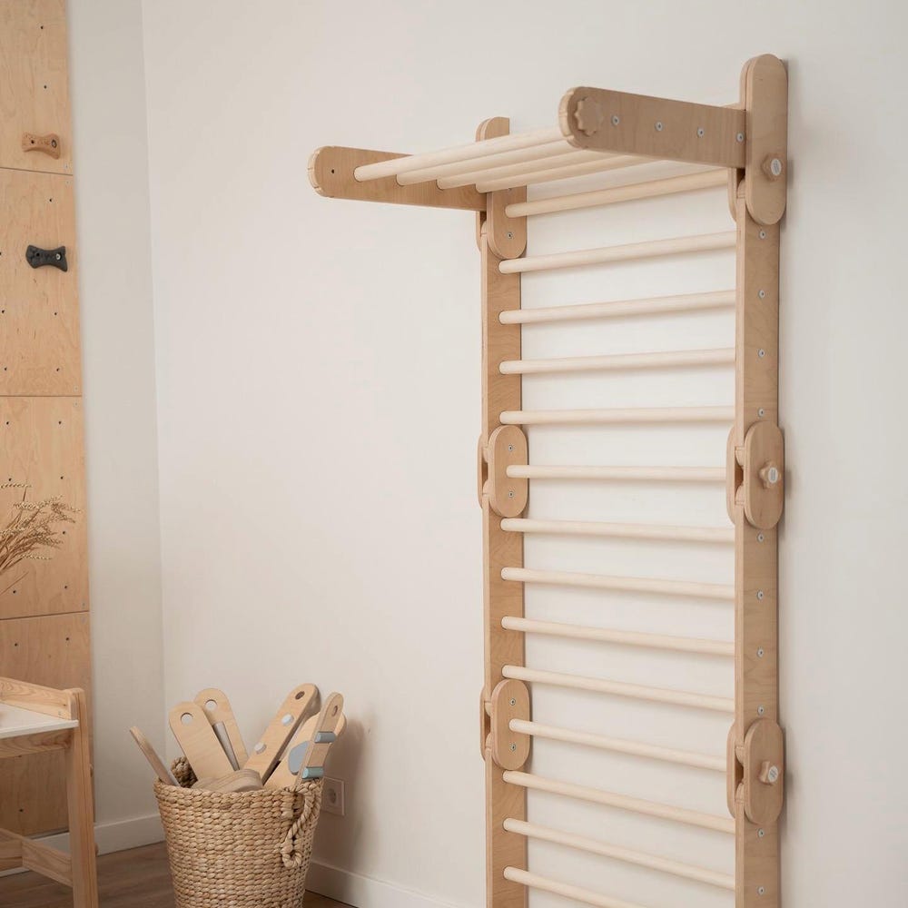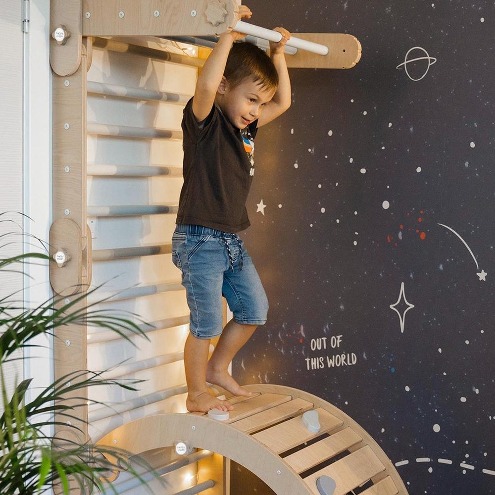 Wall mount is a designed system to make your HappyMoon Climber like a stall bar or Swedish wall! Wall mount looks like a wall shelf.