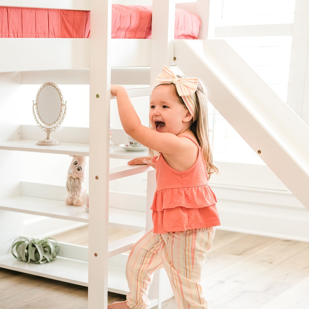 Our loft bed is designed with safety in mind. It meets CPSC safety requirements with guard rails at the top to keep your child safe throughout the night. The 2.4 inch thick posts, make this bunk bed strong and sturdy. Plus the no VOC, water-based paint doesn’t have any harmful chemicals.