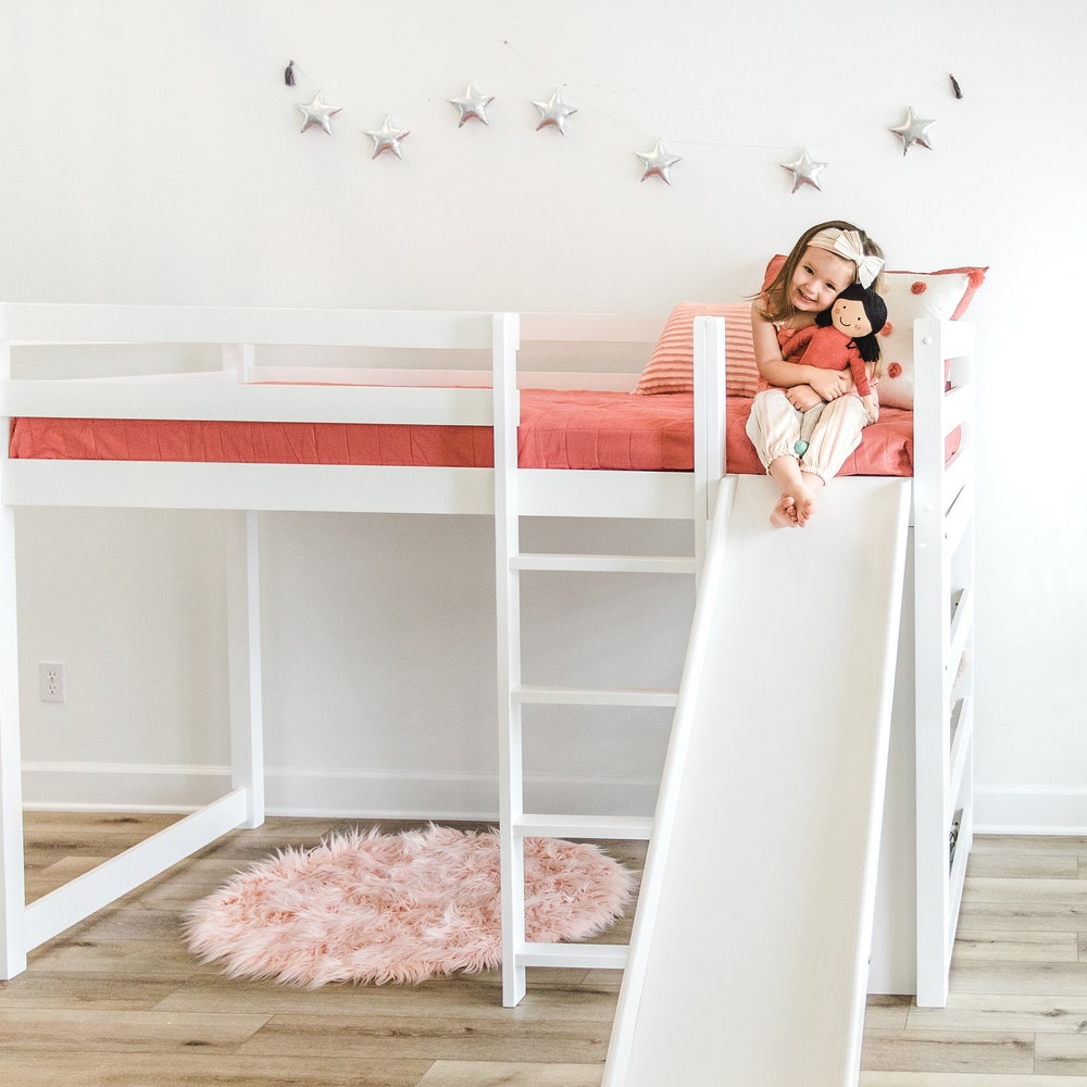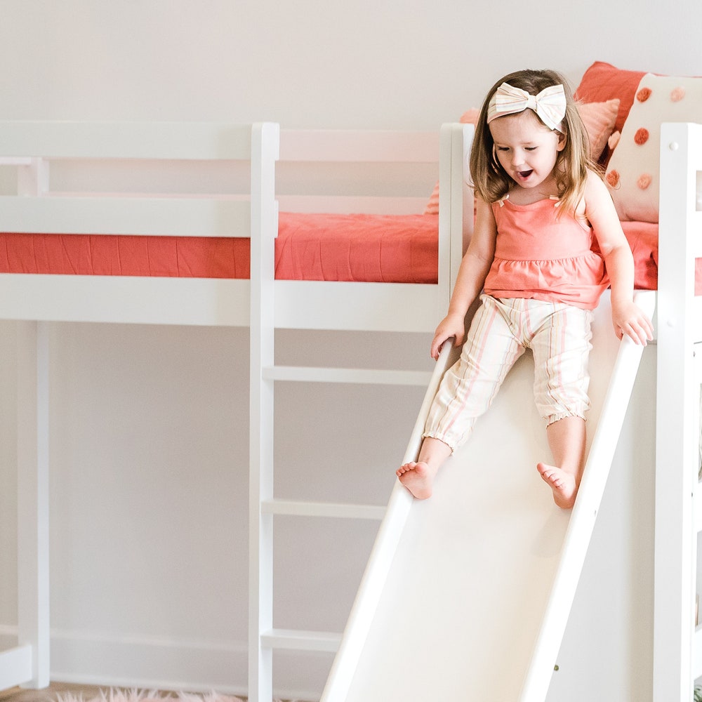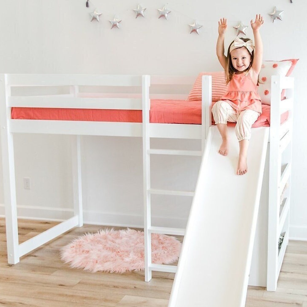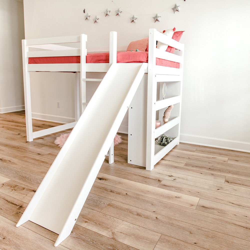 Bed, storage and play space in one? Yes, please! Our twin loft bed with slide features a contemporary design to make your child’s room more fun and organized. This loft bed is a great space saver, freeing up lots of floor space and combining the fun of a slide with shelving for an organized play area.