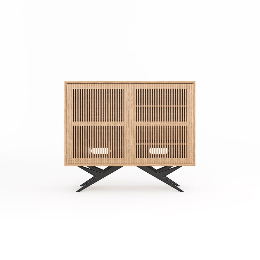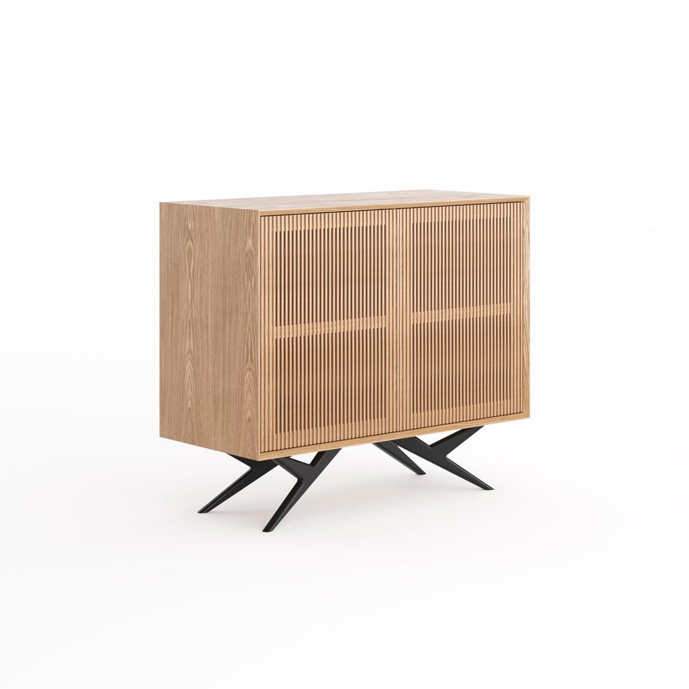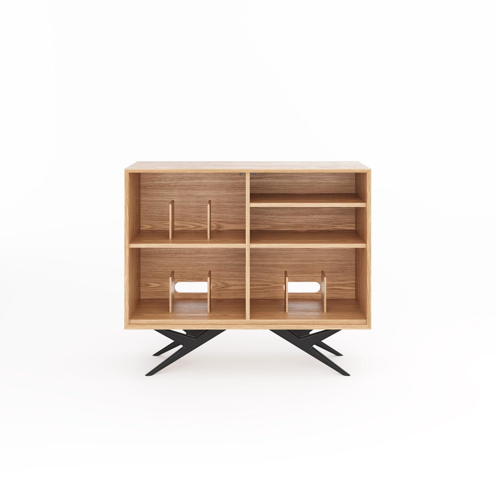 High oak record player stand with two slatted doors and black, aluminum, organic shape base in mid century modern style. The cabinet includes removable record dividers and adjustable shelves (only on the right side), allowing you to customize the storage space to accommodate media equipment and vinyl records. Cable holes in back and on the […]