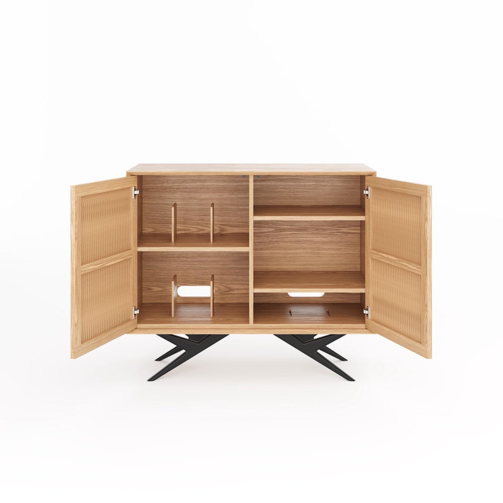 High oak record player stand with two slatted doors and black, aluminum, organic shape base in mid century modern style. The cabinet includes removable record dividers and adjustable shelves (only on the right side), allowing you to customize the storage space to accommodate media equipment and vinyl records. Cable holes in back and on the right side shelves with cutouts for wire management.