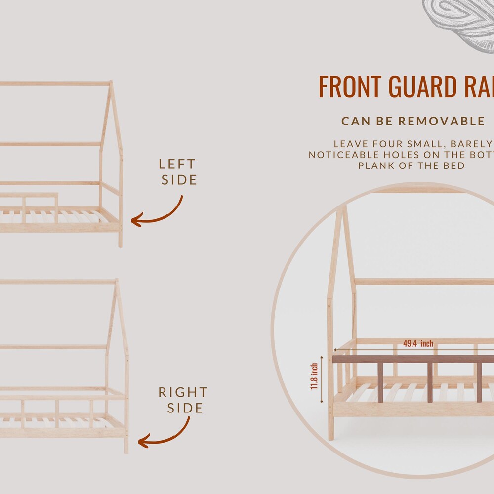 ✔️ The TWIN size bed Natural wooden frame and front guard rail is shown in the photo of the listing.