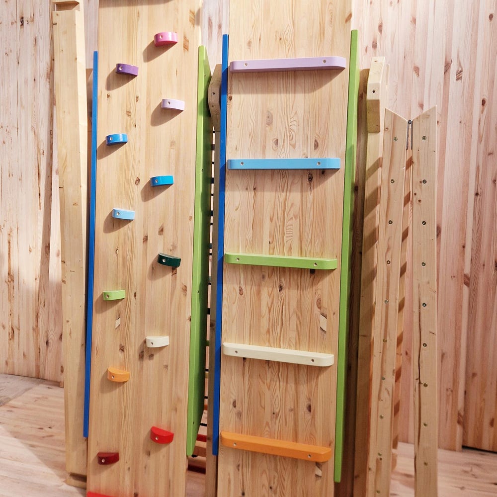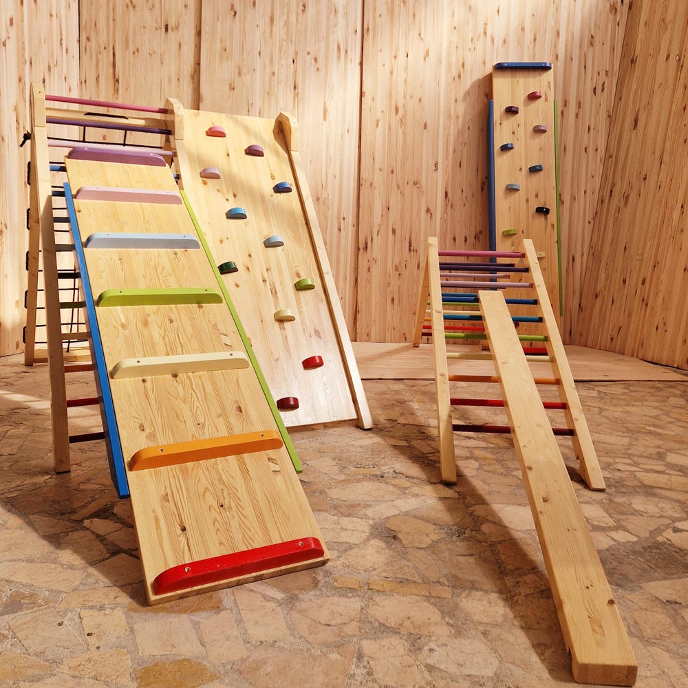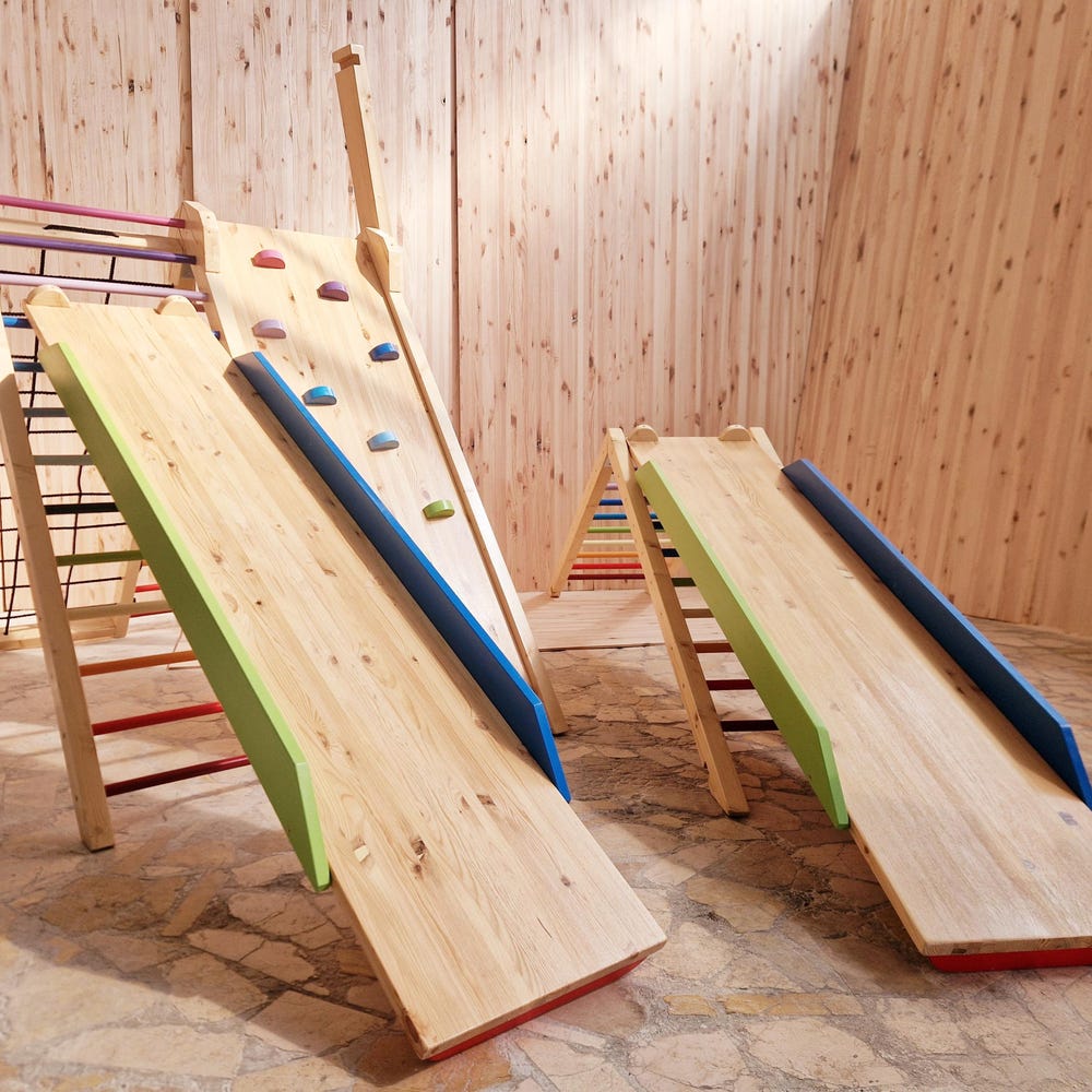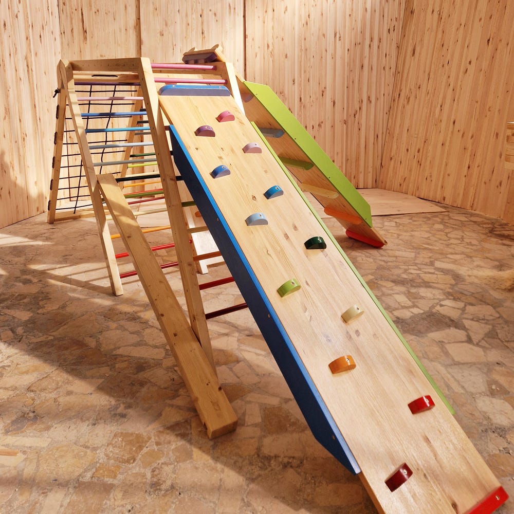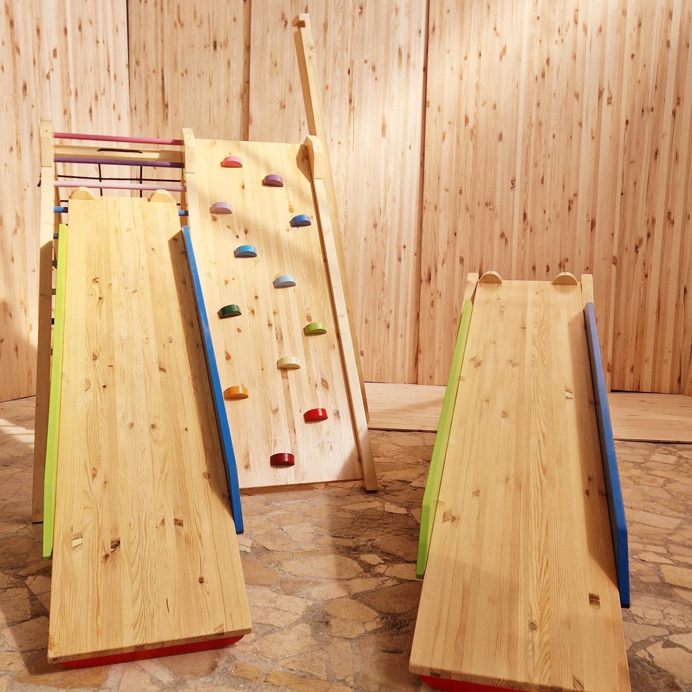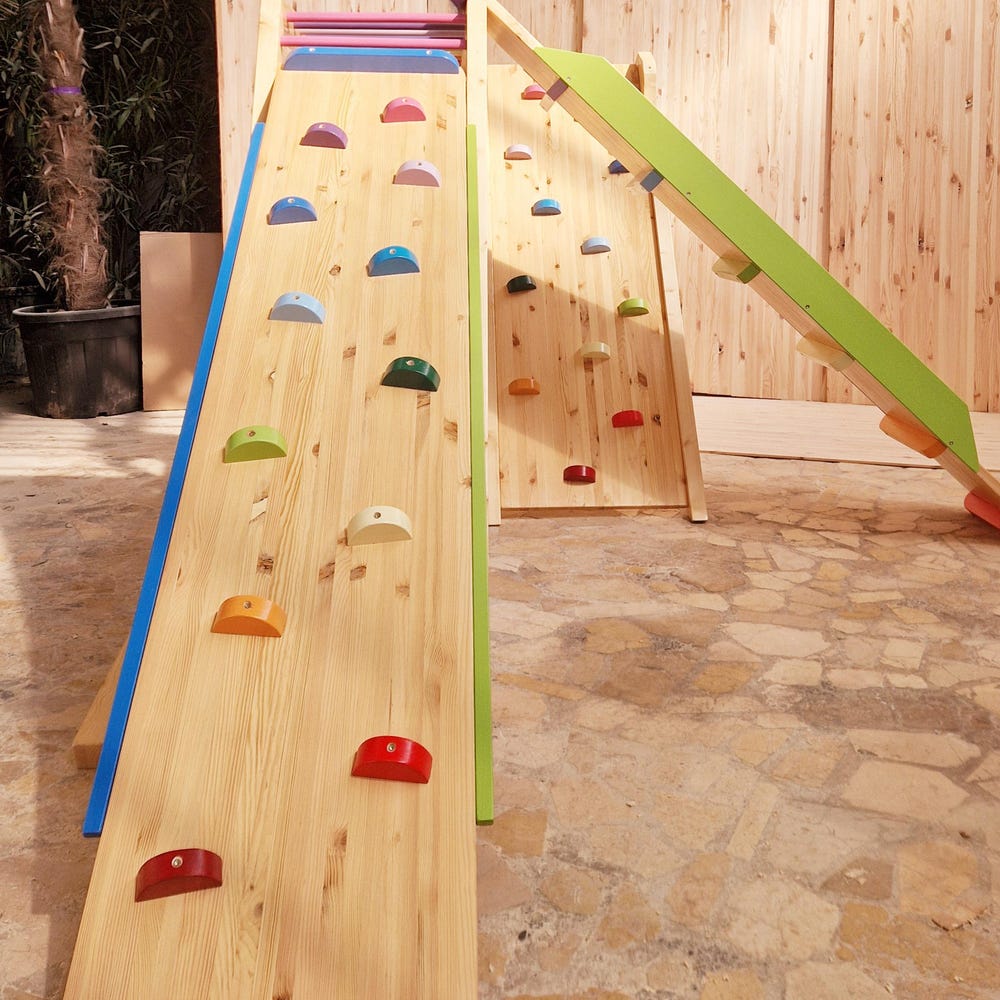 This impressive climbing complex offers infinite setup combinations.The set contains:* a double climbing triangle (140 cm high, 110 cm wide);* a simple triangle (150 cm long on each side, 50 cm wide) – to be used by itself or as monkey bars;* two slides/climbing walls, 200 cm long;* a 200 cm long balance beam.The wood […]