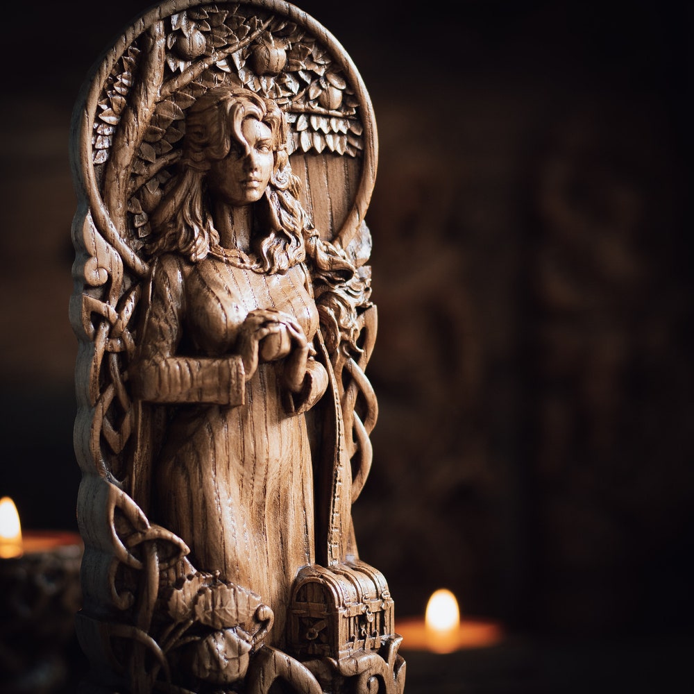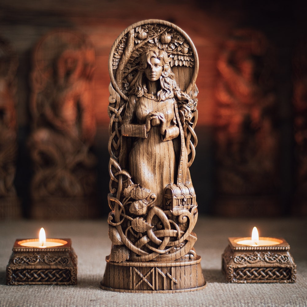 Idunn statue, Iduna, Iðunn, norse gods, wood carving altar heathen asatru viking god and goddes sculpture wooden scandinavian pantheon