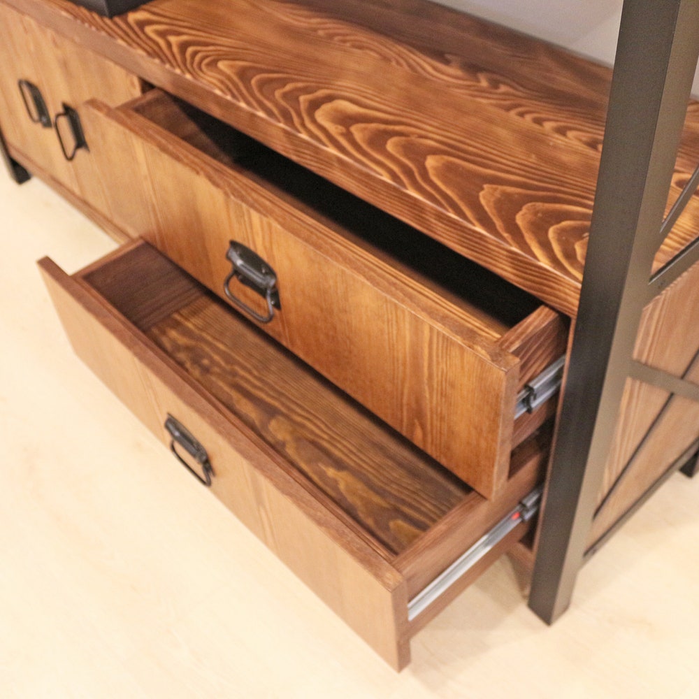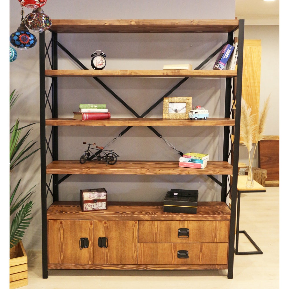 Industrial Bookcase with Doors and Drawers – Cross X / Wooden Shelves and Metal Frame / Loft Style Bookshelf