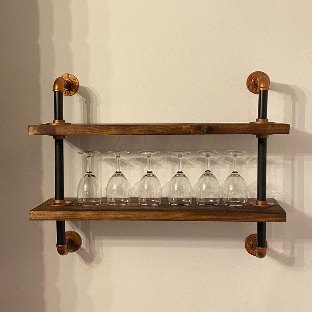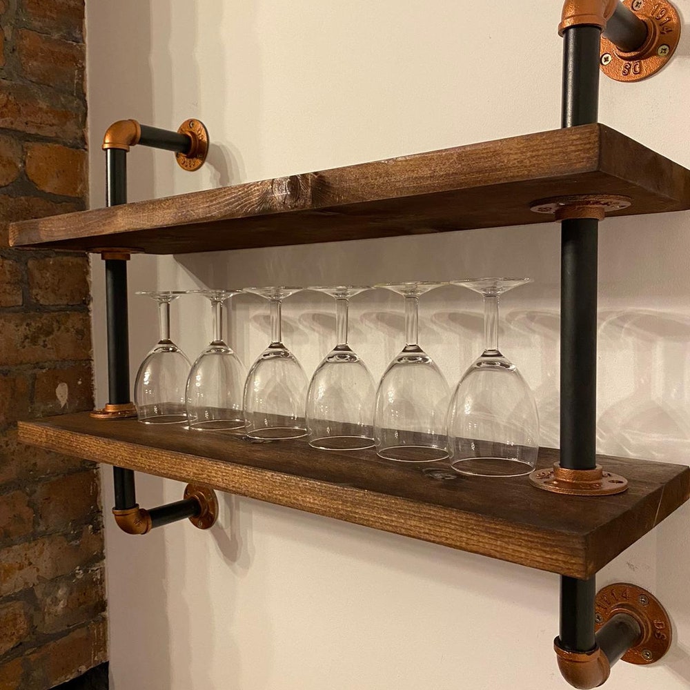 industrial pipe shelves unit/cast iron/wall decor/vintage/reclaimed wood/bespoke/livingroom/storage/glass holder/open shelving/bookshelf
