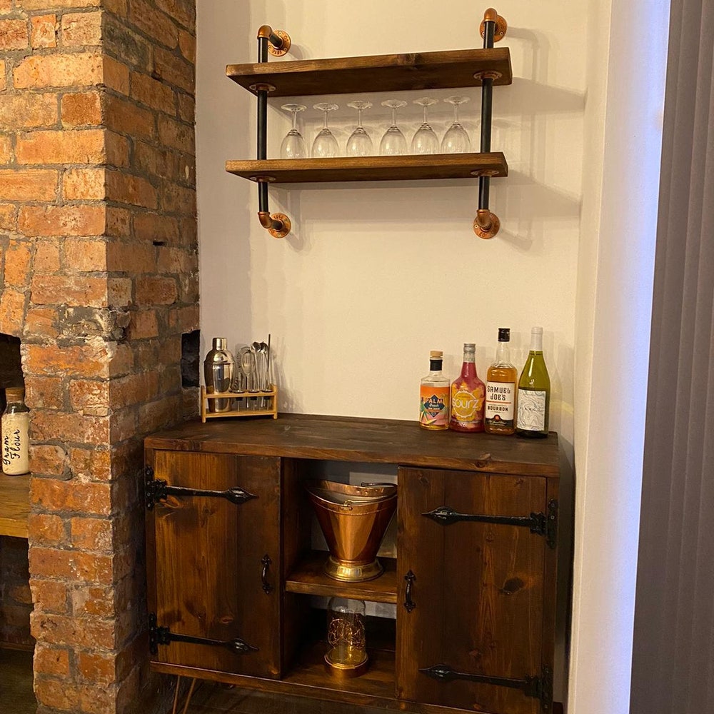 industrial pipe shelves unit/cast iron/wall decor/vintage/reclaimed wood/bespoke/livingroom/storage/glass holder/open shelving/bookshelf