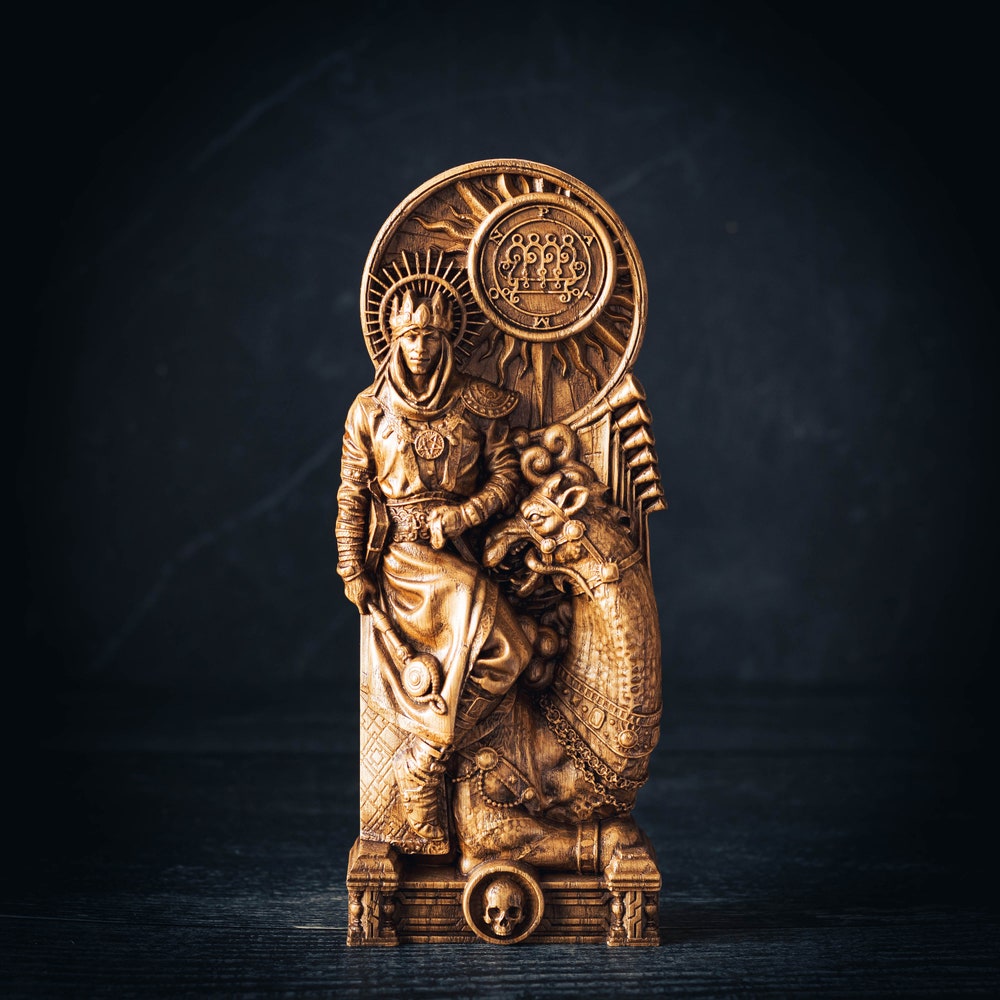 Hand carved oak statue of King Paimon – a powerful demon spirit from the Ars Goetia. This Goetia oak figurine is perfect as witchcraft decor, occult altar setups, spirit work, or as a demon figurine for collectors of infernal and pagan art. Crafted from solid oak with a matte natural finish, it brings presence, symbolism, and timeless craft to your sacred space.