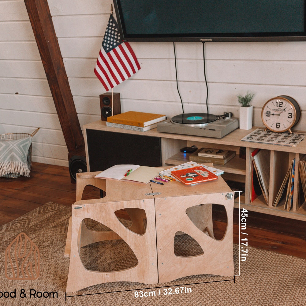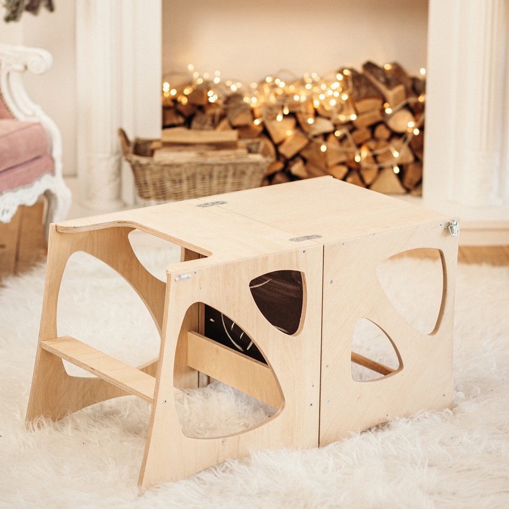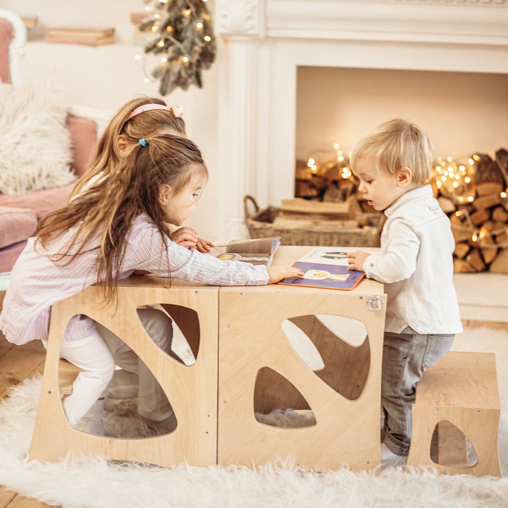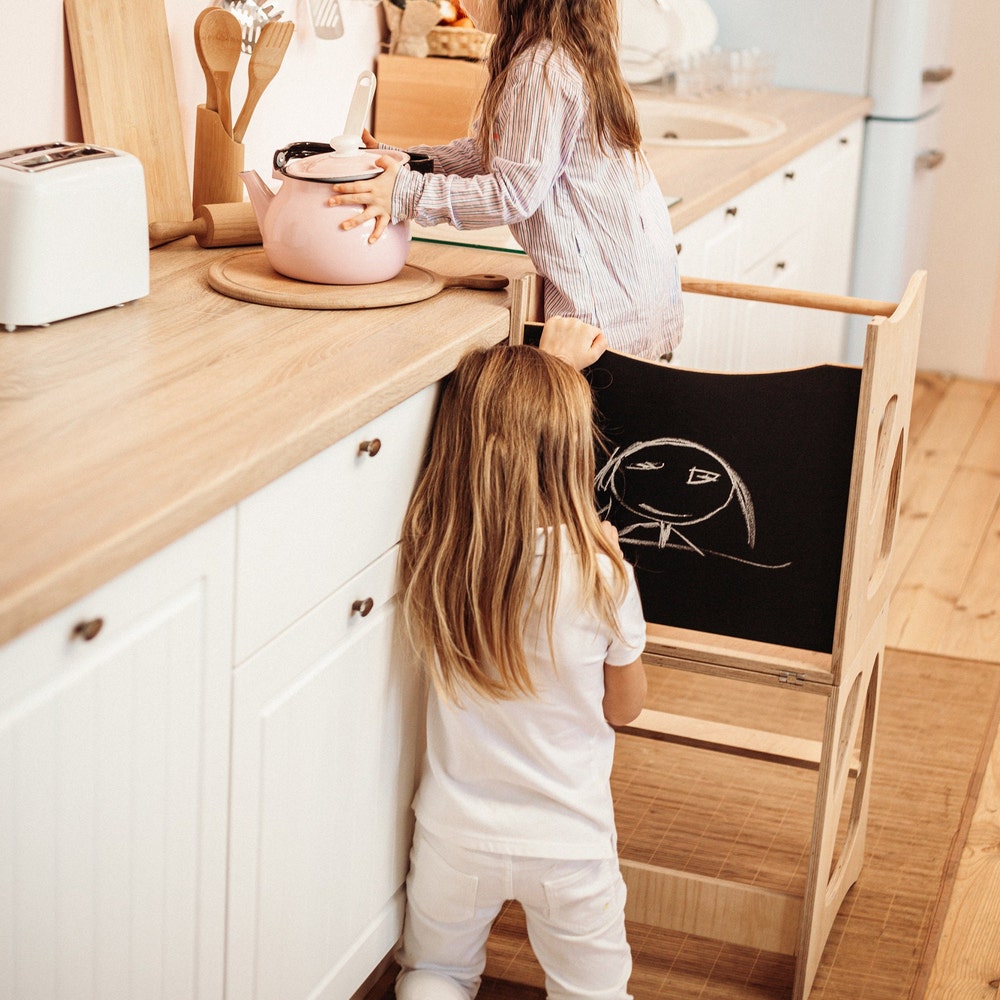 A helper tower, so your child can reach the kitchen counter or tabletops, can easily be transformed into a little chair with a table for play, drawings and other activities.