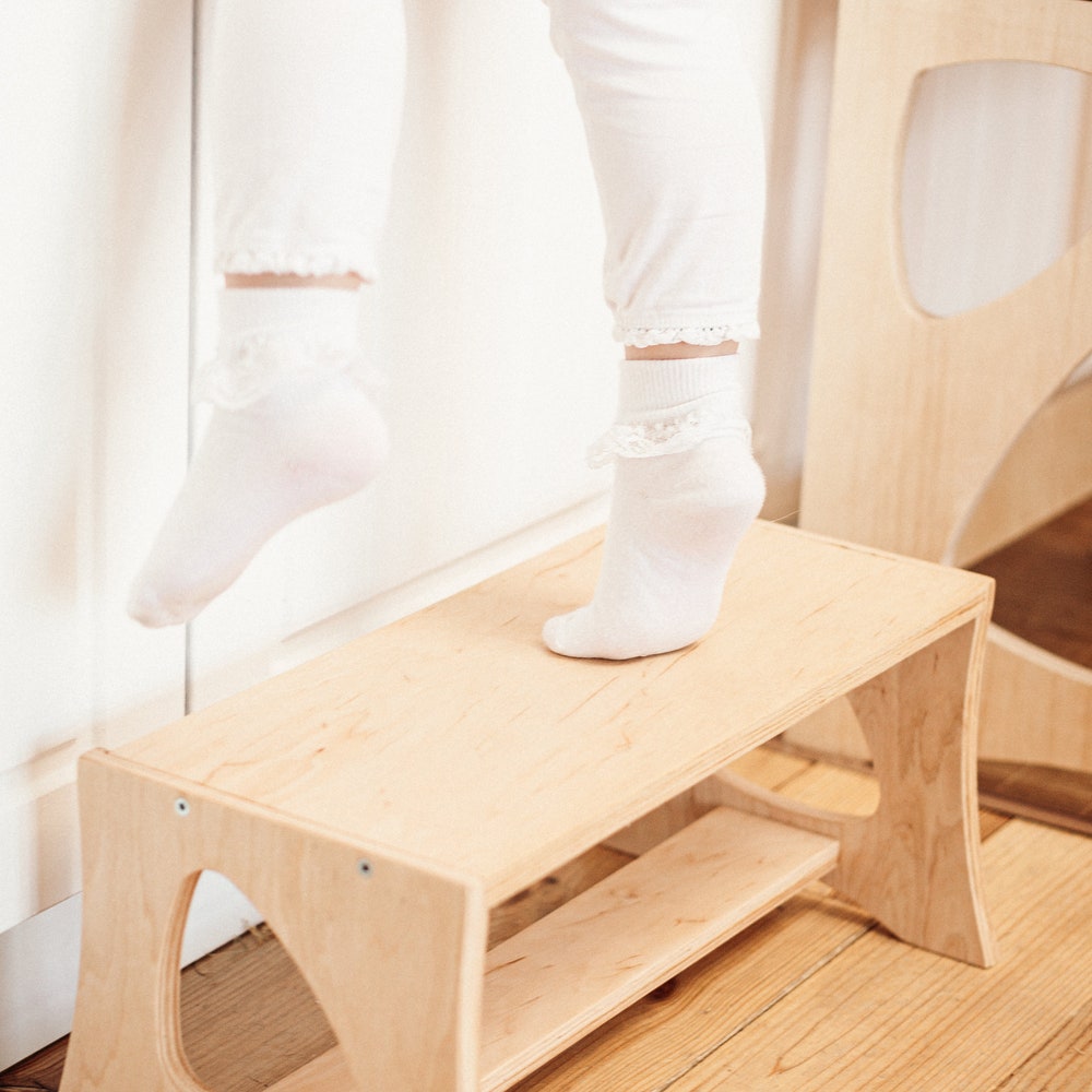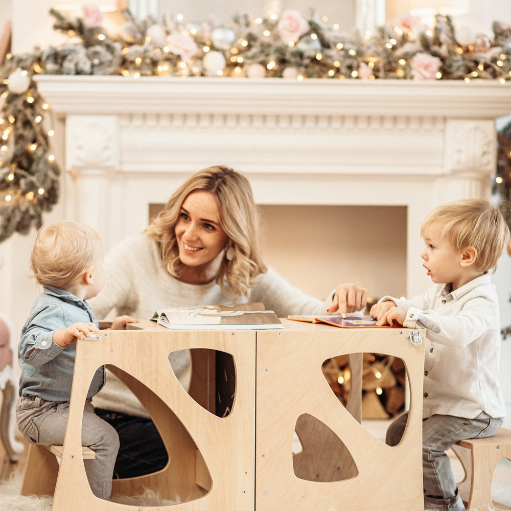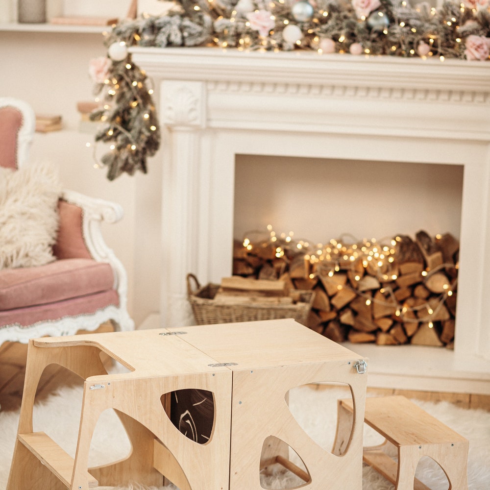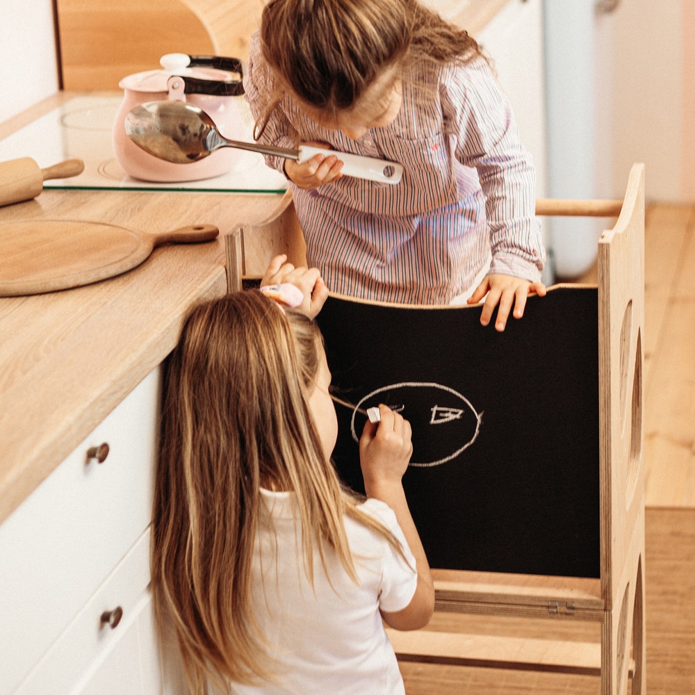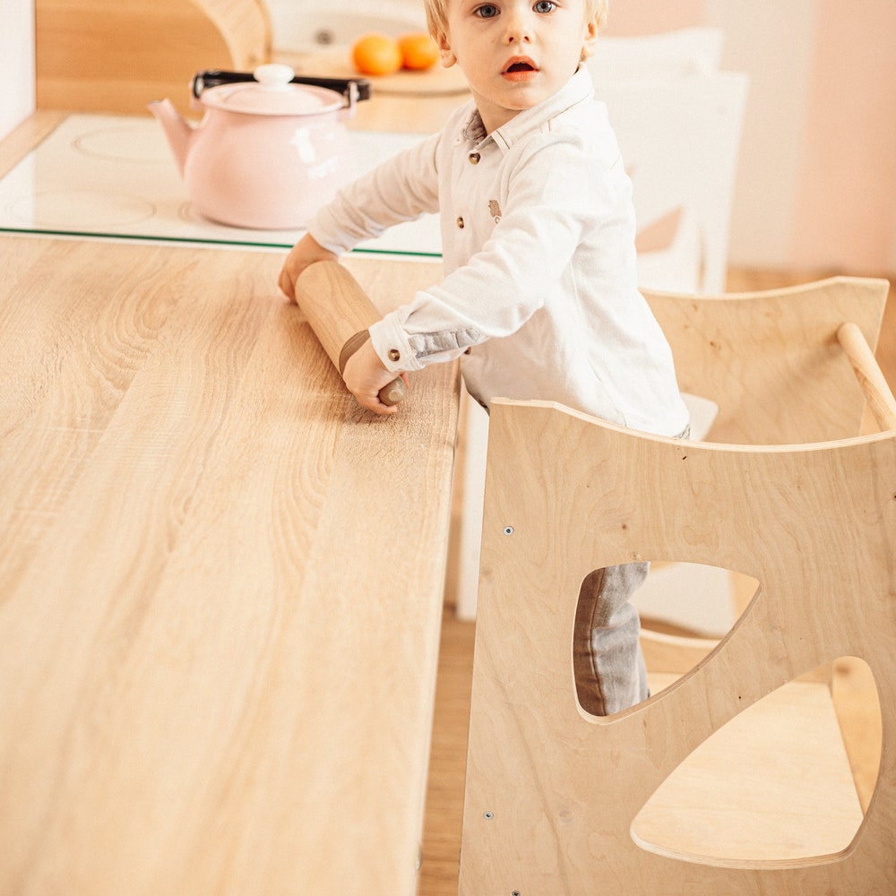 A helper tower, so your child can reach the kitchen counter or tabletops, can easily be transformed into a little chair with a table for play, drawings and other activities.