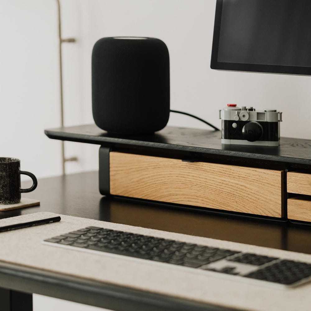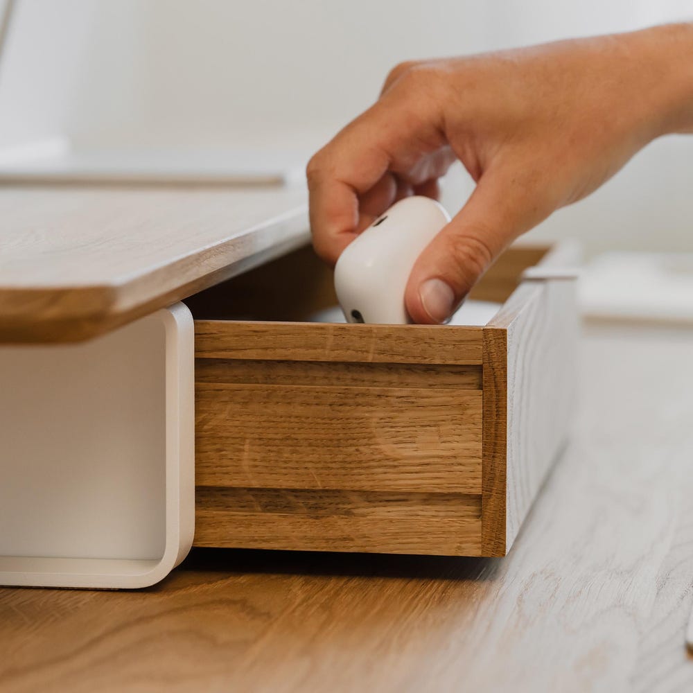 Large modular drawer is an excellent addition to our famous desk shelf. Choose between 4 types of modules and 2 sizes of steel bases which, thanks to their thoughtful design, can be assembled in a variety of ways. Create an organizer that suits your needs and add additional storage to your desk, keeping it stylish and tidy.