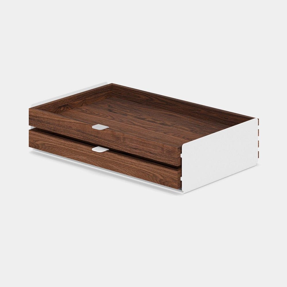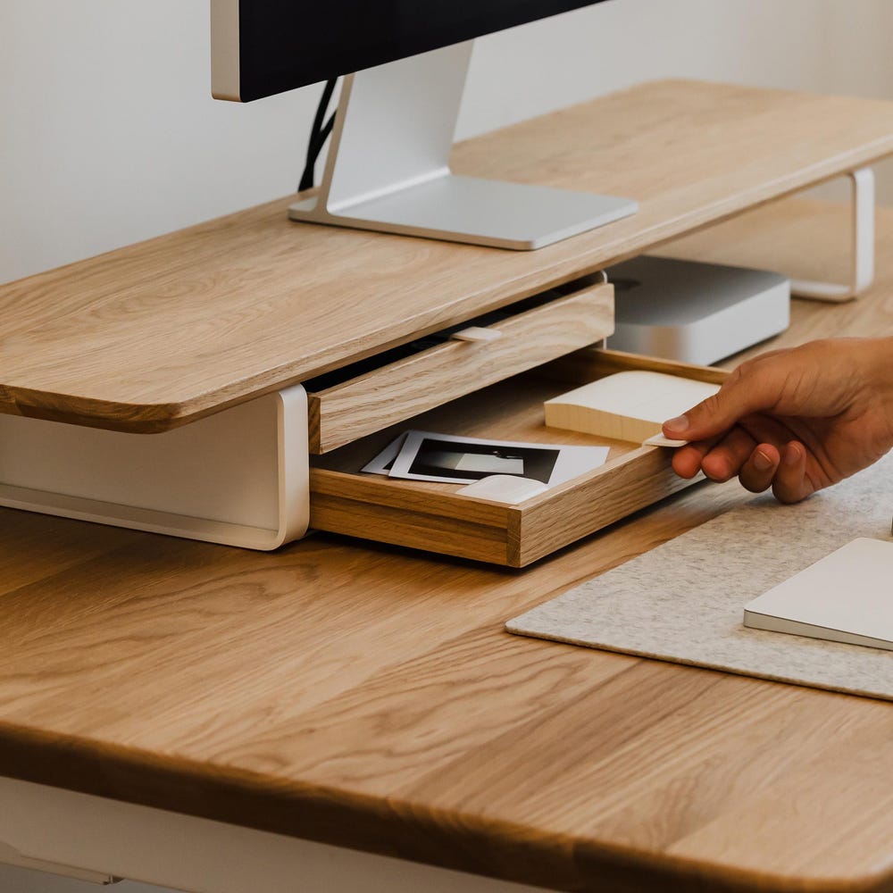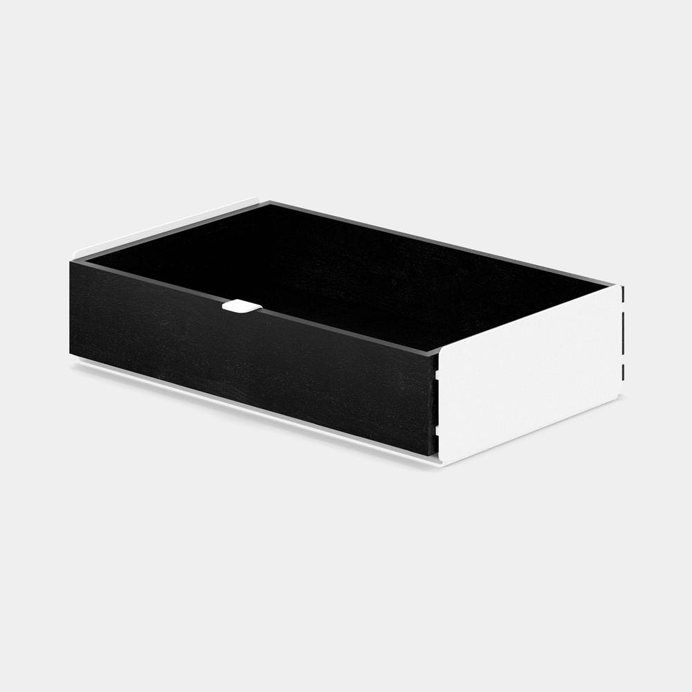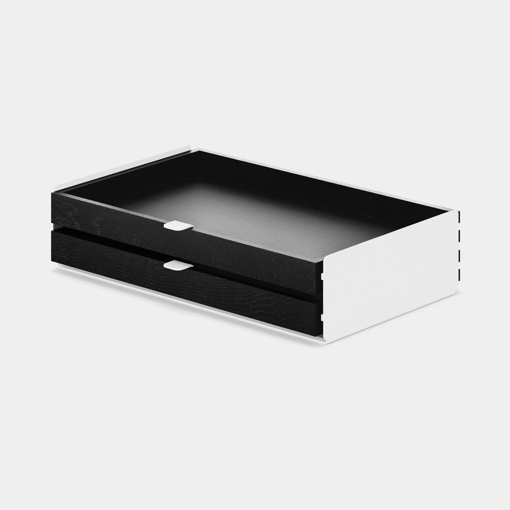 Large modular drawer is an excellent addition to our famous desk shelf. Choose between 4 types of modules and 2 sizes of steel bases which, thanks to their thoughtful design, can be assembled in a variety of ways. Create an organizer that suits your needs and add additional storage to your desk, keeping it stylish and tidy.