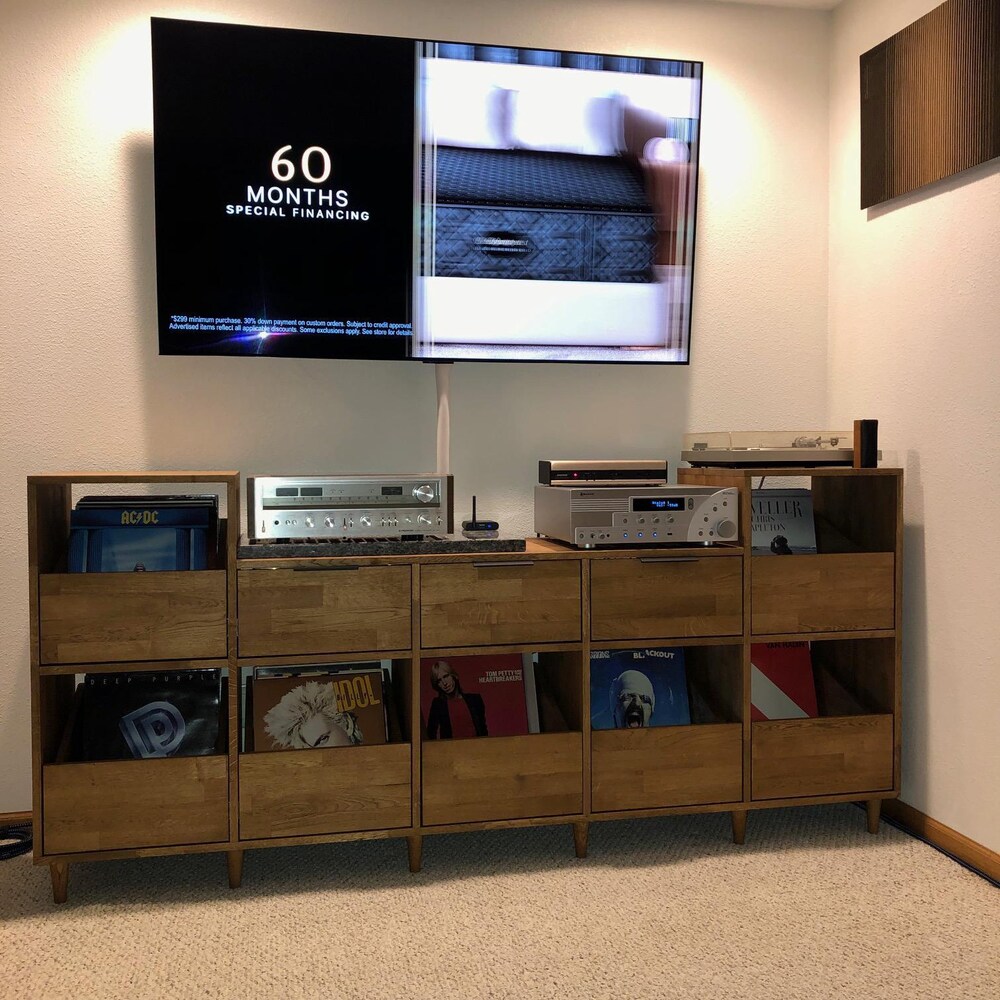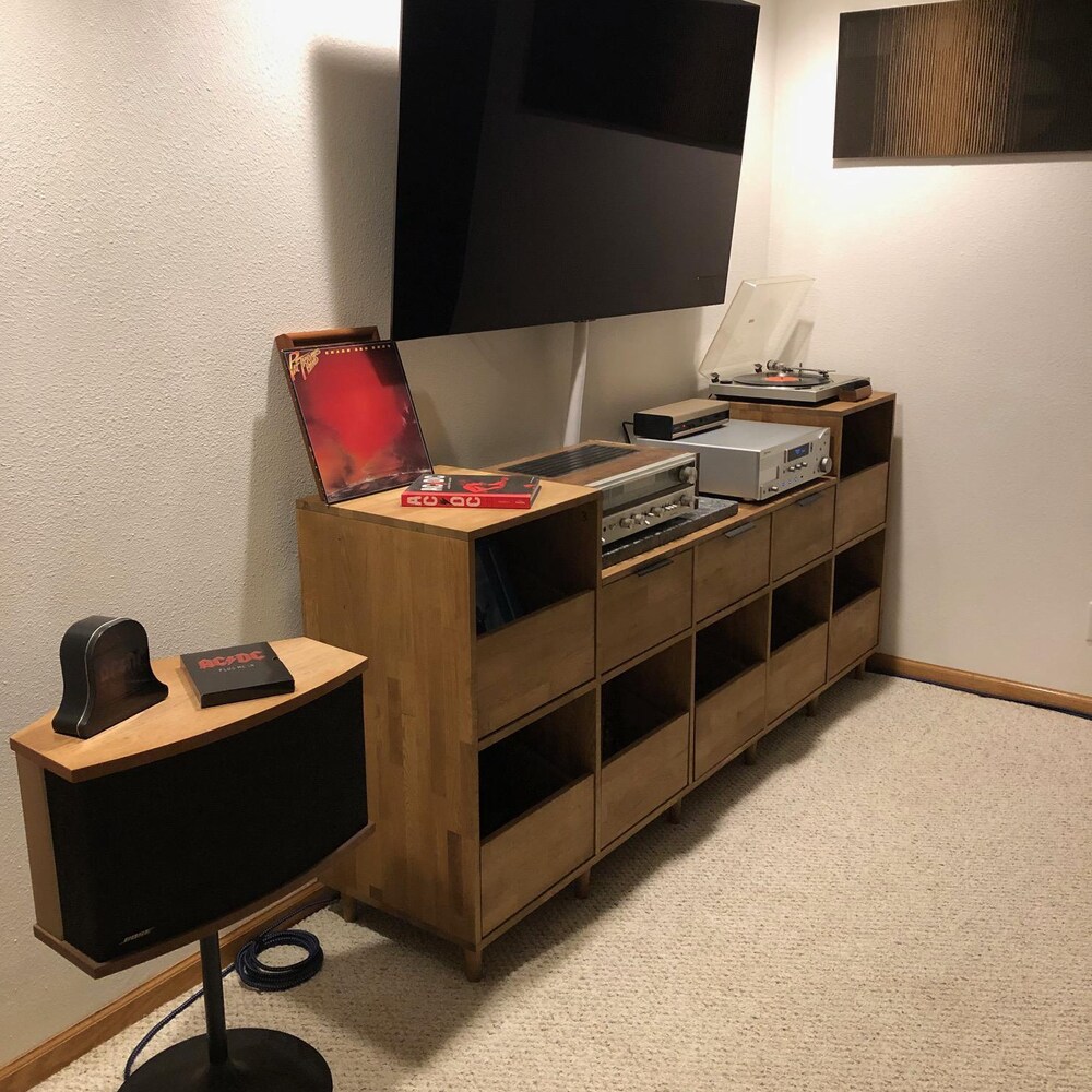 This turntable stand is meticulously crafted from 100% oak wood, showcasing our dedication to craftsmanship. We offer four wood options: pine, oak, walnut, and birch plywood. You can see the wood options and color choices in the photos. We aim to bring quality and elegance to your home by translating our impeccable craftsmanship into furniture.