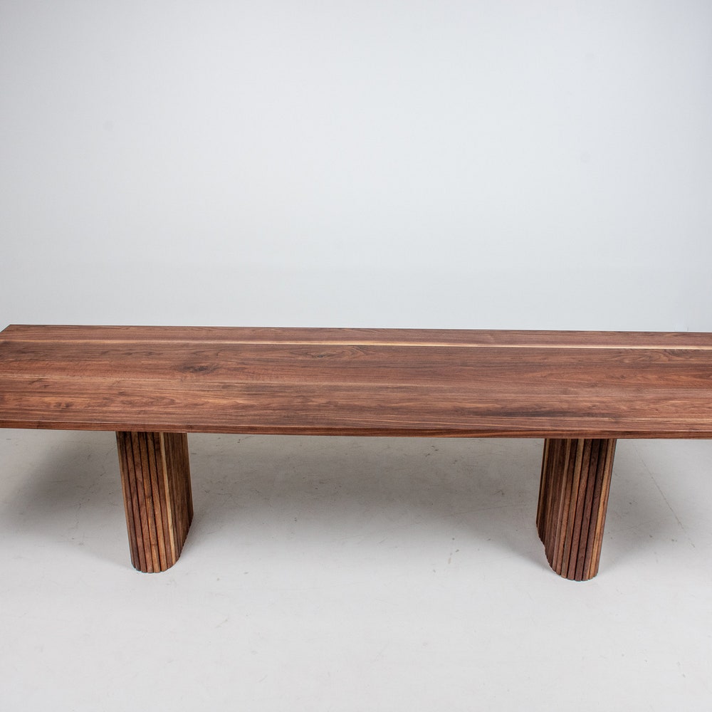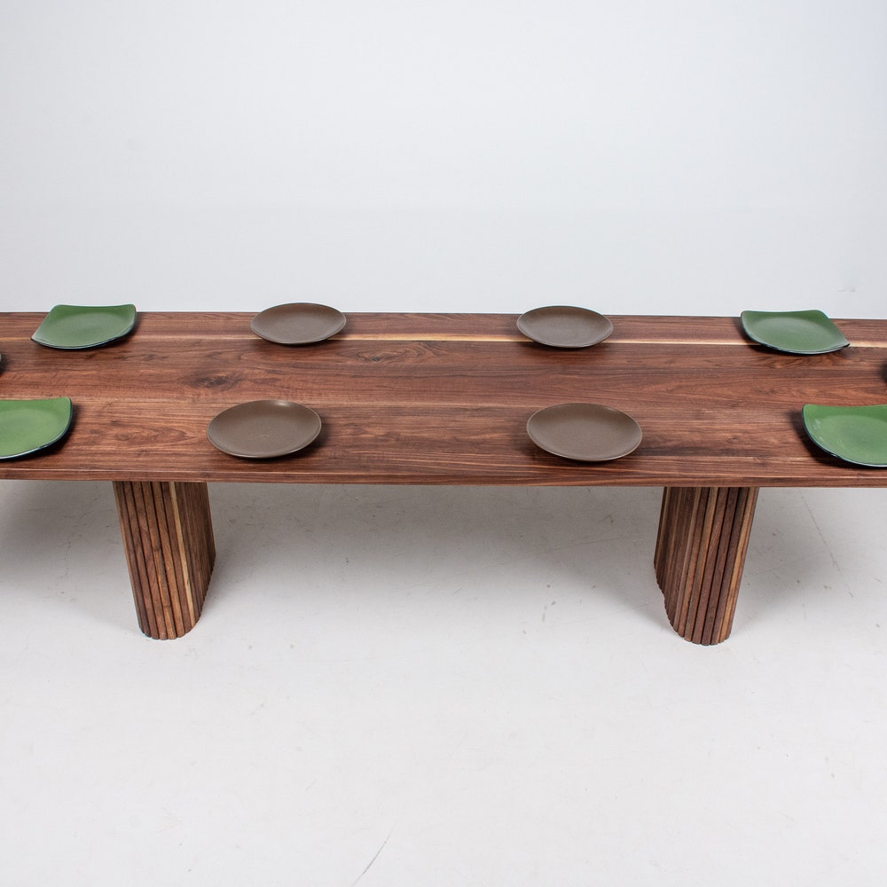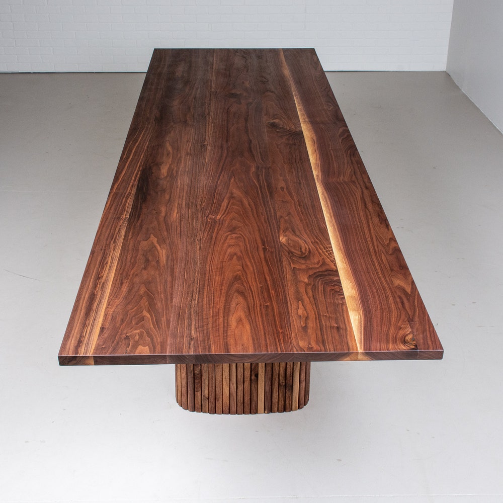 This large walnut table is a show stopper. At 10′ long and sitting on elegant fluted pillar legs, it makes a dramatic centerpiece for your dining room. We build every table to order so there are many ways to make this table perfect for you.