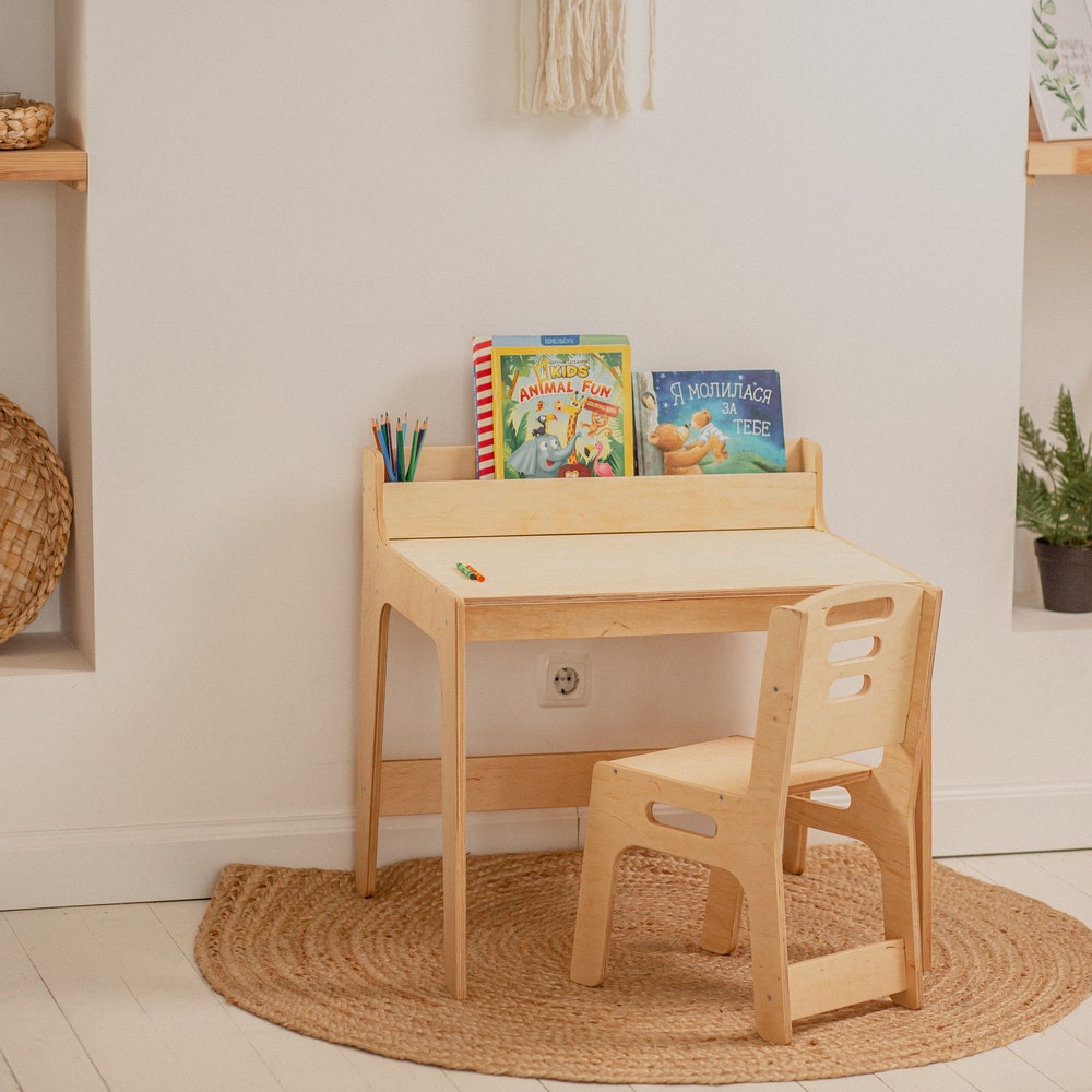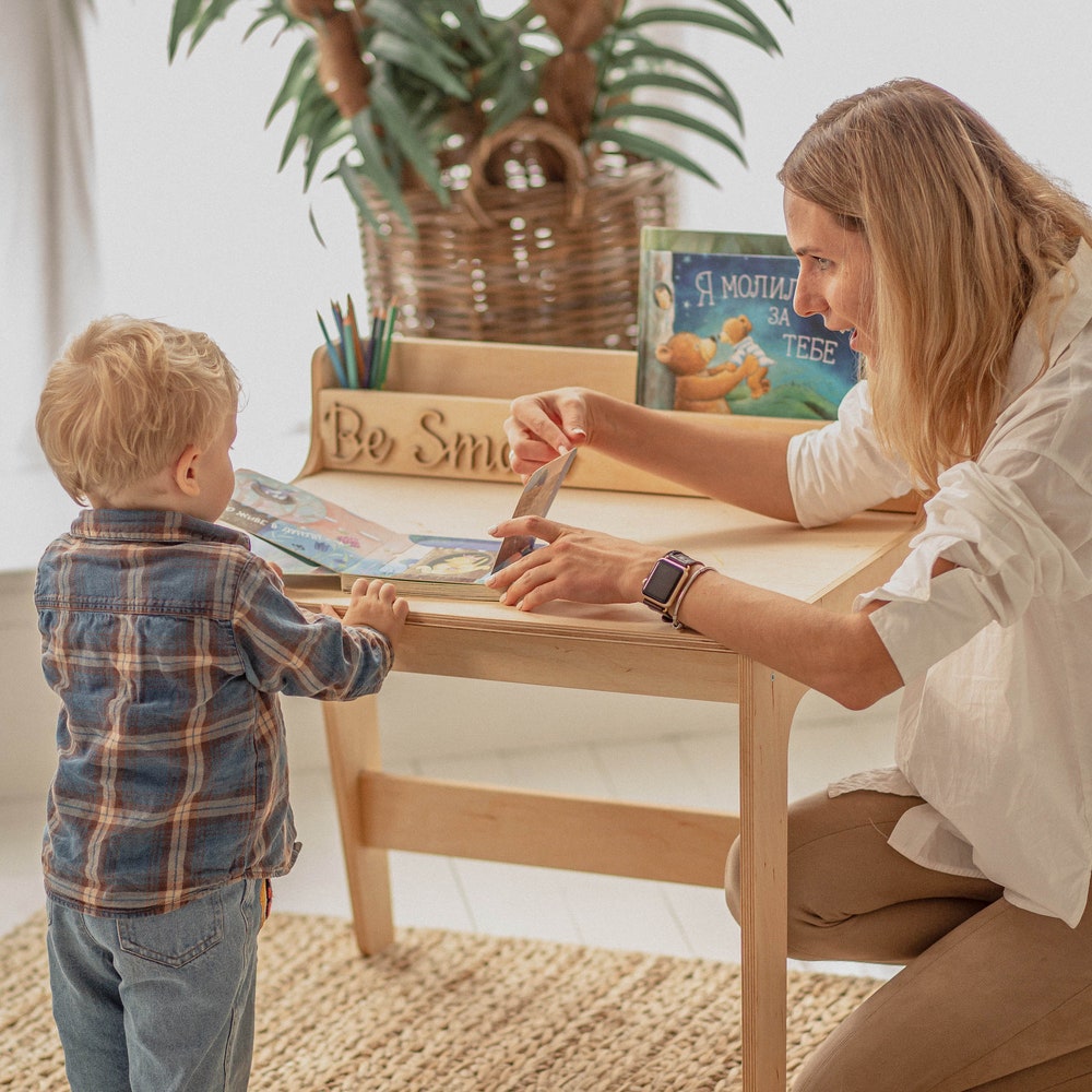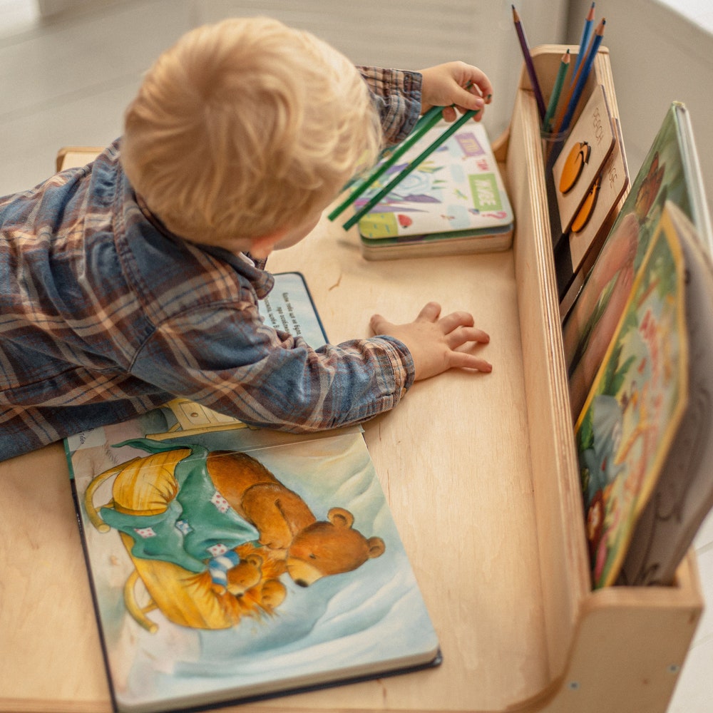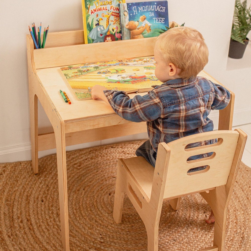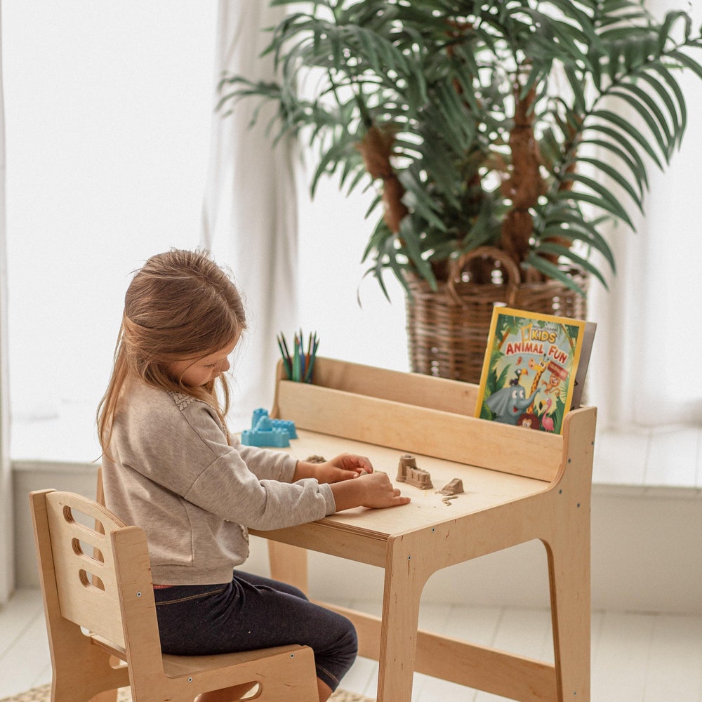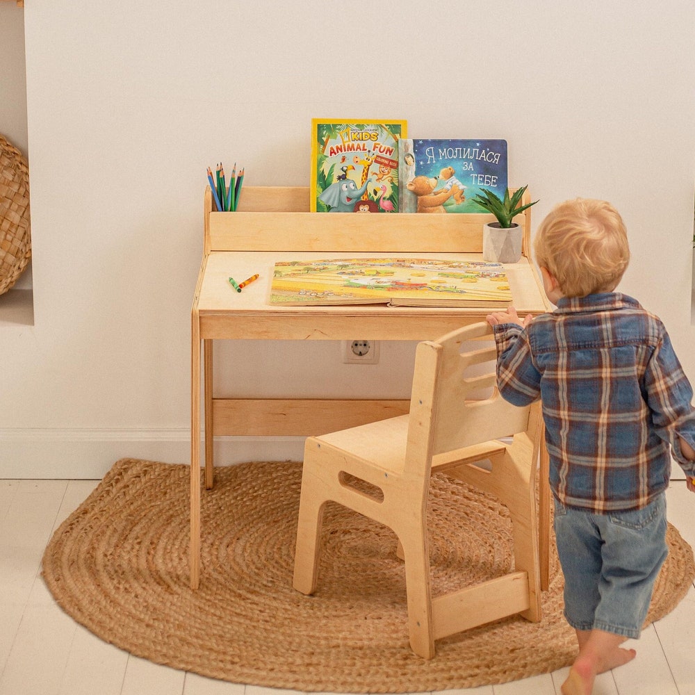 Learning Preschool Desk with Bookshelf for Toddler, Montessori Kids Desk, Activity Table with chair, First day of Preschool gift