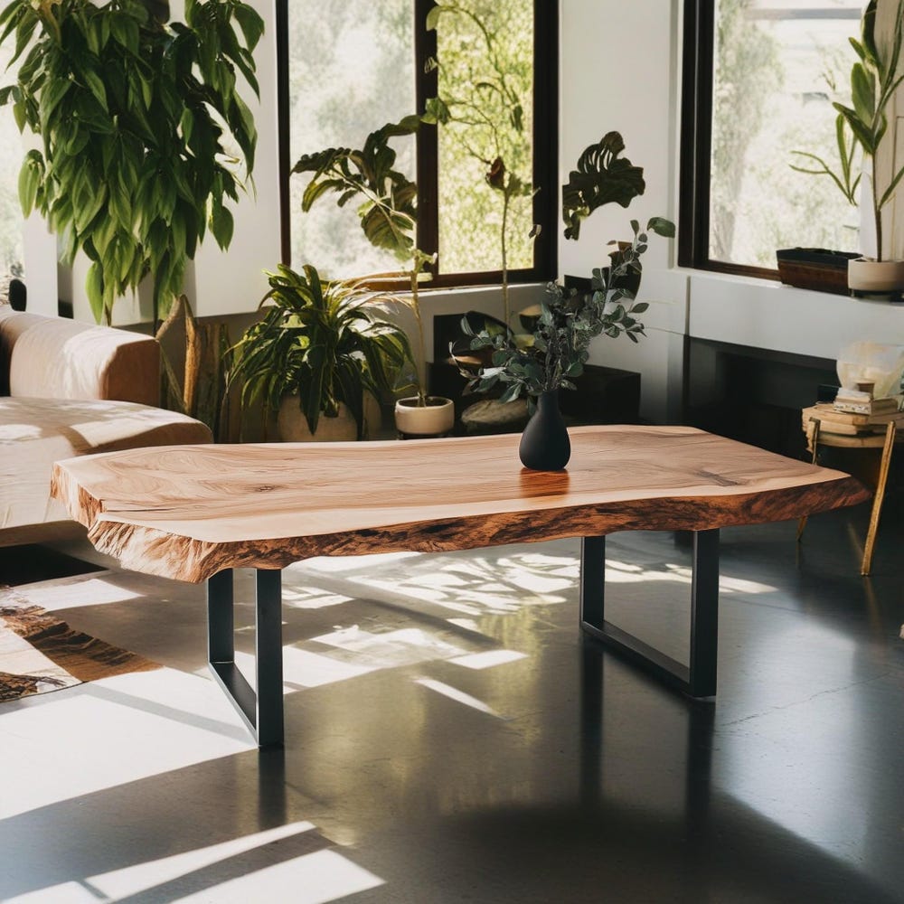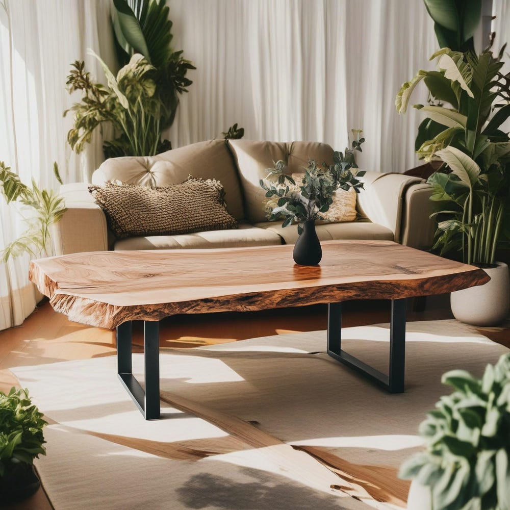 The live edge design highlights the organic lines of the wood, bringing a touch of nature into your living space. Paired with sleek metal legs, this coffee table effortlessly bridges the gap between rustic allure and contemporary style. The contrast between the raw, natural wood and the refined metal legs creates a striking visual harmony, making this table a standout piece in any setting.