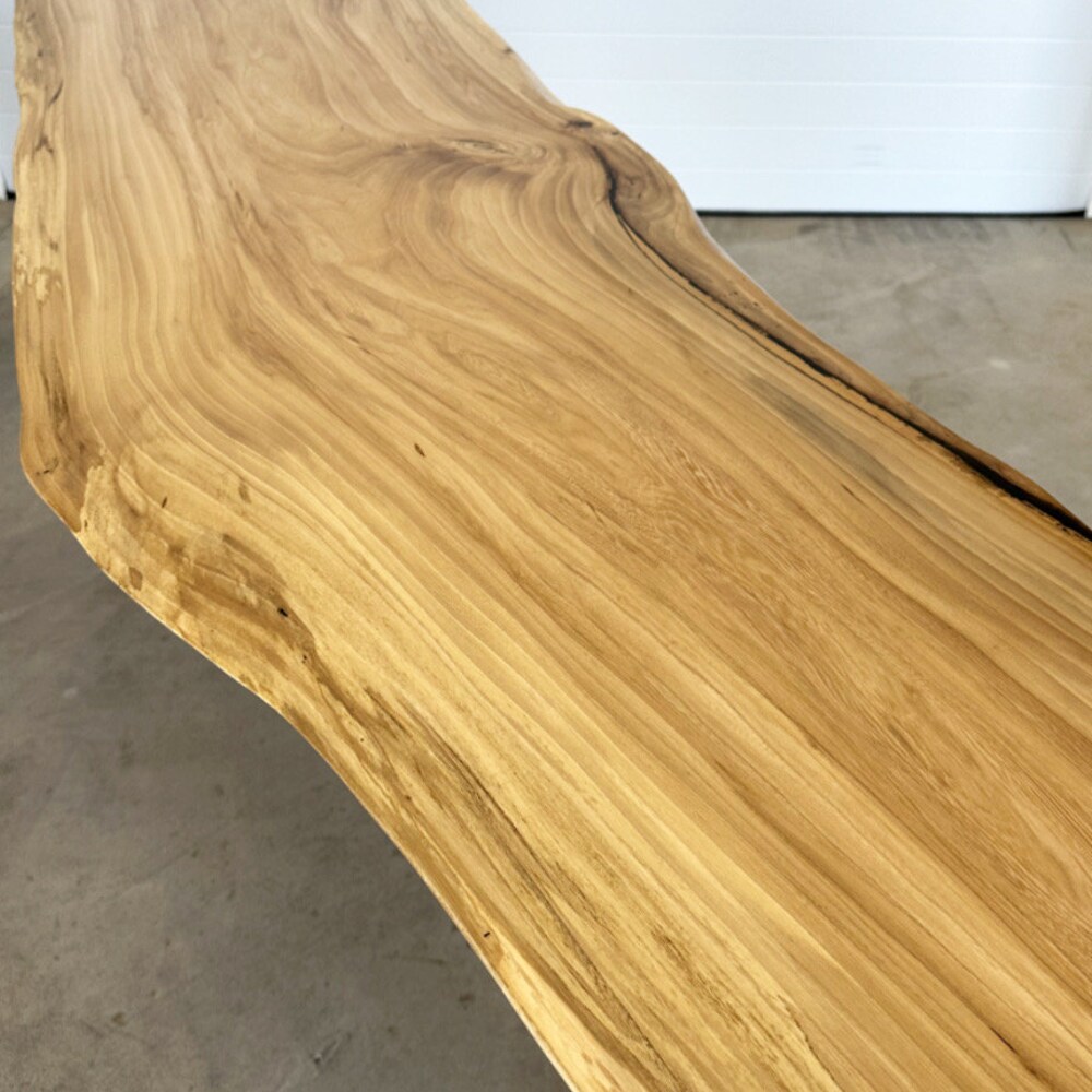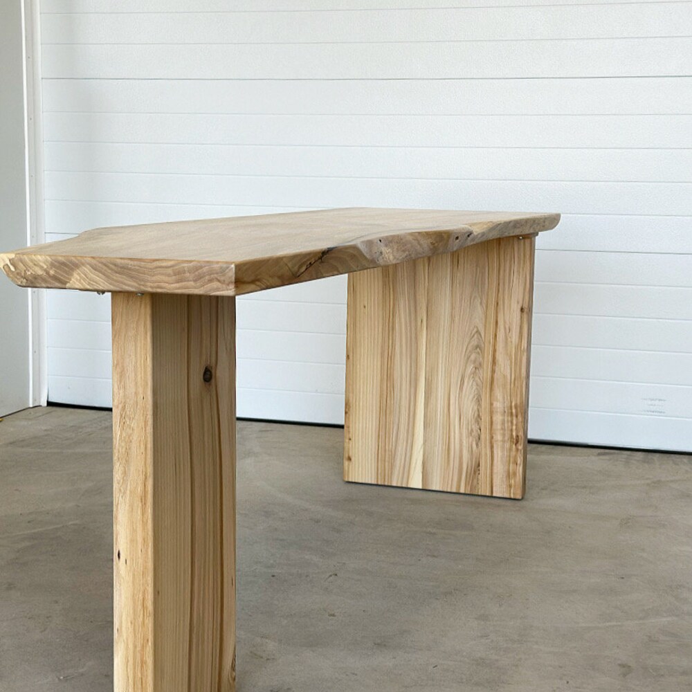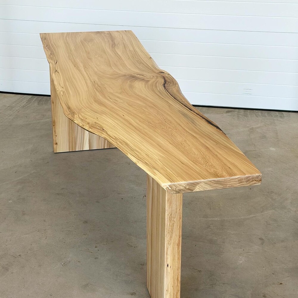 A natural and minimalist silhouette is formed as an Elm slab desktop sits atop softened-edge slab legs, offset for added visual interest.
