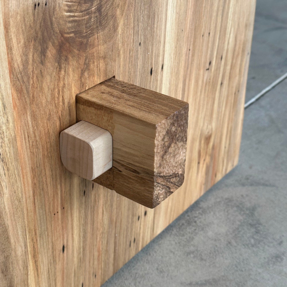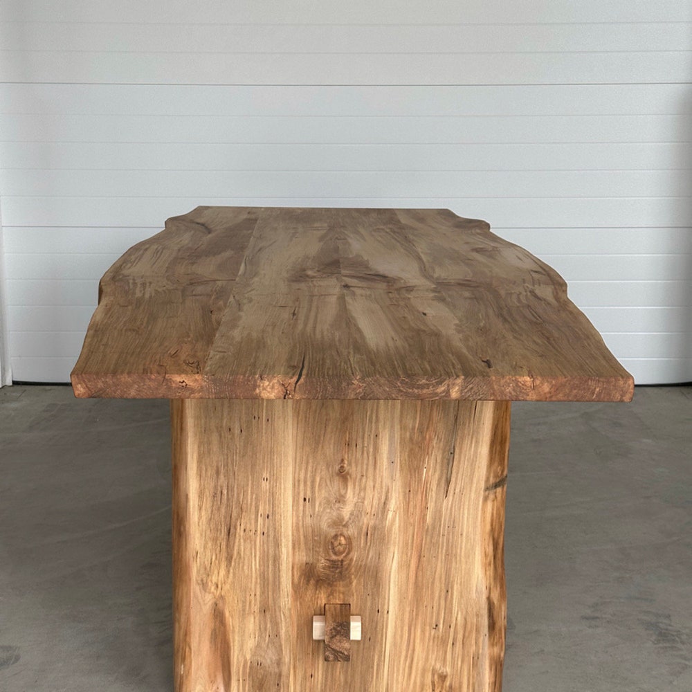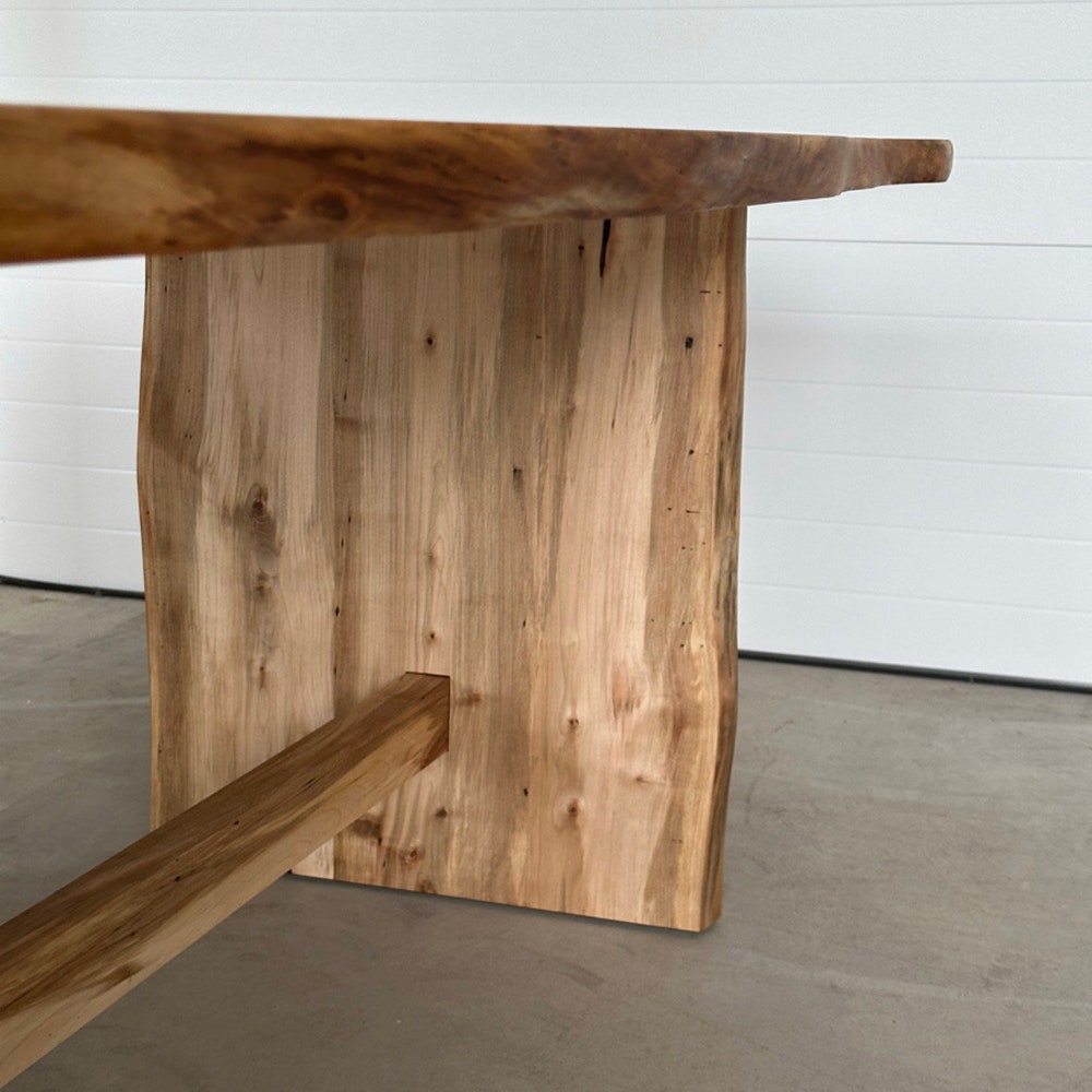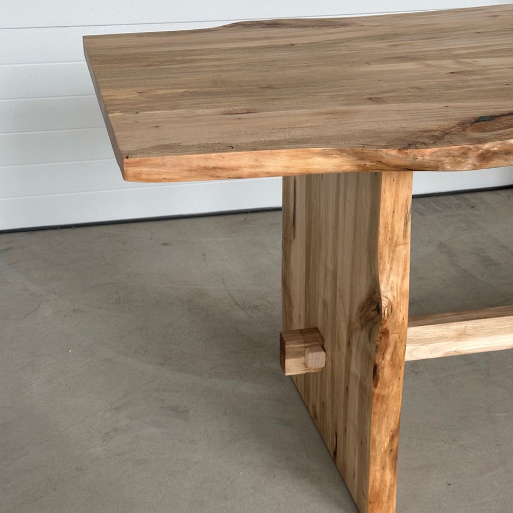 This live edge Maple table is complimented with a slab leg base featuring a double pass-through trestle with dimpled texture around the mortise & tenon, giving it a little flare.