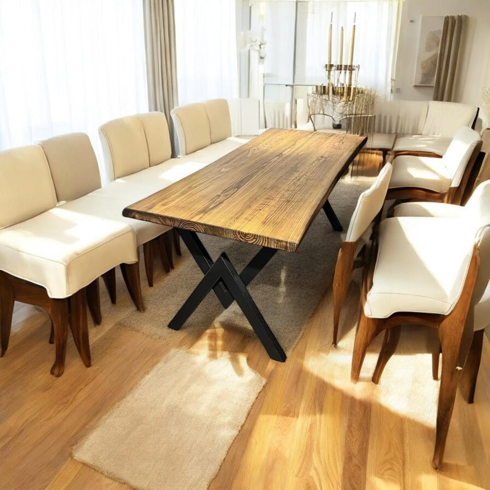 The **natural edge design** celebrates the organic beauty of real wood, while the **modern black X-shaped metal legs** provide strength, contrast, and architectural flair.