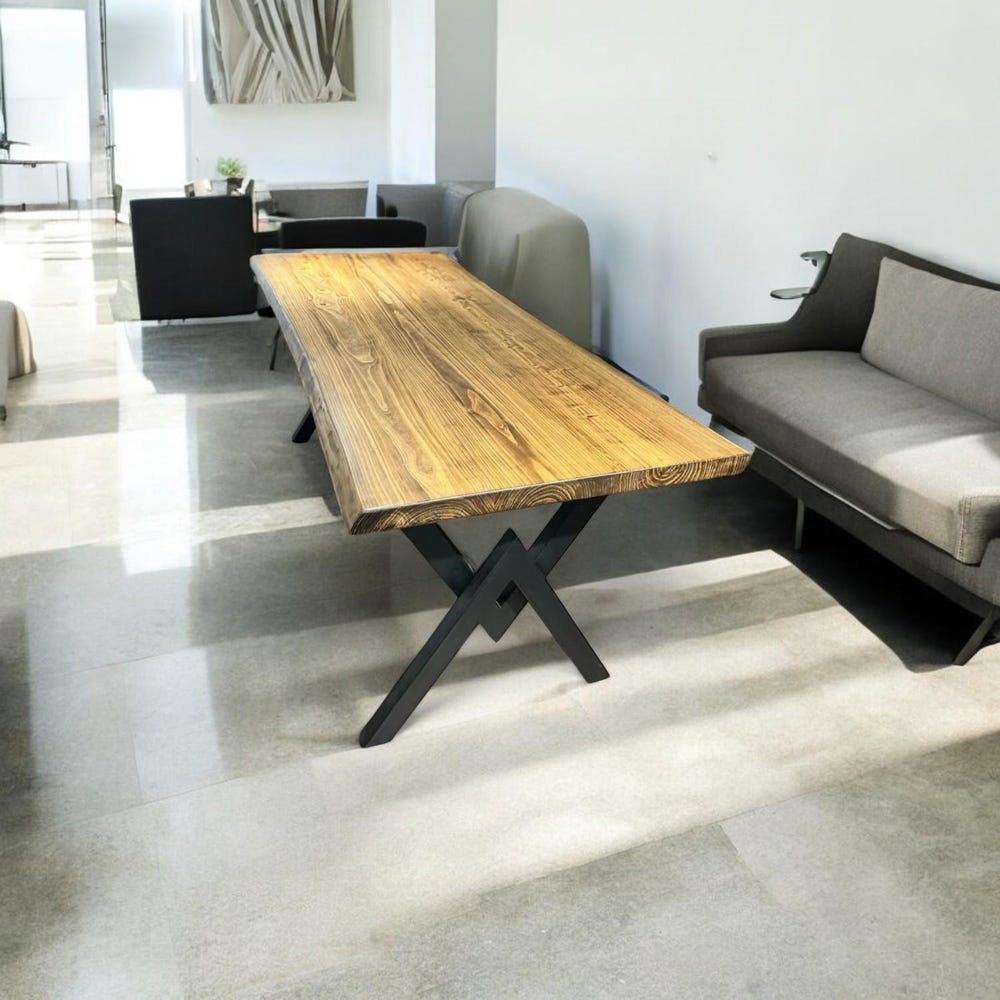– Sturdy **black metal X legs** for modern industrial charm