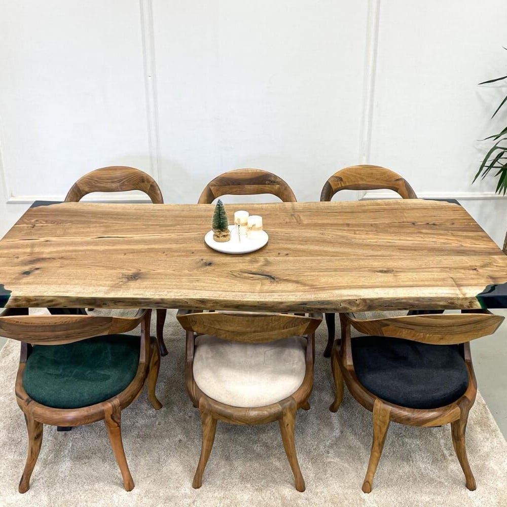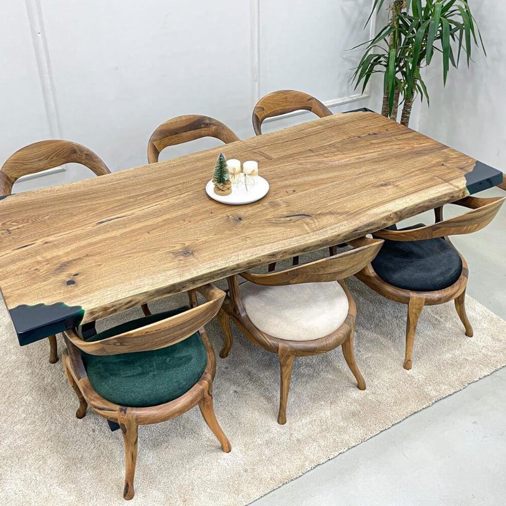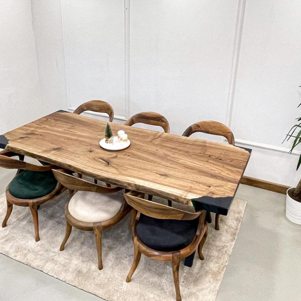 Enhance your dining room with this stunning natural walnut table, complete with epoxy corners and exquisite natural edge details. Handcrafted to perfection, this unique piece brings a touch of elegance to any space. Experience the beauty of live edge design in your home today!