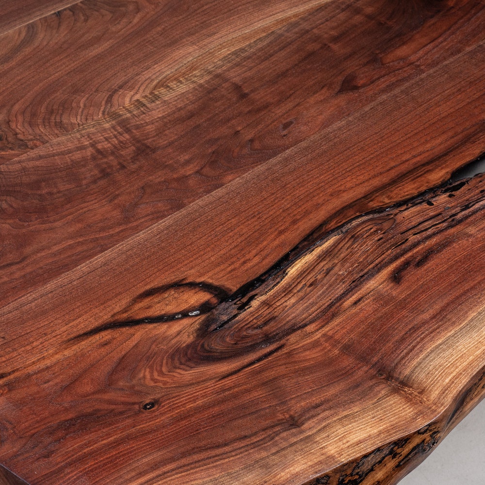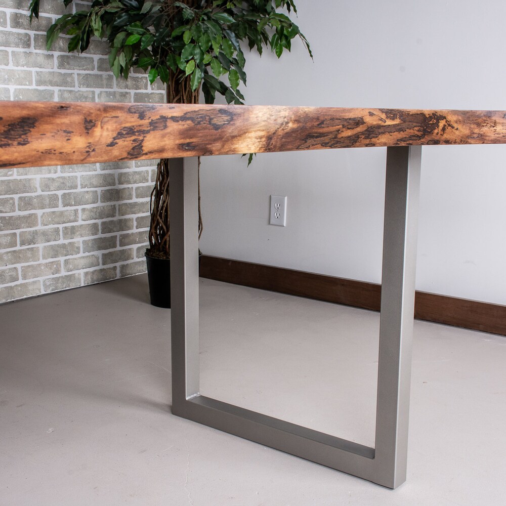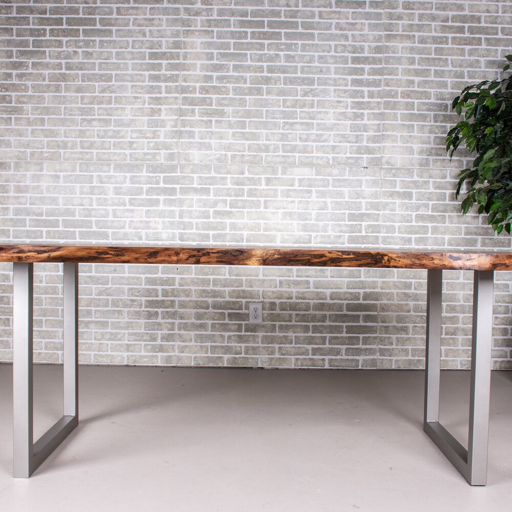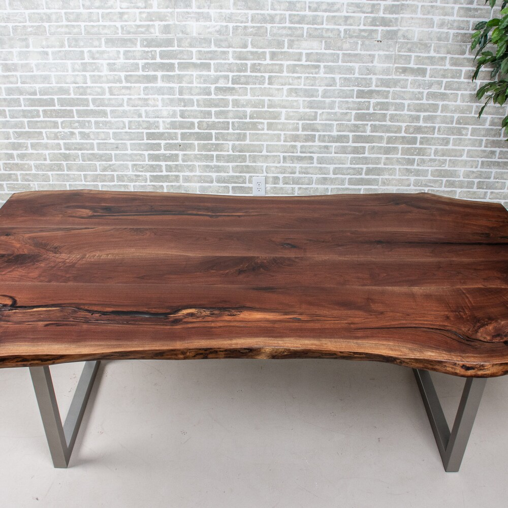 Who can resist the classic good looks of a live edge walnut table on steel legs? For this variation the live edge walnut top has been paired with a pair of square steel legs that have been finished in nickel to give it a modern look. We build every table to order so there are many ways to make this table perfect for you.